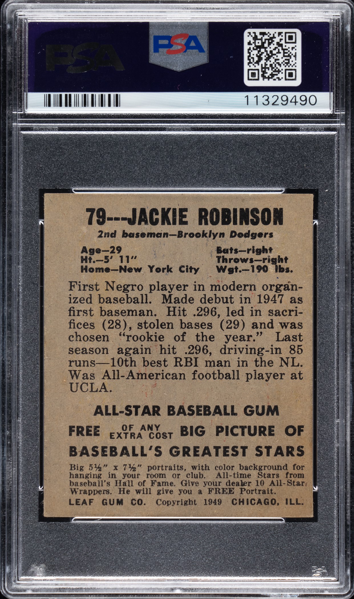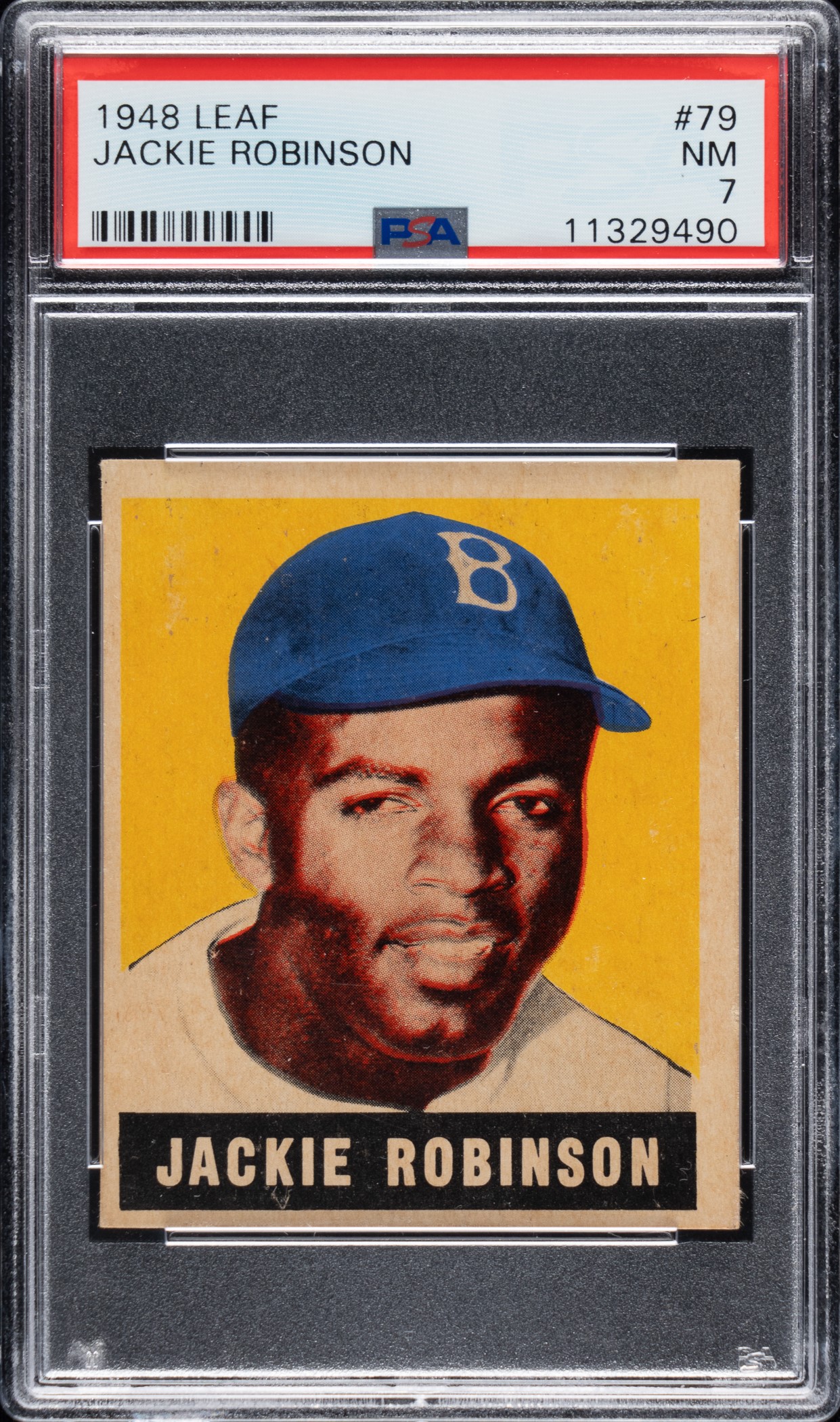 Graded NM 7 by PSA. Outstanding high-grade example of this classic rookie card of Brooklyn Dodgers Hall of Famer Jackie Robinson. The 1948-1949 Leaf card of Robinson is one of the most popular, striking, and classic of all his cards. Leafs are often encountered with many condition problems (excessive toning, general wear from fragile paper stock, soft corners, centering issues, and print lines), and collectors also have to deal with the wildly varying degrees of print quality that characterize the set. It is easy to see why 1948-1949 Leafs are one of the most difficult of all issues to collect in high grade. The offered card is a great rarity in terms of condition and quality for any Leaf, let alone Jackie Robinson, one of the key Hall of Famers in the set. This example features brilliant colors, a crisp image, and strong corners. The reverse is clean with bold black text. This is a tremendous high-grade example of one of the icons of postwar Hall of Fame card collecting, and, in the eyes of many, Jackie Robinson's single most desirable baseball card. This classic card has always been a favorite with collectors and is rarely found in such remarkable high grade. Opening Bid $25,000.