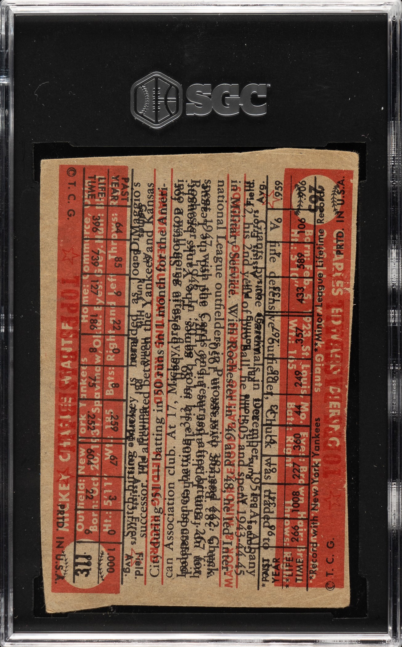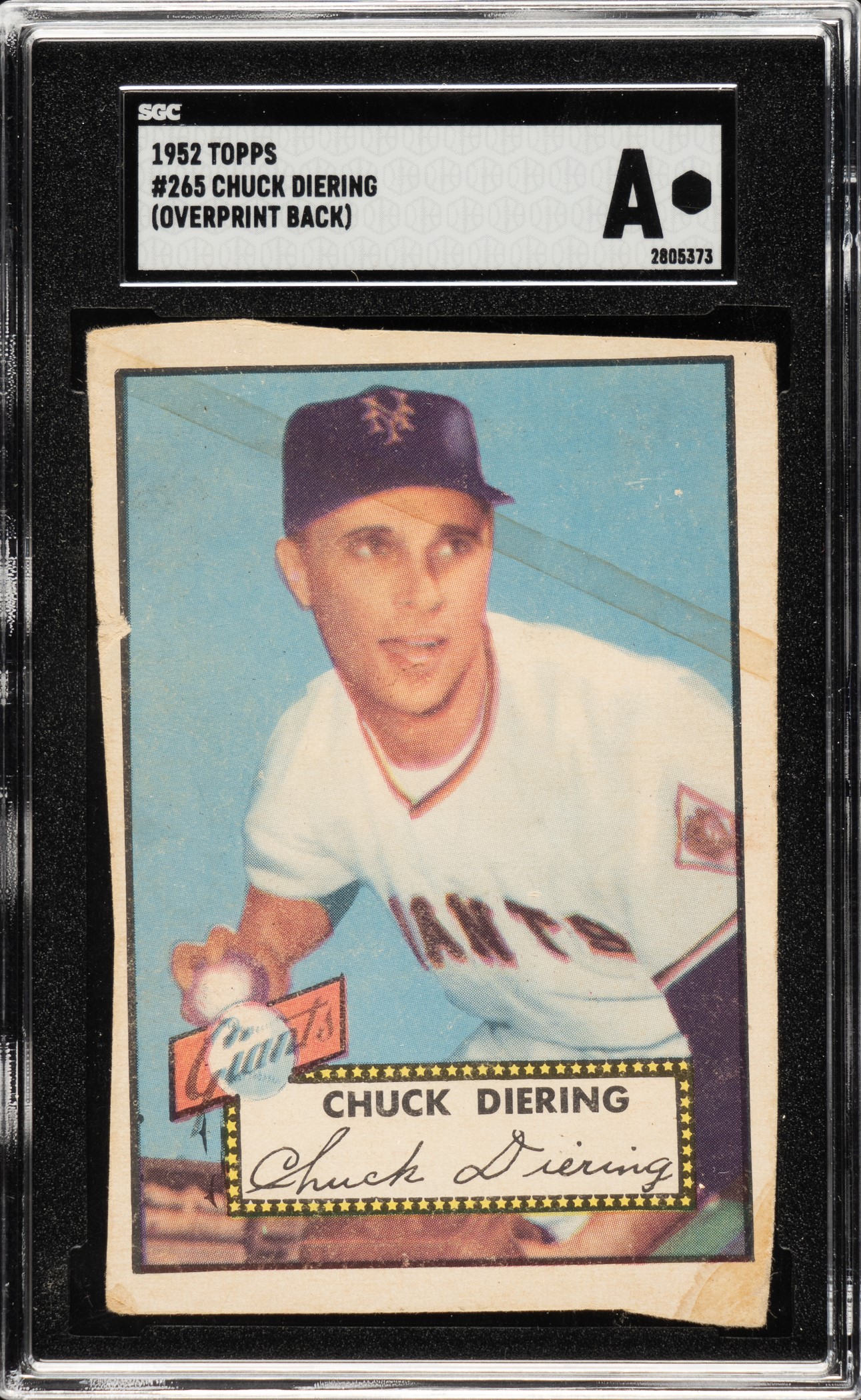 Presented is a fascinating, distinctive, and almost certainly unique printing anomaly of Chuck Diering (#265) from the 1952 Topps set featuring an overprint of card #311 Mickey Mantle on the reverse. This unusual card is particularly interesting as it is double-printed on the reverse. This is a fascinating printing error that was apparently used to test the presses or created in error, discarded as scrap, and amazingly wound up being preserved for seventy years. With 1952 Topps, quality control was so strong that printing anomalies of this kind are extremely rare and are even more rarely seen with such a striking and dramatic difference to normally seen cards. As expected, the card displays an irregular hand cut on all four sides, light creasing, and a discoloration on the front. The reverse is clean. Encapsulated by SGC as "Authentic." This is a very rare 1952 Topps printing oddity, which would be a worthy addition to any 1952 Topps, Mickey Mantle, or postwar-baseball collection. Opening Bid $1,000.