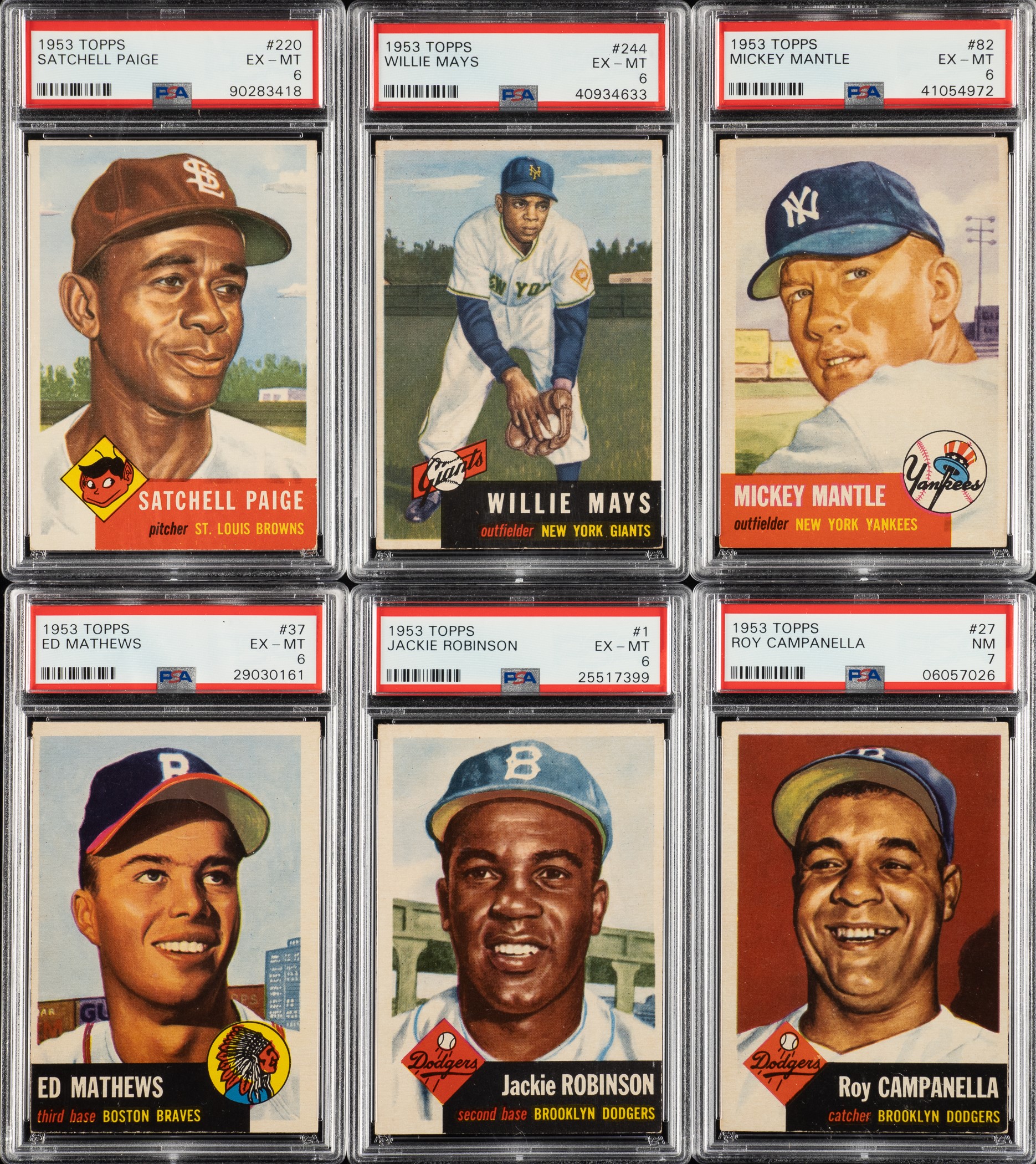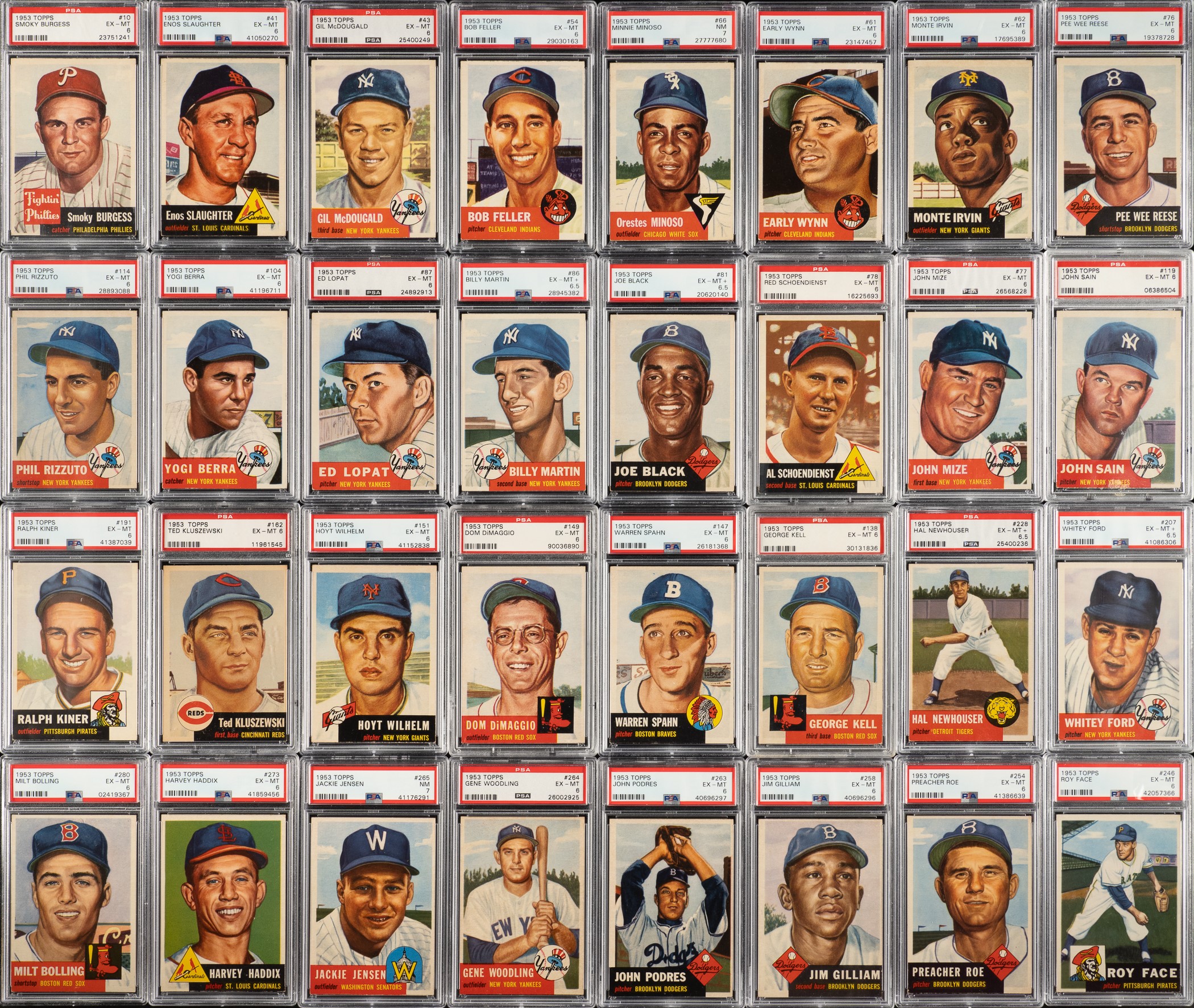 The 1953 Topps set has always been one of the most popular sets of the 1950s. Presented is an extremely consistent complete set of this classic issue composed of 274 different cards, each professionally graded and encapsulated by PSA. This group of cards displays a striking appearance throughout with bold colors, strong corners, and excellent centering. 1953 Topps is one of the most popular and collected of all 1950s gum issues and one of the most significant of all postwar baseball card issues. PSA Grading Composite: NM 7 (13 cards): #21, 23, 27 Campanella, 66 Minoso, 102, 155, 183, 245, 250, 260, 265 Jensen SP, 266, and 277. EX-MT+ 6.5 (15 cards): #13, 55, 60, 81 Black SP, 84, 86 Martin SP, 121, 185, 204, 207 Ford, 211, 226, 228 Newhouser, 270, and 279. EX-MT 6 (246 cards): Including #1 Robinson, 10 Burgess SP, 37 Mathews, 41 Slaughter, 43 McDougald SP, 54 Feller, 61 Wynn SP, 62 Irvin, 76 Reese, 77 Mize, 78 Schoendienst, 82 Mantle, 87 Lopat SP, 104 Berra, 114 Rizzuto, 119 Sain SP, 138 Kell, 147 Spahn, 149 D. DiMaggio, 151 Wilhelm SP, 162 Kluszewski SP, 191 Kiner, 207 Ford, 220 Paige, 244 Mays, 246 Face RC, 254 Roe, 258 Gilliam RC, 263 Podres RC SP, 264 Woodling, 273 Haddix RC SP, and 280 Bolling RC SP. The flush-to-the-bottom-border design of the 1953 Topps set makes this issue particularly susceptible to edge and corner wear, and makes the assembly of high-grade sets all the more difficult. This is an exceptional high-quality complete set of 1953 Topps, far above average for this issue, with tremendous eye appeal across the board. The total SMR value in the assigned grades (factoring in the fifteen half-grades at the lower whole-grade level) is $47,965. Total: 274 cards. The size/weight of this item requires that there will be an additional shipping charge for this lot. Opening Bid $10,000.