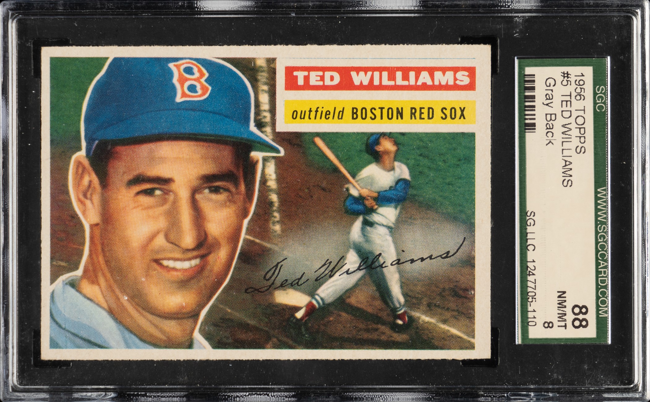 Graded NM/MT 88 by SGC. High-grade example of this classic 1950s baseball card featuring Boston Red Sox Hall of Famer Ted Williams, one of the game's most popular inductees in Cooperstown. The offered example displays bold colors, a crisp image, and strong corners. The gray back is clean and boldly printed. A beautiful high-grade example of 1956 Topps #5 Ted Williams. Opening Bid $500.