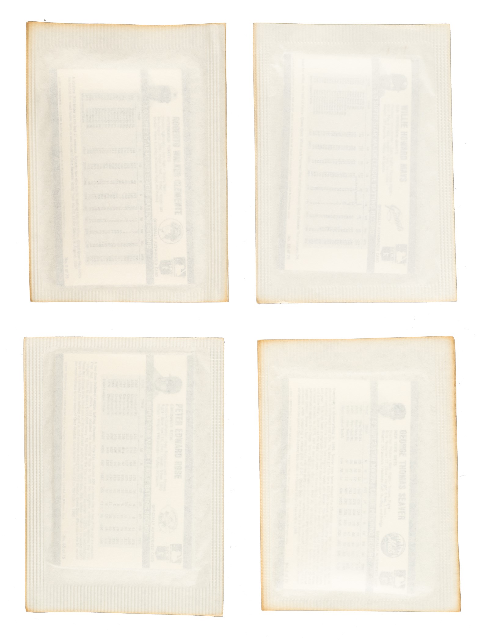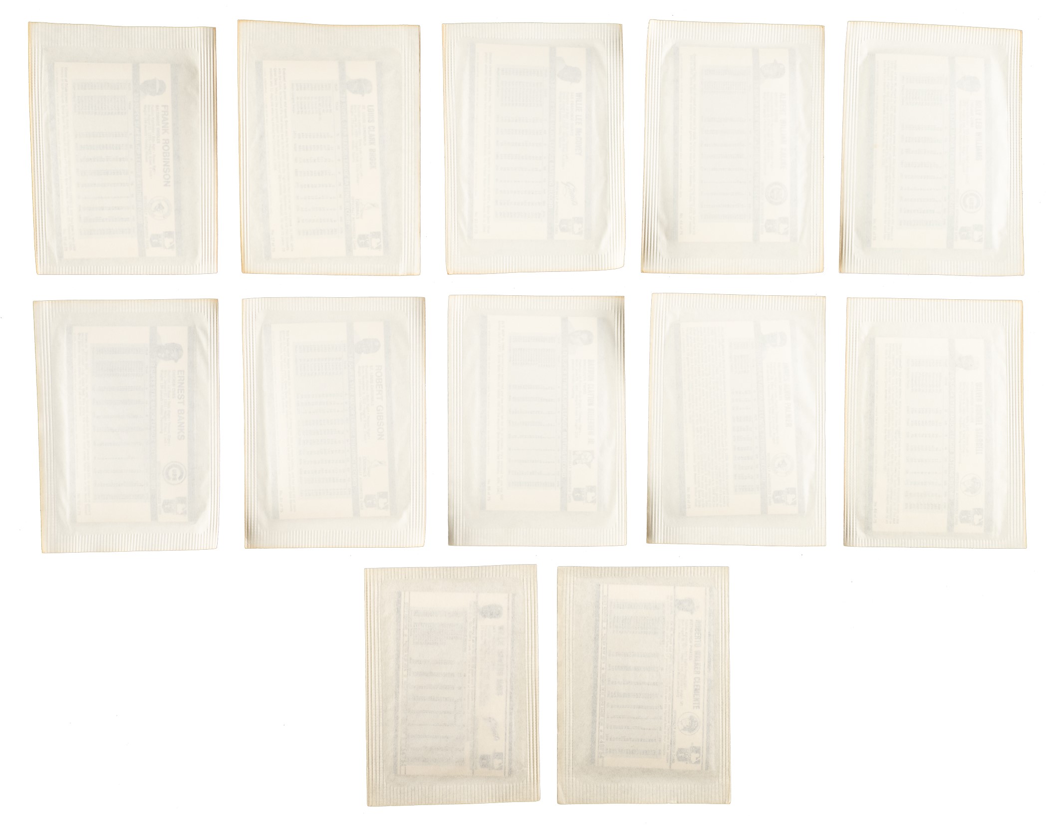 Throughout the 1970s and early 1980s, the Kellogg's cereal company was the only true competition for Topps in the baseball-card market. The 1971 issue, offered here, represents the second year that Kellogg's included baseball cards in cereal boxes, and is well known for its three-dimensional design. The 1971 set is by far the key year for a Kellogg's baseball collection, as this was the only year that collectors were not offered the opportunity to order a complete set directly from Kellogg's. The only way to have assembled a 1971 Kellogg's set was to buy countless boxes of cereal, which included only one card per box. These sets have always been of great interest to collectors as they offer affordable alternatives to standard-issue Topps cards of the many Hall of Famers and stars included in each set. An impressive nineteen Hall of Famers are featured throughout this set, including Tom Seaver, Roberto Clemente, Willie Mays, Ernie Banks, as well as the many other stars of the day. Each card, which measures 2-1/4 x 3-1/2 inches, is still sealed in its original paper wrapper as issued in boxes of Kellogg's cereal. Many of the wrappers display light toning along the edges. A complete set in unopened form is extremely rare! Also included are two 1972 Kellogg's cards featuring Clemente and Mays, still sealed in their original paper wrapper. Total: 77 cards in unopened wrappers (complete 75-card set of 1971 and two 1972). Opening Bid $300.