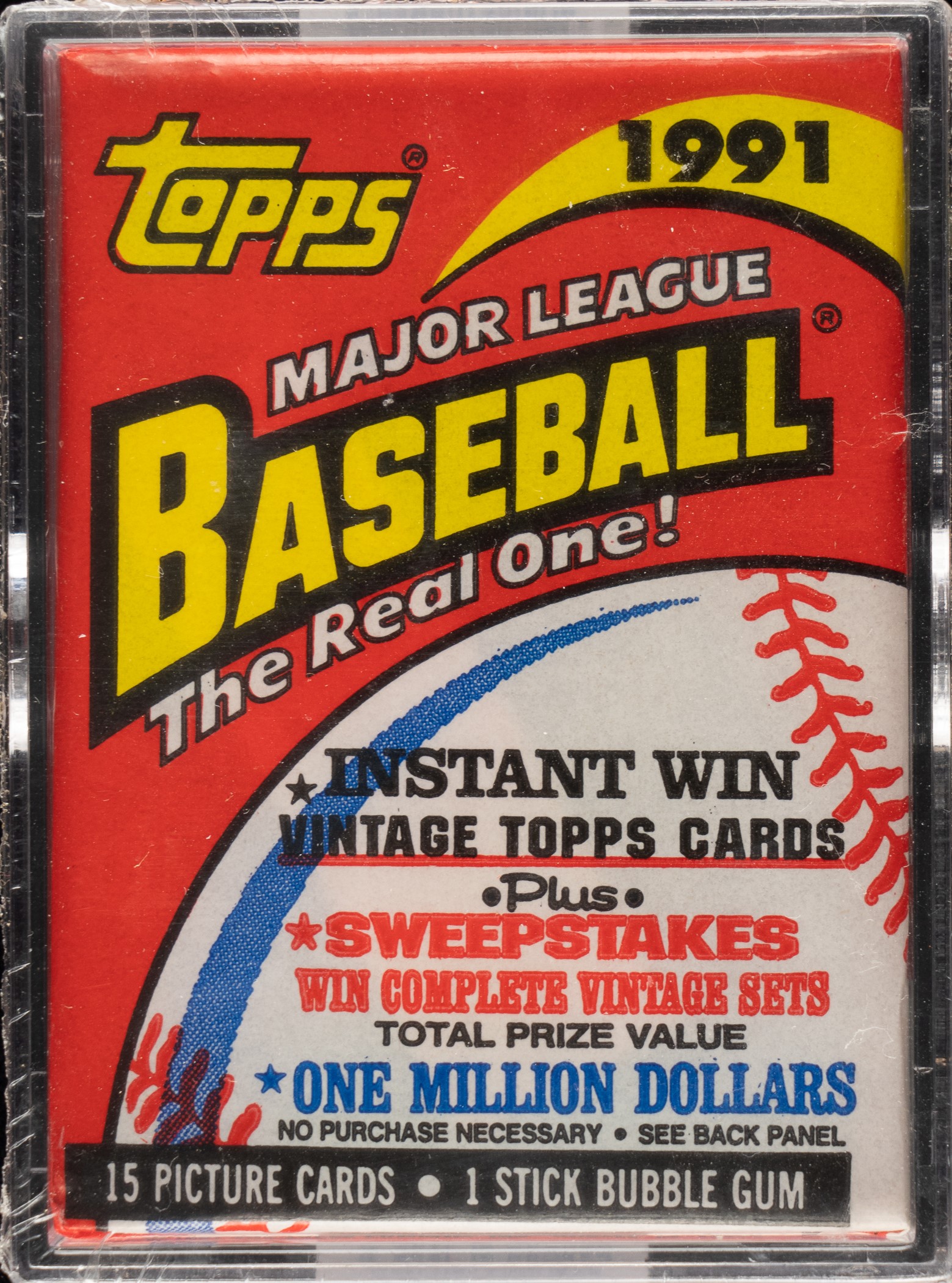 Extremely rare unopened wax pack of 1991 Topps Desert Shield containing fifteen cards. Topps produced the 1991 Desert Shield set at the same time it produced its regular set in 1991 but with the special purpose of distributing the cards to members of the military stationed in the Middle East as part of Operation Desert Shield. The cards, differentiated from regular-issue cards by a gold foil stamp on the card front, caused quite a frenzy upon their release (reportedly limited to 6,500 sets) as cards were scattered across the world, but many did wind up in the hands of collectors. Their low print run compared to other sets of this era and their unique historical significance has made the set very popular with collectors to this day. The set is noted for the inclusion of Chipper Jones' rookie card, along with desirable examples of many Hall of Famers and stars, including Cal Ripken, Nolan Ryan, and Ken Griffey Jr. Crisp, clean unopened wax pack displaying a beautiful full-color wrapper and a tight seal. The pack comes shrink-wrapped by Baseball Card Exchange (owned by Steve Hart, the foremost expert on unopened material). This is an incredible and extremely rare unopened wax pack from this highly sought-after and historically significant modern set. Opening Bid $200.