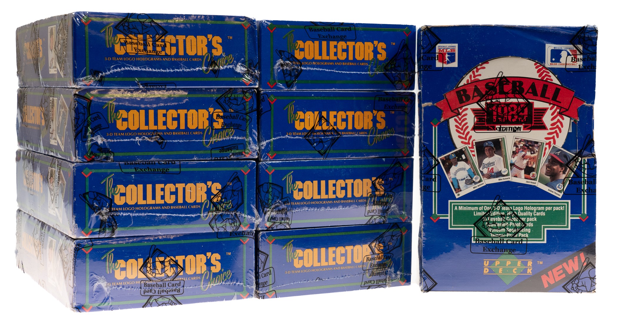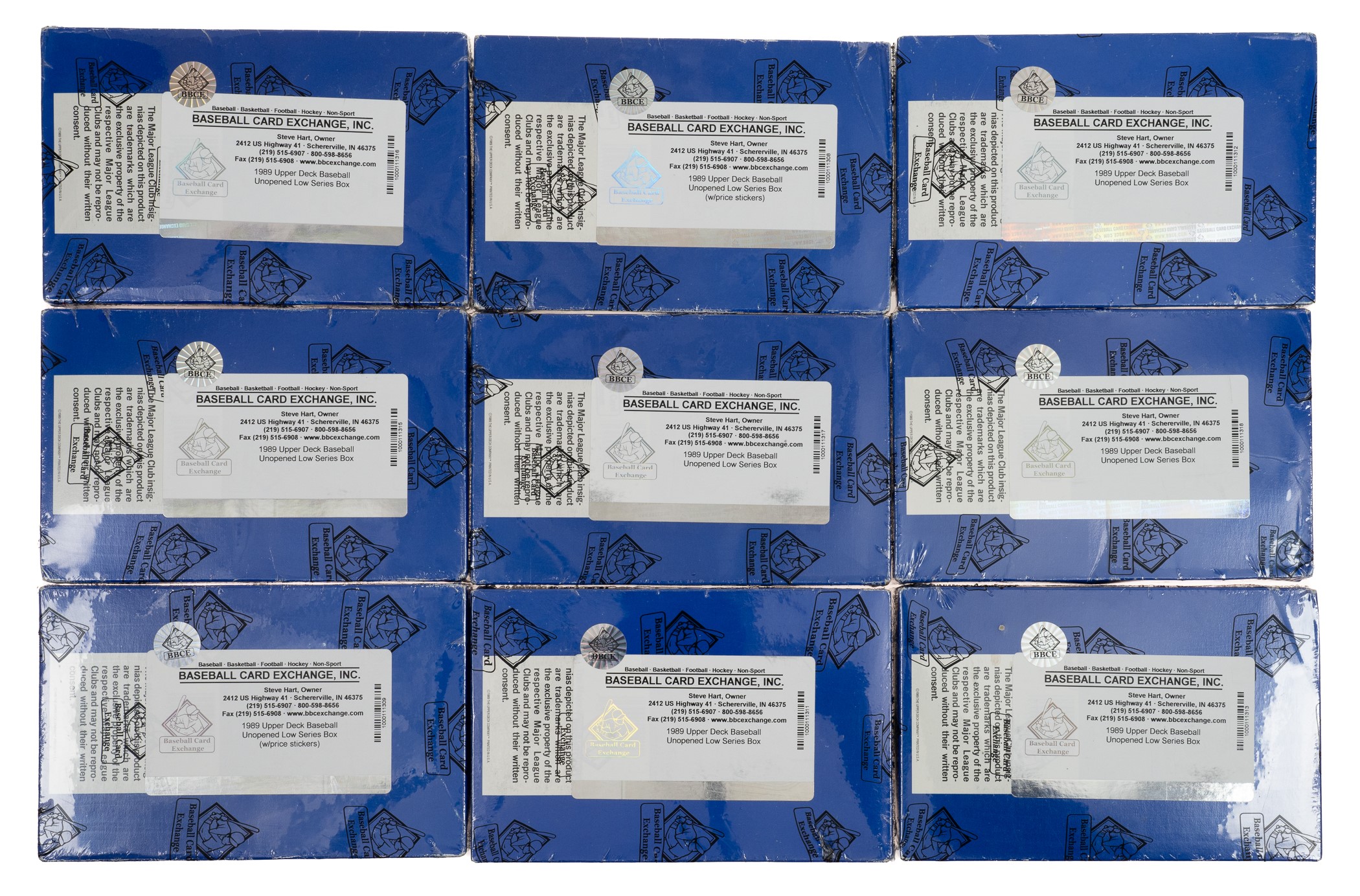 Presented is a collection of nine unopened 1989 Upper Deck Baseball low-number series wax boxes, each containing thirty-six packs and fifteen cards per pack for a total of 4,860 cards. The 1989 Upper Deck set includes rookie cards of Ken Griffey Jr., Randy Johnson, Gary Sheffield, and John Smoltz. Each box comes shrink-wrapped by Baseball Card Exchange (owned by Steve Hart, the foremost expert on unopened material). While it is impossible to provide guarantees with reference to grading of unopened material, there is, of course, the very real possibility that within these boxes are Gem Mint cards of these rookies. All the other stars of the day are also included. The boxes are bright and bold. An outstanding group of unopened low-number series wax boxes from this classic modern issue. Total: 9 unopened boxes. The size/weight of this item requires that there will be an additional shipping charge for this lot. Opening Bid $500.