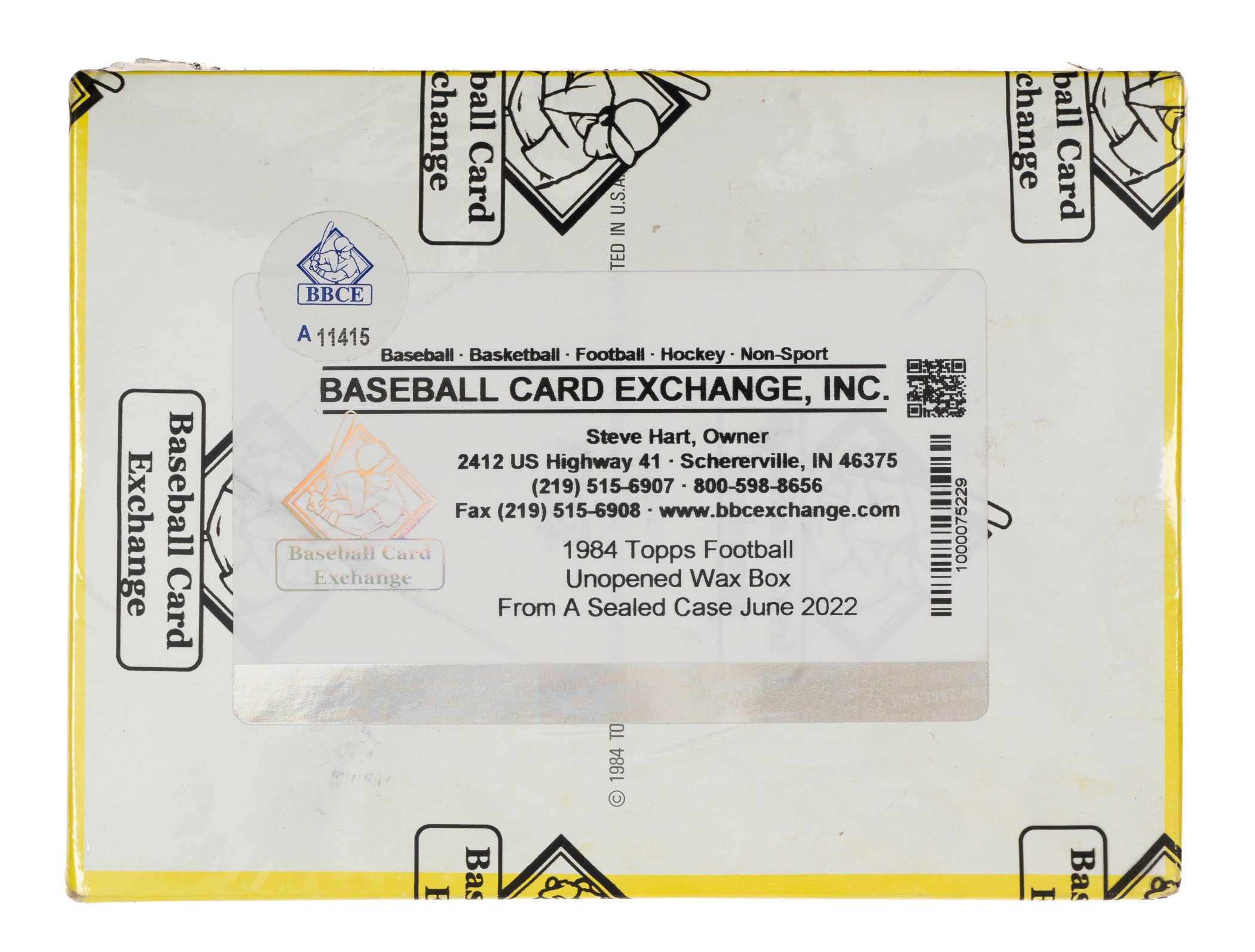 Complete, original unopened wax box of 1984 Topps football. The box houses thirty-six packs with each pack containing fifteen cards, for a total of 540 cards. The 1984 Topps set includes rookie cards of Hall of Famers Dan Marino, John Elway, Eric Dickerson, and Howie Long, as well as numerous other stars and Hall of Famers, including Walter Payton, Joe Montana, and Terry Bradshaw. The store display box is bright and bold with light shelf wear. This box comes shrink-wrapped by Baseball Card Exchange (owned by Steve Hart, the foremost expert on unopened material) and bears his certified designation as having originated from a sealed case Opening Bid $500.