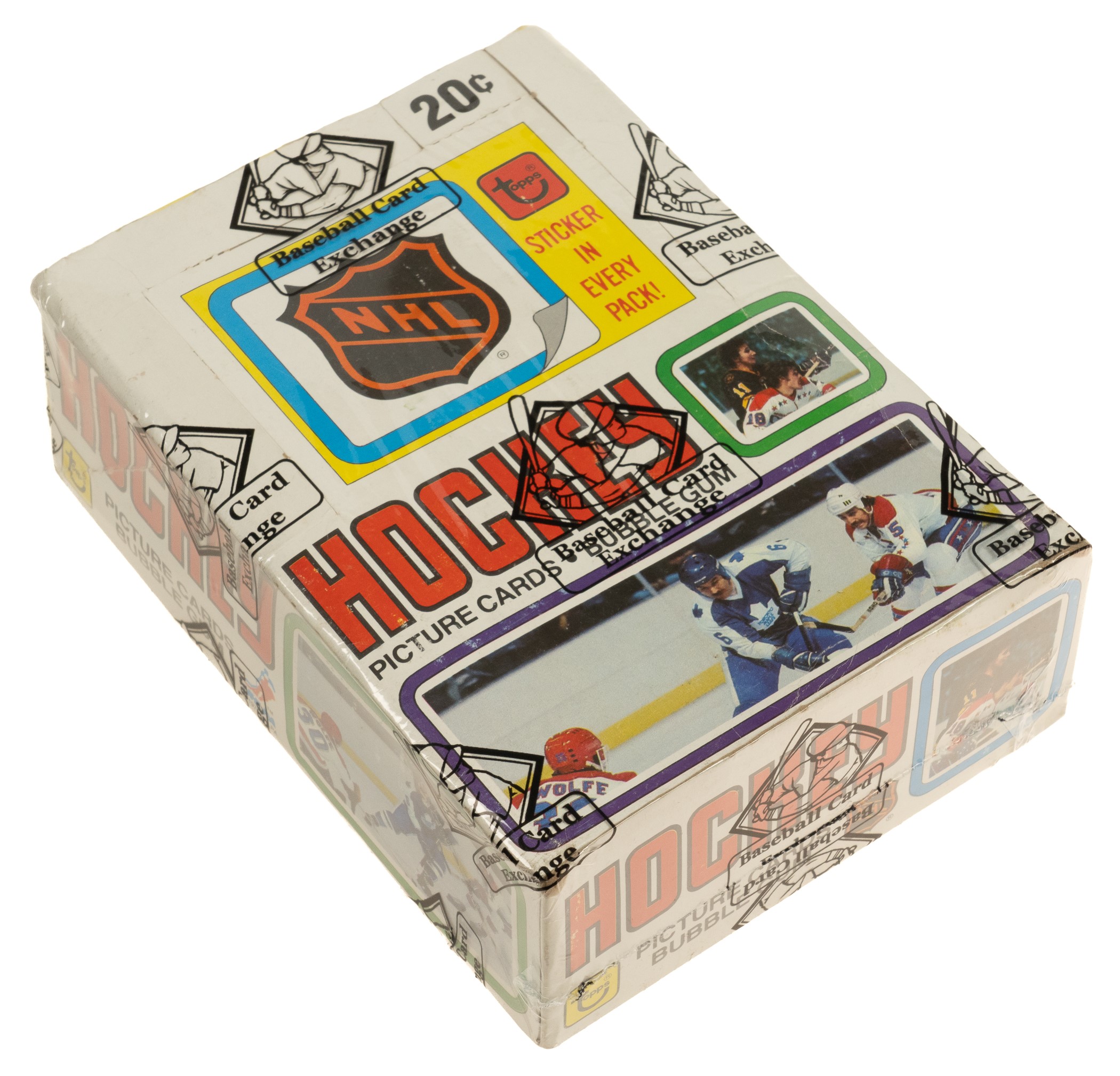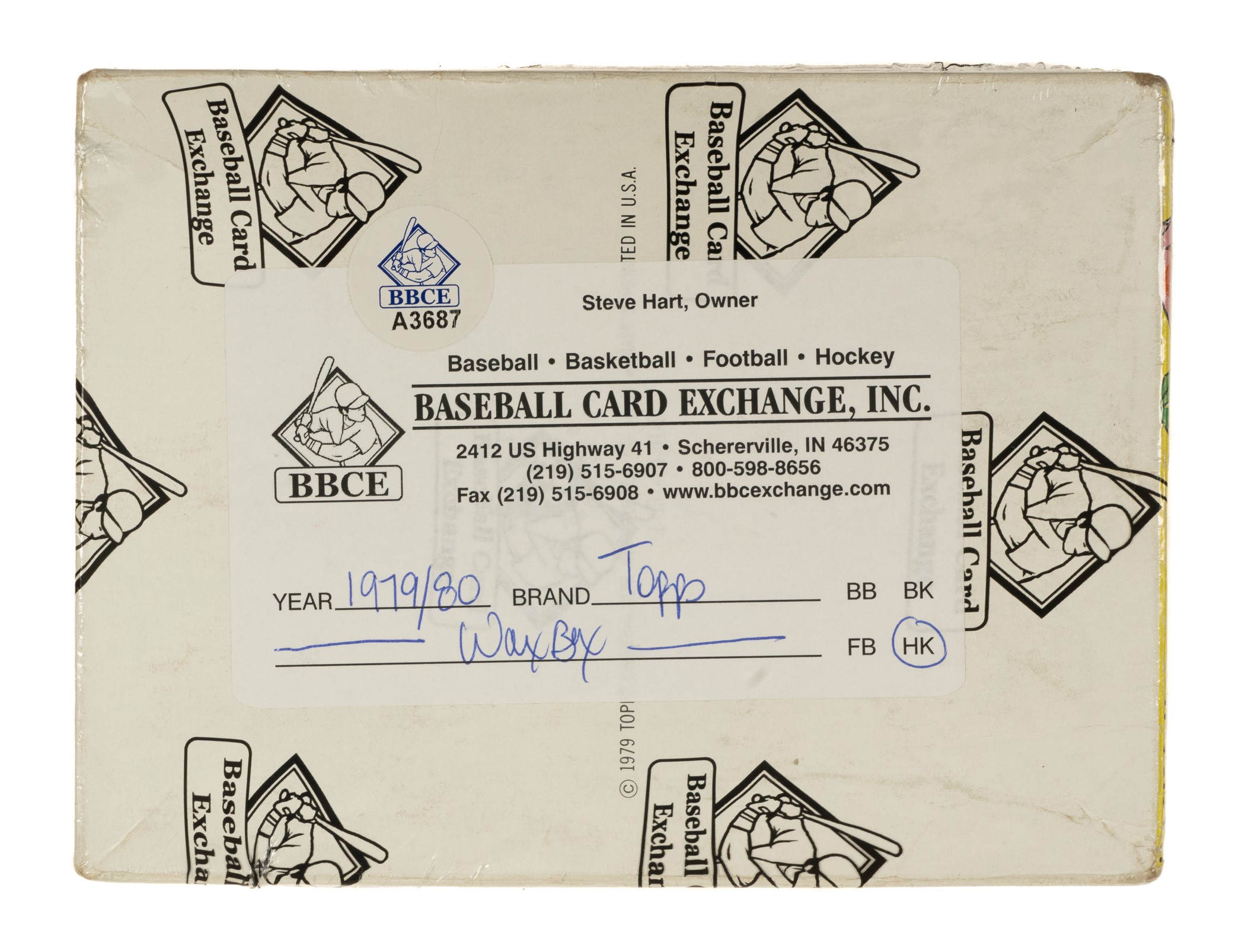 Complete, original unopened wax box of 1979-1980 Topps hockey containing thirty-six unopened wax packs. Each pack contains ten cards for a total of 360 cards. The 1979-1980 Topps hockey set features the rookie card of Hall of Famer Wayne Gretzky, and many other Hall of Famers, including Ken Dryden, Gordie Howe, Bobby Hull, and Mike Bossy. While it is impossible to provide guarantees with reference to grading of unopened material, there is, of course, the very real possibility that within this box are ultra high-grade examples of these cards and others from the set. Given the meteoric rise of high-grade rookie cards recently, including the incredible $1.2 million public auction sale of a PSA GEM MINT 10 Topps Wayne Gretzky in August 2022, it is hard not to consider the increased value prospects of a completely original unopened wax box of this classic issue. The box comes shrink-wrapped by Baseball Card Exchange (owned by Steve Hart, the foremost expert on unopened material). The store display box is bright and bold with light-to-moderate shelf wear, including a bit of creasing. This is an extremely desirable unopened wax box that would make a superb addition to any hockey card or unopened wax-box collection. Opening Bid $10,000.