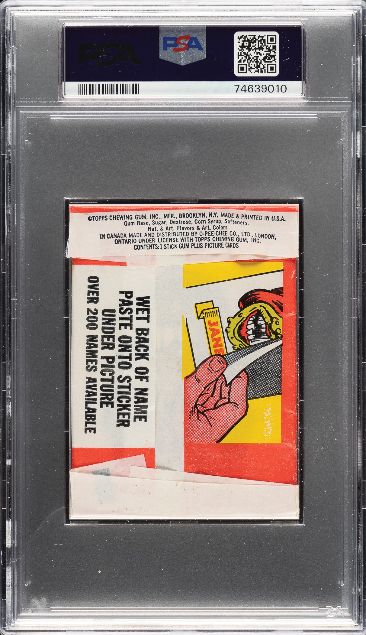 Graded NM-MT 8 by PSA. Orginial unopened wax pack from the 1966 Topps "Make Your Own Name Stickers" set. Issued by Topps in 1966, this unusual set includes thirty-three sticker card designs featuring grotesque, monster-like faces. Accompanying the sticker cards inside each pack is a sheet of stickers with assorted names for youngsters to peel off and place in empty nameplates under each face. Opening Bid $100.