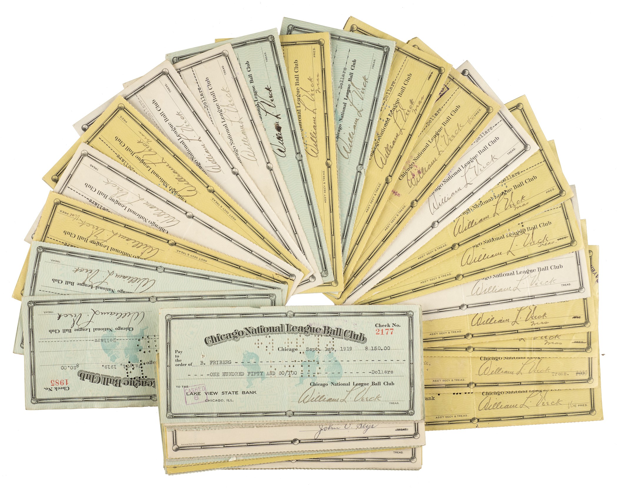 Collection of sixty-nine Chicago Cubs payroll checks issued in 1919. The signatures of two different Cubs front-office executives appear, respectively, on the front of the checks: John O. Seys (7) and William Veeck (62). The signatures are scripted in either black or blue fountain pen. The checks are made out to (and endorsed on the reverse by) the following players: Two Bailey (5/15 and 6/30), two Barber (6/14 and 7/22), four Carter (4/30, 5/31, 6/14, and 9/1), ten Daly (3/19, 4/30, 5/15, 5/31, 6/14, 7/15, 7/31, 9/1, 9/15, and 9/29), two Deal (6/14 and 8/15), five Douglas (2/25, 3/19, 4/30, 6/14, and 7/15), five Flack (4/30, 5/15, 6/14, 7/31, and 9/1), two Friberg (7/31 and 9/1), three Hendrix (4/17, 7/10, and 9/1), two Herzog (9/1 and 9/15), Killefer (4/8), four Mann (4/30, 5/31, 7/15, and 7/31), three Martin (3/31, 6/14, and 9/1), two McCabe (4/30 and 9/29), Newkirk (9/15), six O'Farrell (4/9, 5/15, 5/31, 7/15, 9/1, and 9/29), five Paskert (5/15, 5/31, 6/14, 9/1, and 9/15), six Pick (4/30, 5/15, 5/27, 5/31, 6/14, and 7/15), three Robertson (8/10, 9/15, and 9/22), and Tyler (6/15). The checks (8.25 x 3.75 inches) all have normal bank cancellation stamps and holes. Flaws included but not limited to: edge tears, folds, and creases. In Good to Very Good condition overall. This lot originates from the extraordinary collection of a longtime Chicago Cubs executive, Eldred "Salty" Saltwell, which is consigned to this auction by his family. Total: 69 checks. Auction LOA from James Spence/JSA. Opening Bid $1,000.