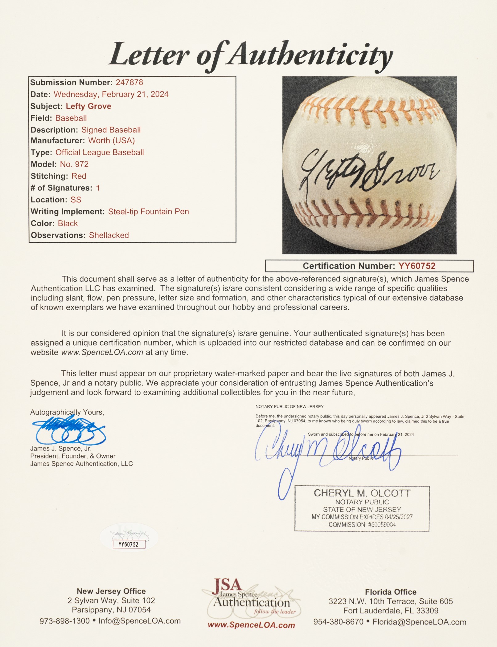 Worth "Official League" baseball signed by Hall of Fame pitcher Lefty Grove, who has signed the ball in black fountain pen across the sweet spot. One of baseball’s fiercest competitors, Lefty Grove was an integral part of the Philadelphia Athletics dynasty of 1929 to 1931. He won an astounding nine ERA titles and led his league in wins four times, registering a lifetime total of exactly 300 wins. Grove singles are very scarce. Grove passed away in 1975, before collecting Hall of Famers on single-signed baseballs became popular. The ball remains in Excellent to Mint condition. Full LOA from PSA/DNA and an additional full LOA from James Spence/JSA. Opening Bid $300.