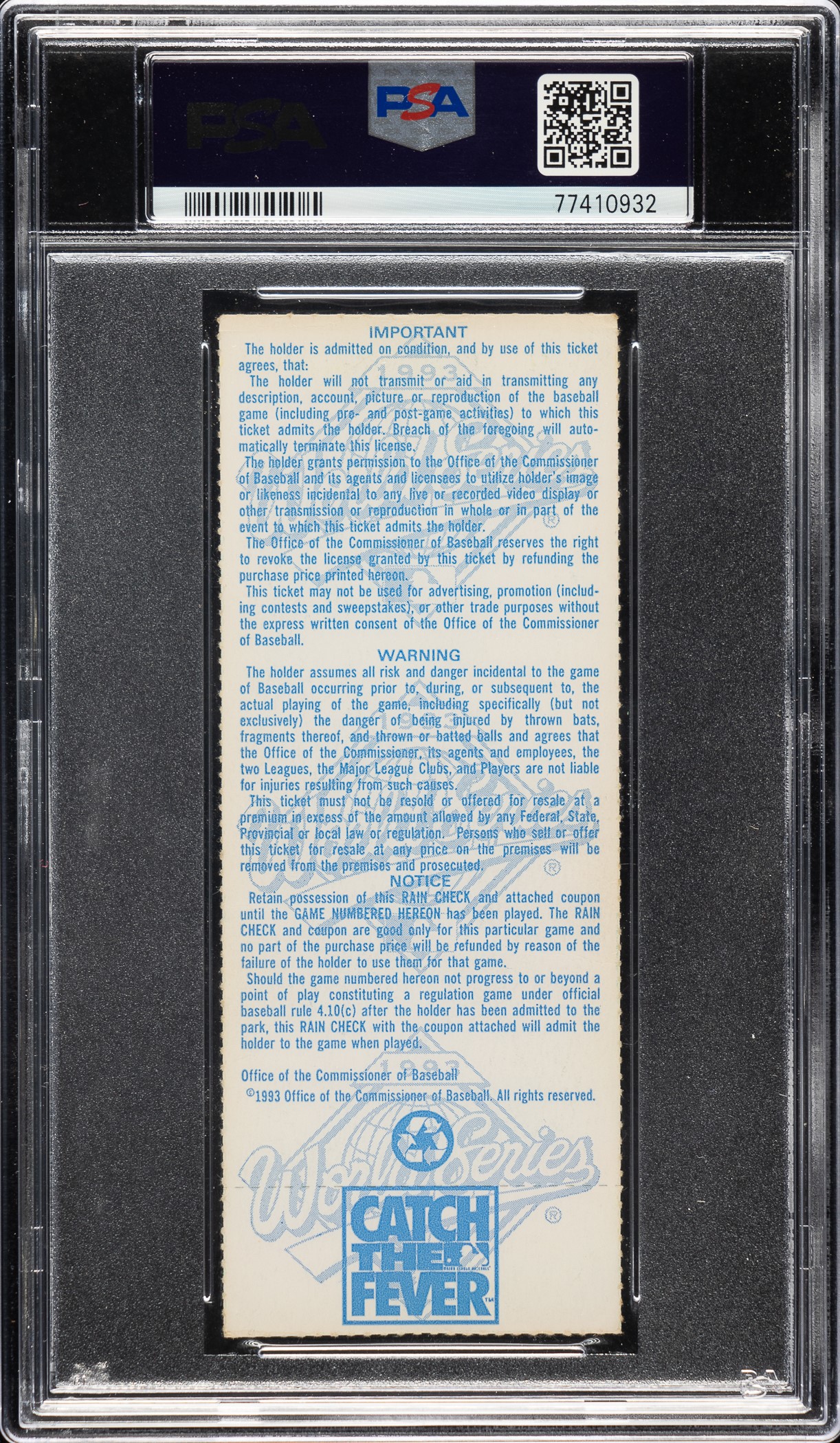 Ticket stub issued for Game 6 of the 1993 World Series held at the SkyDome in Toronto on October 23. Signed on the front by Joe Carter in blue marker. Game 6 was highlighted by Carter's dramatic 3-run walk-off home run that gave Toronto its second consecutive World Series Championship. PSA/DNA has encapsulated the ticket, grading the signature GEM MINT 10 and the ticket GOOD 2. Opening Bid $200.