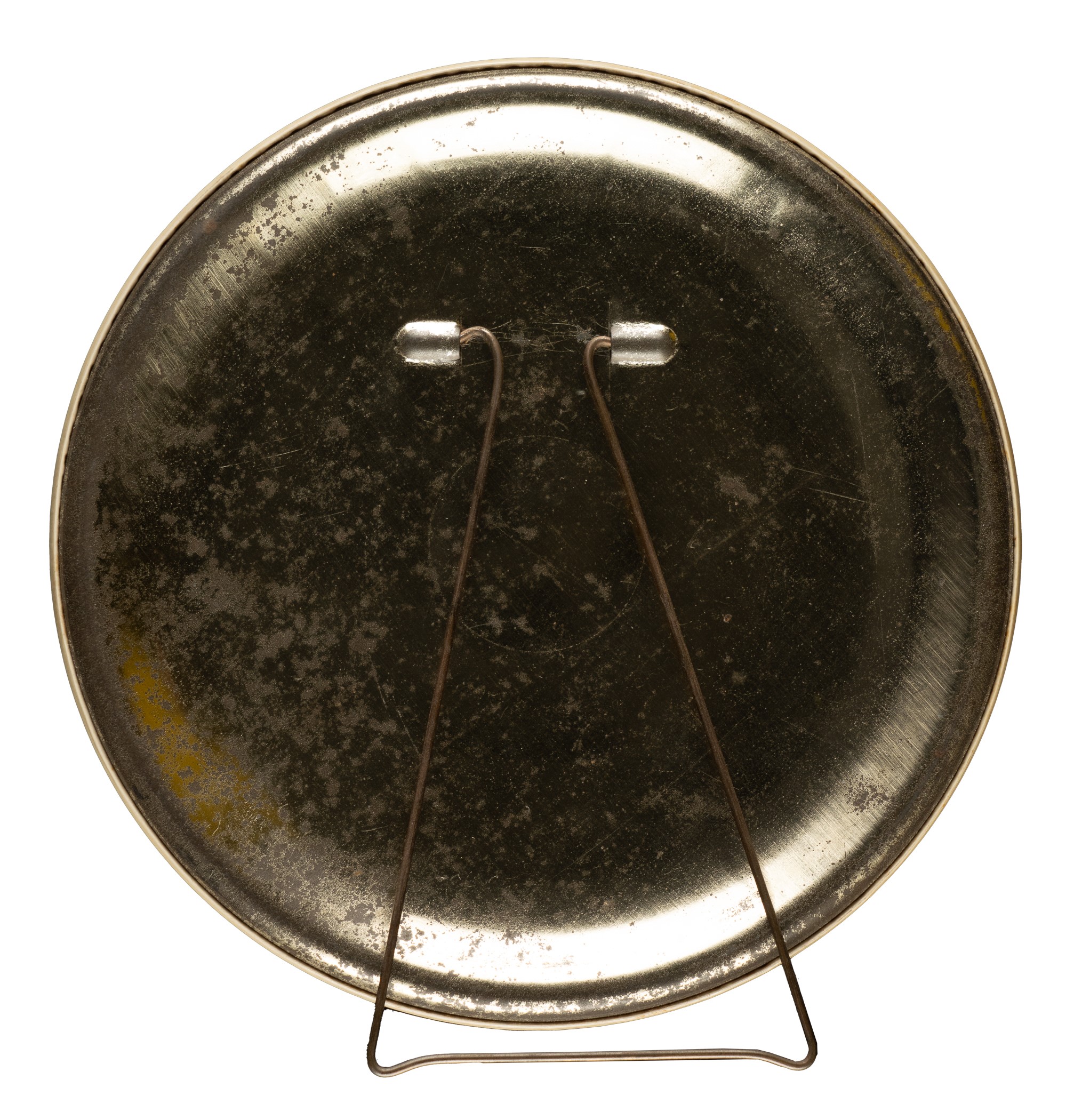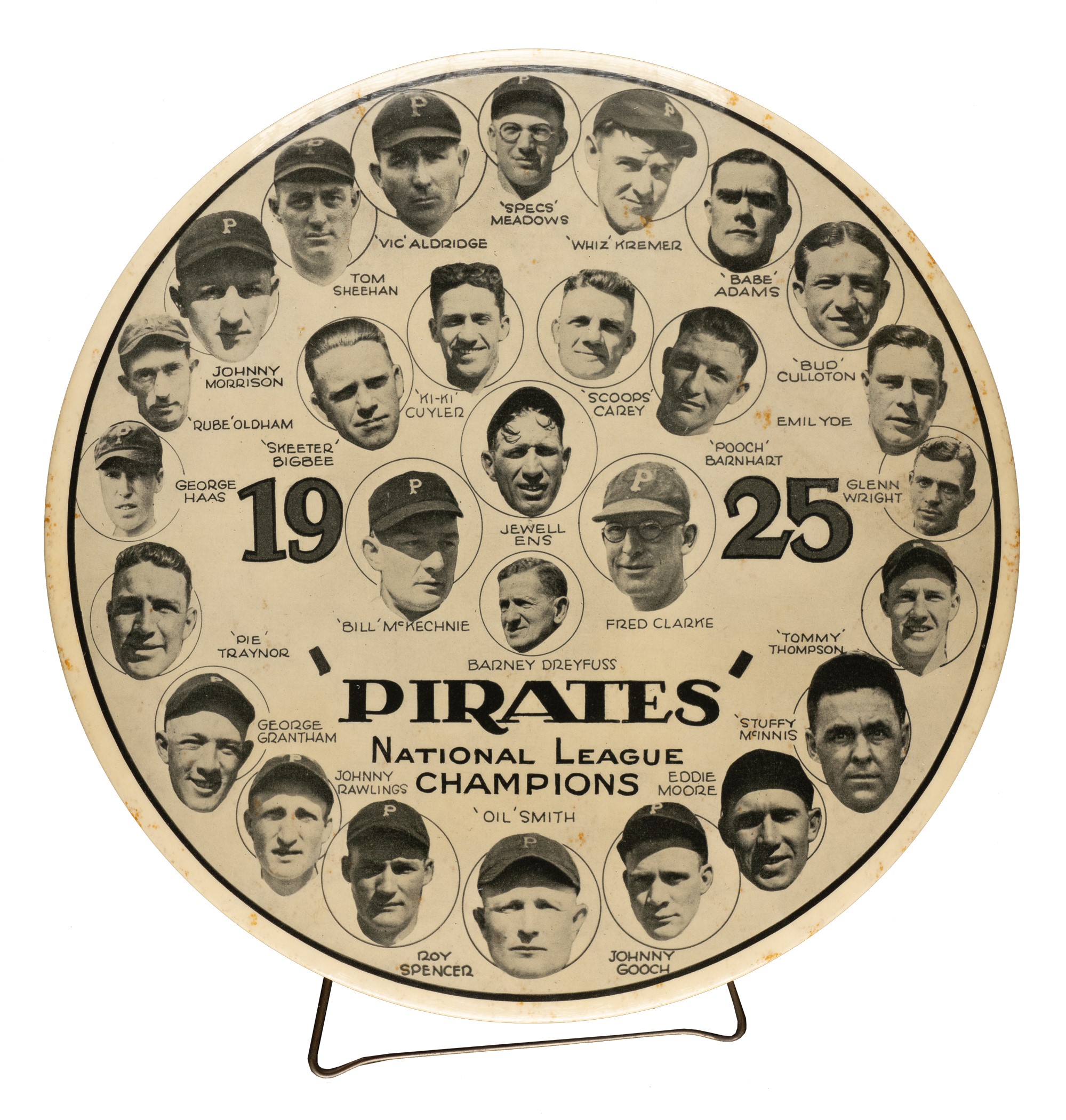 This exceedingly rare and stunning large-format 1925 Pittsburgh Pirates celluloid button is among the most impressive of all baseball celluloids. This team-composite button features twenty-eight portraits of the 1925 World Champion Pittsburgh Pirates, including Hall of Famers Pie Traynor, Ki-Ki Cuyler, Bill McKechnie, Fred Clarke, and Barney Dreyfuss. The unique design includes a metal easel on the back to allow for display on a counter or shelf. Over the last several decades, we have seen just a few of these extraordinary celluloids, and this is only the third example we have offered in the past twenty years. Diameter: 7.5 inches. Light foxing is visible on the front and moderate oxidation is evident on the reverse. In Very Good to Excellent condition overall. Opening Bid $300.