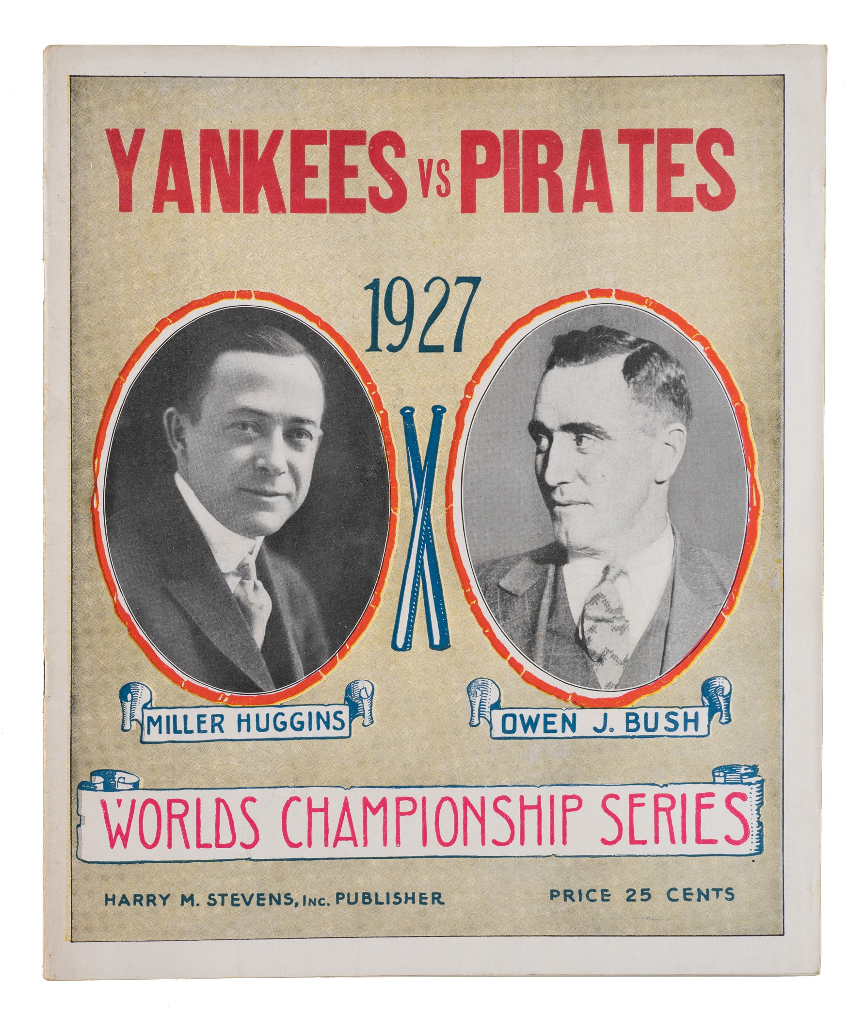 Substantial 20-page large-format New York Yankees program from Game 4 of the 1927 World Series against the Pittsburgh Pirates, held at Yankee Stadium on October 8th. The 1927 World Series program has a very broad collecting appeal and is universally recognized as one of the most desirable of all World Series programs. It is also one of the most impressive and highly prized items relating to baseball's most legendary team: the 1927 New York Yankees. The cover features large portrait images of each club's respective manager, Miller Huggins and Owen Bush, while the interior pages include photos of league and team officials, as well as portraits of twenty-five members of both the Yankees and Pirates. Published by Harry M. Stevens. The preprinted lineups include Ruth, Gehrig, Lazzeri, Combs, and Meusel for New York, and L. Waner, P. Waner, and Traynor for Pittsburgh. The program is neatly scored in pencil for Game 4 in which the Yankees defeated the Pirates by a score of 4-3. In addition to Game 4 being the final game of the Series, it was also one of two games in the Series to feature a Babe Ruth home run. The 1927 World Series, which matched the fabled New York Yankees against the Pittsburgh Pirates, seemed almost anticlimactic, given the Yankees' dominance during the regular season. Led by Ruth and Gehrig, the team's vaunted "Murderer's Row" lineup belted out a then-record 158 home runs and led the league in virtually every offensive category. Although the Pirates featured a formidable lineup themselves, led by the famed Waner brothers, Paul and Lloyd, they proved to be no match. The Yankees easily dispatched their National League rivals in four straight games, earning them the unofficial title of baseball's all-time greatest team. The program (9.25 x 11 inches) has light creases and minor handling wear. The interior centerfold page has detached from only the top staple. In Very Good to Excellent condition overall. This is an outstanding example of one of the most historically significant World Series programs and one that is a requisite for any advanced New York Yankees, Babe Ruth, or World Series program collection. Opening Bid $500.