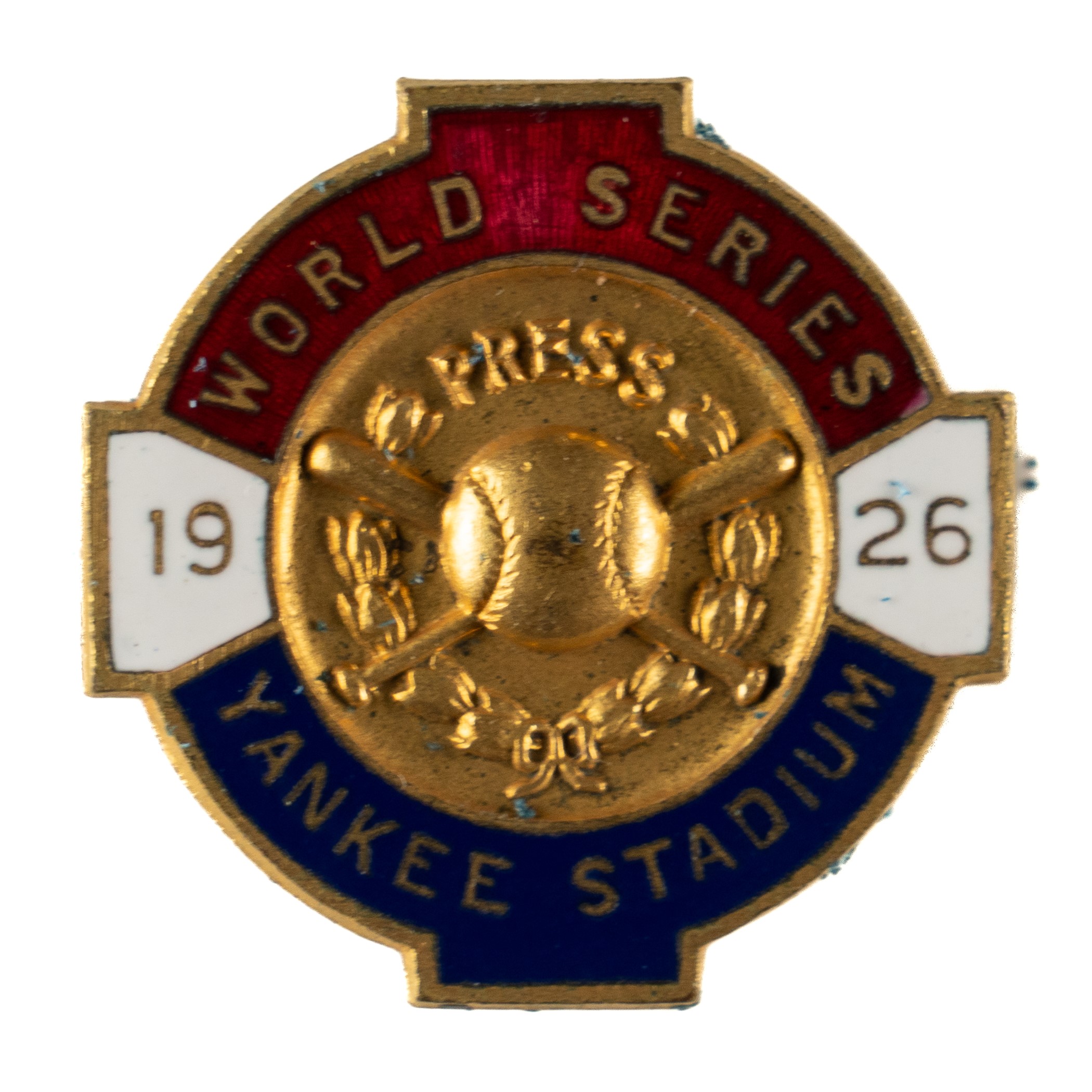 New York Yankees press pin issued for the 1926 World Series against the St. Louis Cardinals. The Cardinals defeated the Yankees in a dramatic seven-game Series in 1926 that featured one of the most memorable moments in postseason history. With the Cardinals clinging to a slim 3-2 lead in the bottom of the seventh inning of Game 7, Tony Lazzeri came to bat with the bases loaded and two outs. Hornsby then summoned Grover Alexander, who had notched a complete-game victory the day before, from the bullpen. After Lazzeri brought the crowd to its feet with a line drive that landed just foul in the left-field stands, Alexander managed to strike him out to end the threat. Alexander then blanked the Yankees over the next two innings to give the Cardinals franchise its first World Series Championship. Manufactured by Dieges & Clust; threaded-post back. Approximately 1 x 1 inches. Excellent to Mint condition. Opening Bid $300.