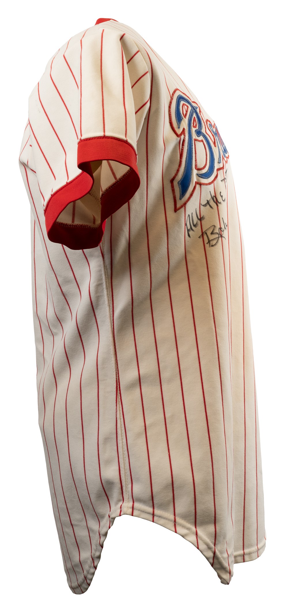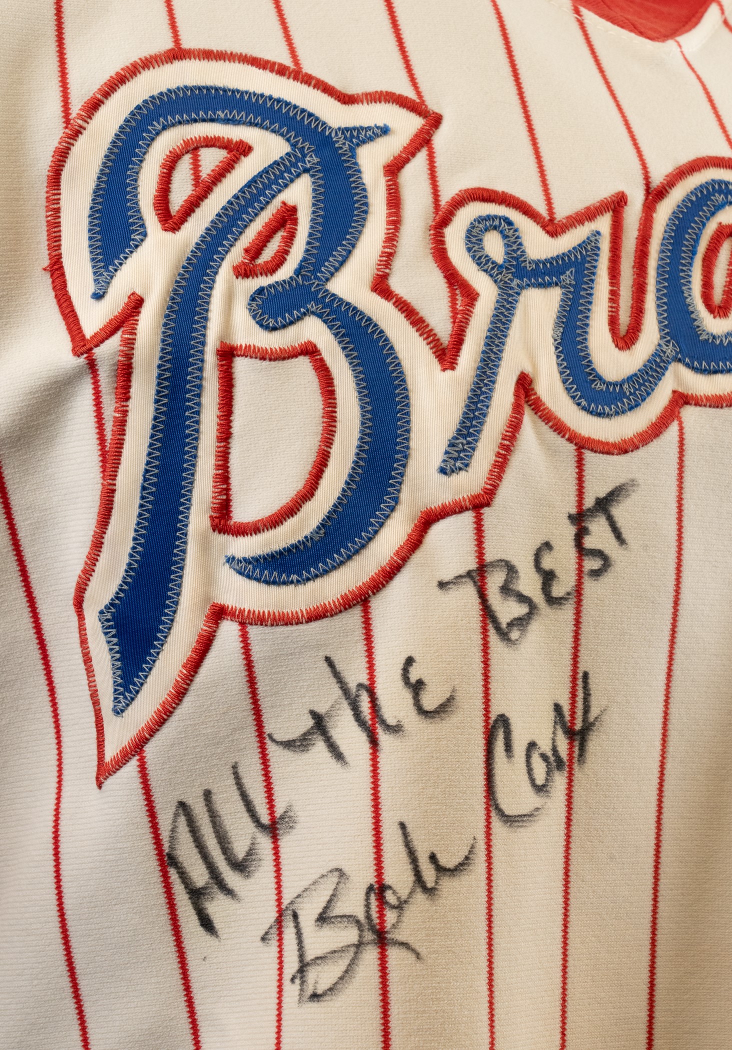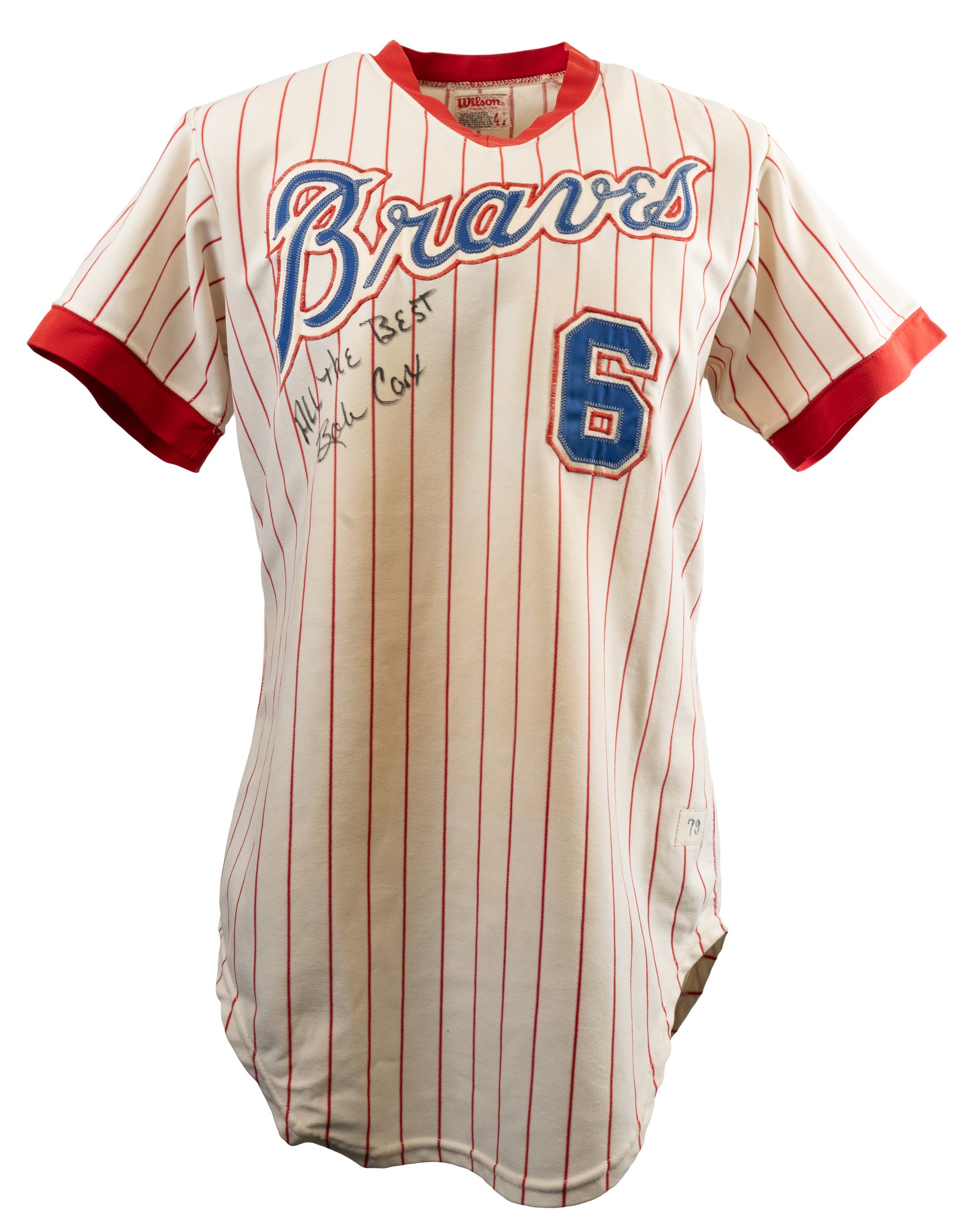 Atlanta Braves home jersey worn by Hall of Fame manager Bobby Cox during his 1979 season. The white knit pinstripe jersey is lettered "Braves" across the front and features the number "6" on both the left breast and reverse. All letters and numerals are appliqued in blue-on-white tackle twill, edged with red embroidery. A "Wilson 44" label appears in the collar. The year, "79," is chain-stitched in blue upon a white strip tag on the left front tail. Cox has signed the jersey in black marker on the front, adding "All The Best" directly above his signature. The jersey is original as issued, with no alterations, and displays light-to-moderate wear. One of the most successful managers of the modern era, Cox won five pennants and one World Championship during his 30-year managerial career and his lifetime win total of 2,504 ranks fourth best all time. He was inducted into the Hall of Fame in 2014. Auction LOA from James Spence/JSA (for the autograph only). Opening Bid $300.