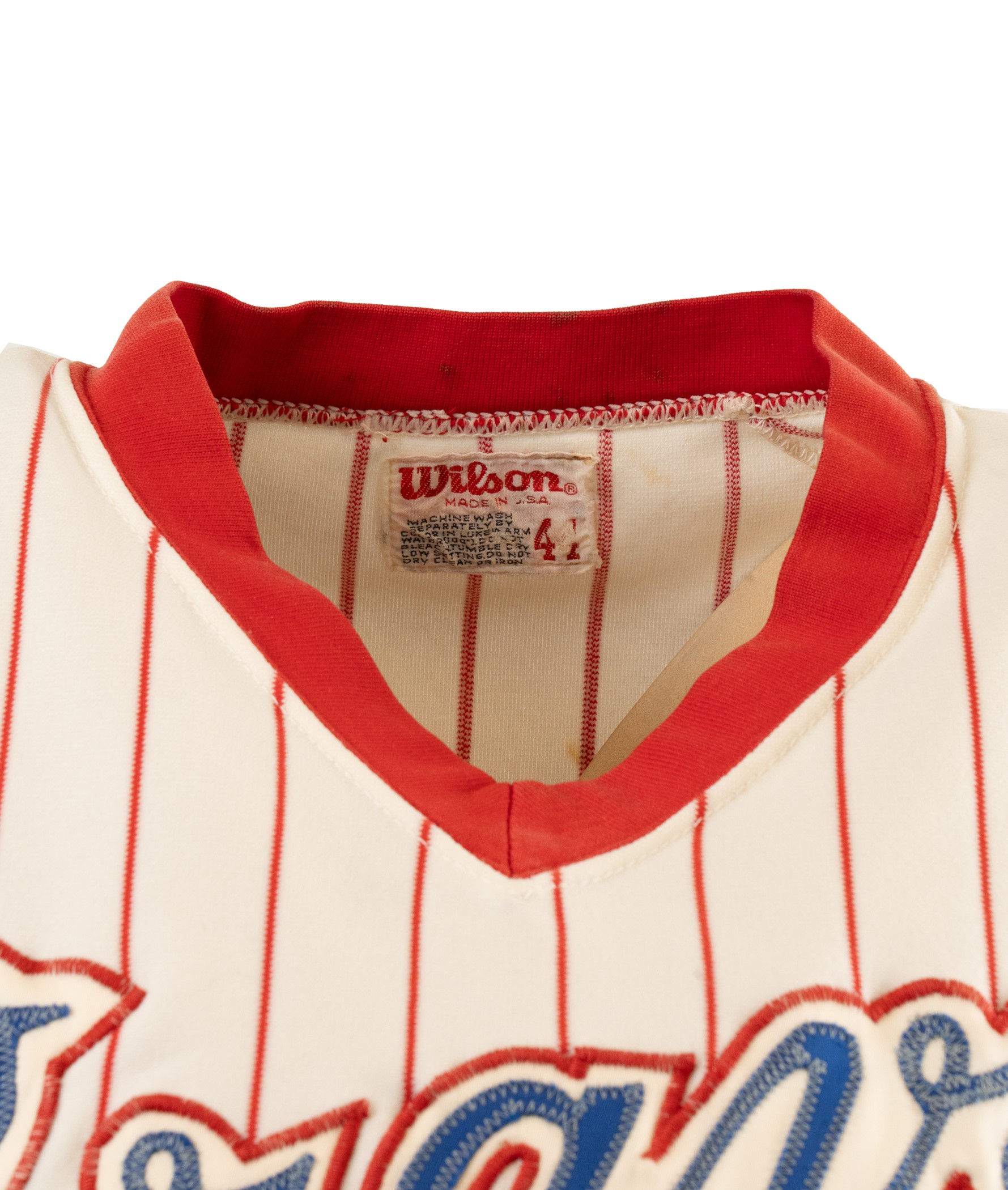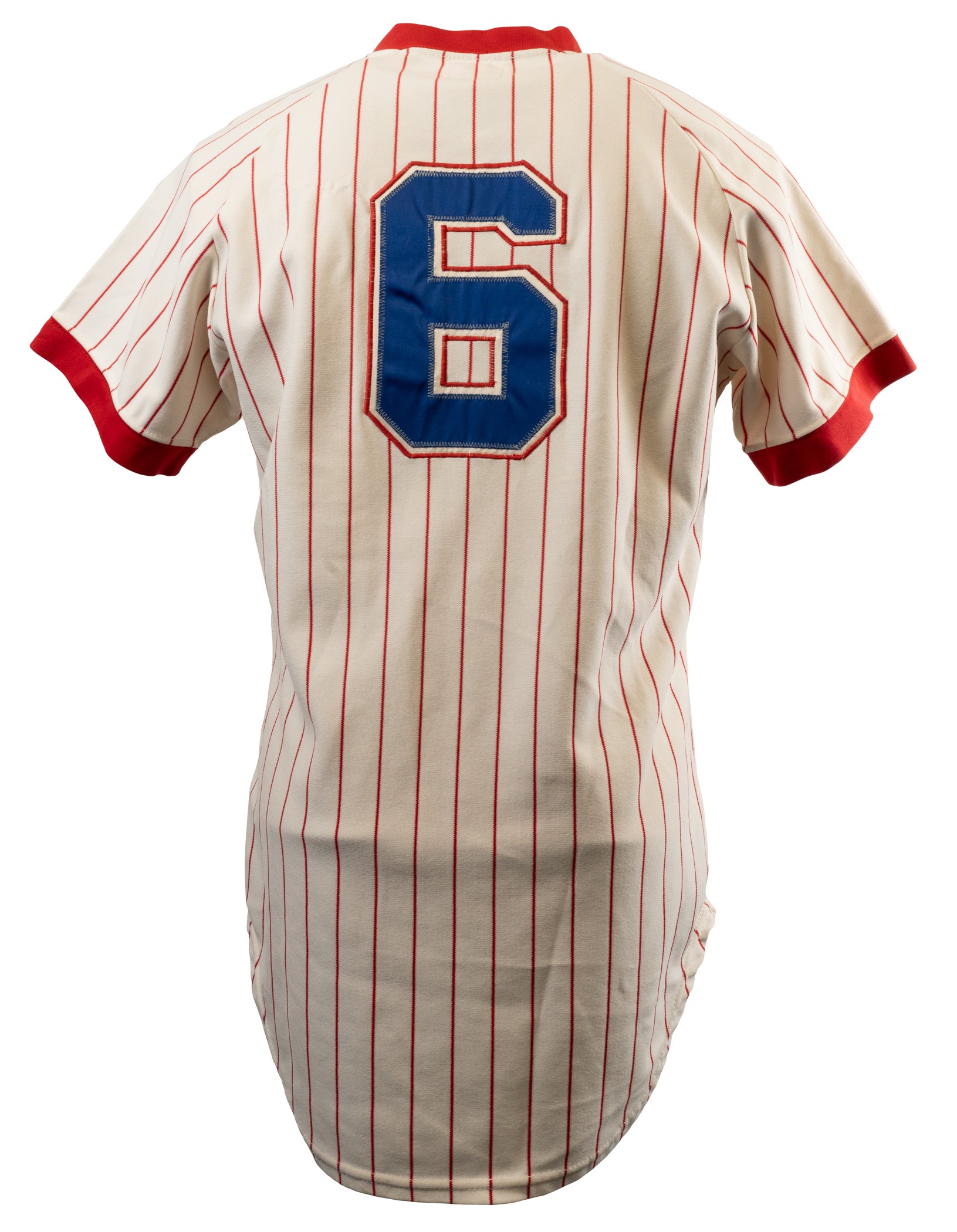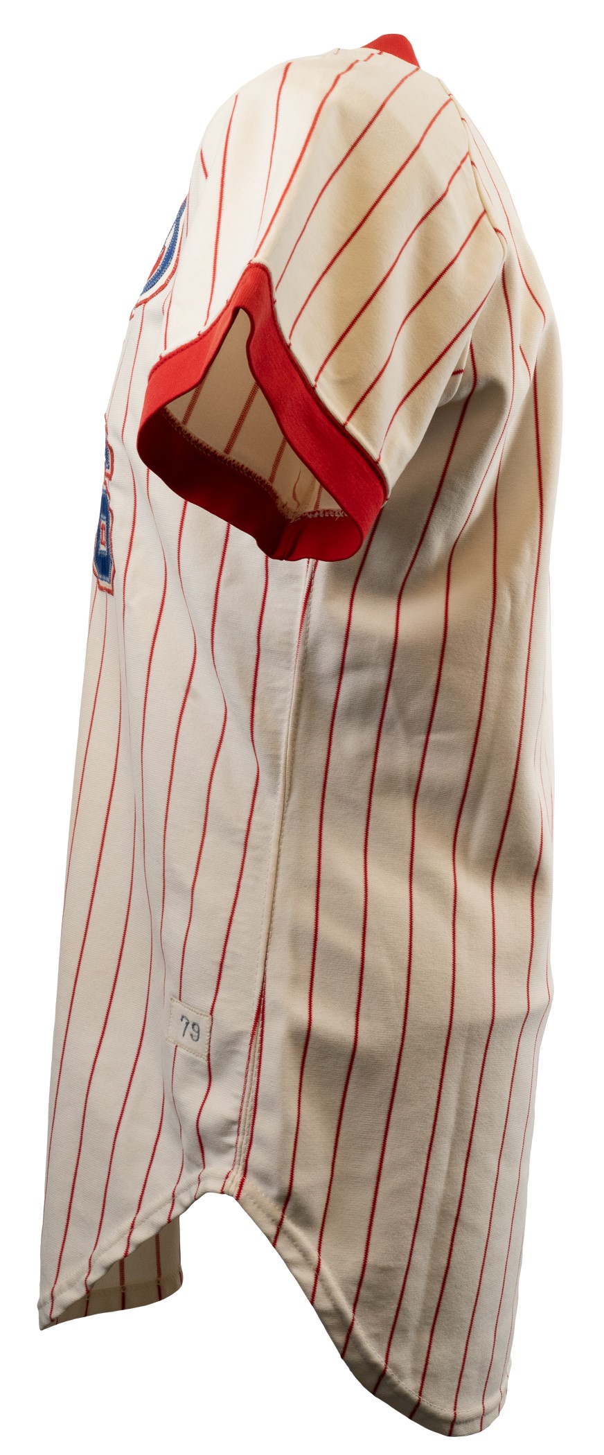 Atlanta Braves home jersey worn by Hall of Fame manager Bobby Cox during his 1979 season. The white knit pinstripe jersey is lettered "Braves" across the front and features the number "6" on both the left breast and reverse. All letters and numerals are appliqued in blue-on-white tackle twill, edged with red embroidery. A "Wilson 44" label appears in the collar. The year, "79," is chain-stitched in blue upon a white strip tag on the left front tail. Cox has signed the jersey in black marker on the front, adding "All The Best" directly above his signature. The jersey is original as issued, with no alterations, and displays light-to-moderate wear. One of the most successful managers of the modern era, Cox won five pennants and one World Championship during his 30-year managerial career and his lifetime win total of 2,504 ranks fourth best all time. He was inducted into the Hall of Fame in 2014. Auction LOA from James Spence/JSA (for the autograph only). Opening Bid $300.