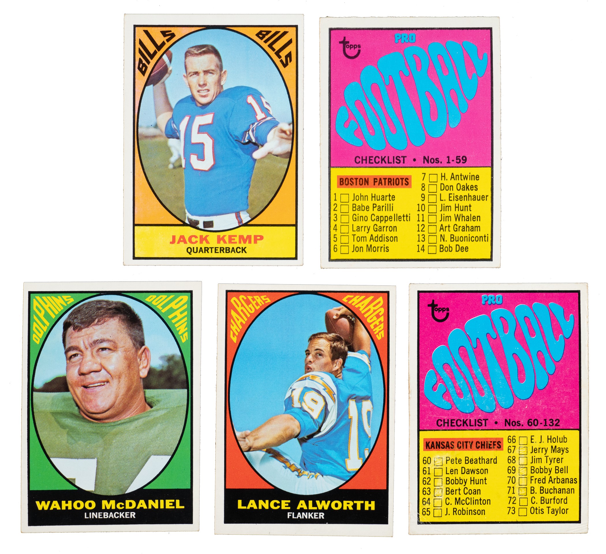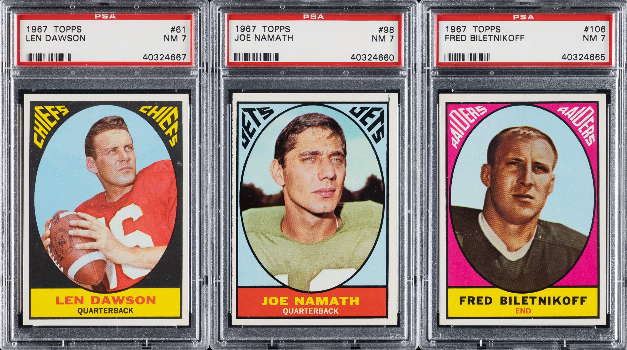 Complete 132-card set of 1967 Topps football. This classic set features all the AFL stars of the era, including Hall of Famers Len Dawson, Joe Namath, Fred Biletnikoff, and Lance Alworth, and stars such as Jack Kemp and Wahoo McDaniel. The condition is 15% Ex-Mt to Nr/Mt, 73% Vg-Ex to Ex, and 12% Gd to Vg (including a few lesser). Three cards have been graded and encapsulated by PSA. Keys: #24 Kemp (Ex+), 59 Checklist (Vg+), 61 Dawson (NM 7), 82 McDaniel RC (Ex+), 98 Namath (NM 7), 106 Biletnikoff (NM 7), 123 Alworth (Ex-Mt), and 132 Checklist (partially erased marks, otherwise Gd). Very attractive complete Topps Football set, including many Hall of Famers and stars of the era. Total: 132 cards. Opening Bid $200.