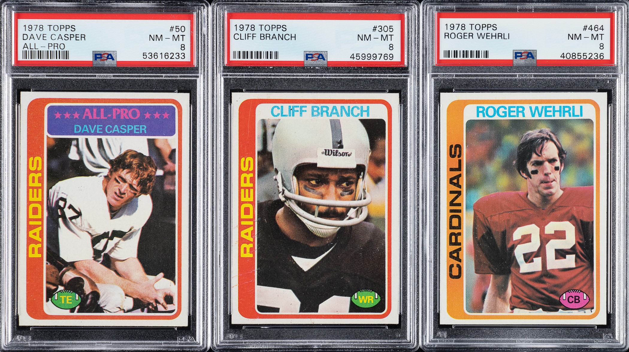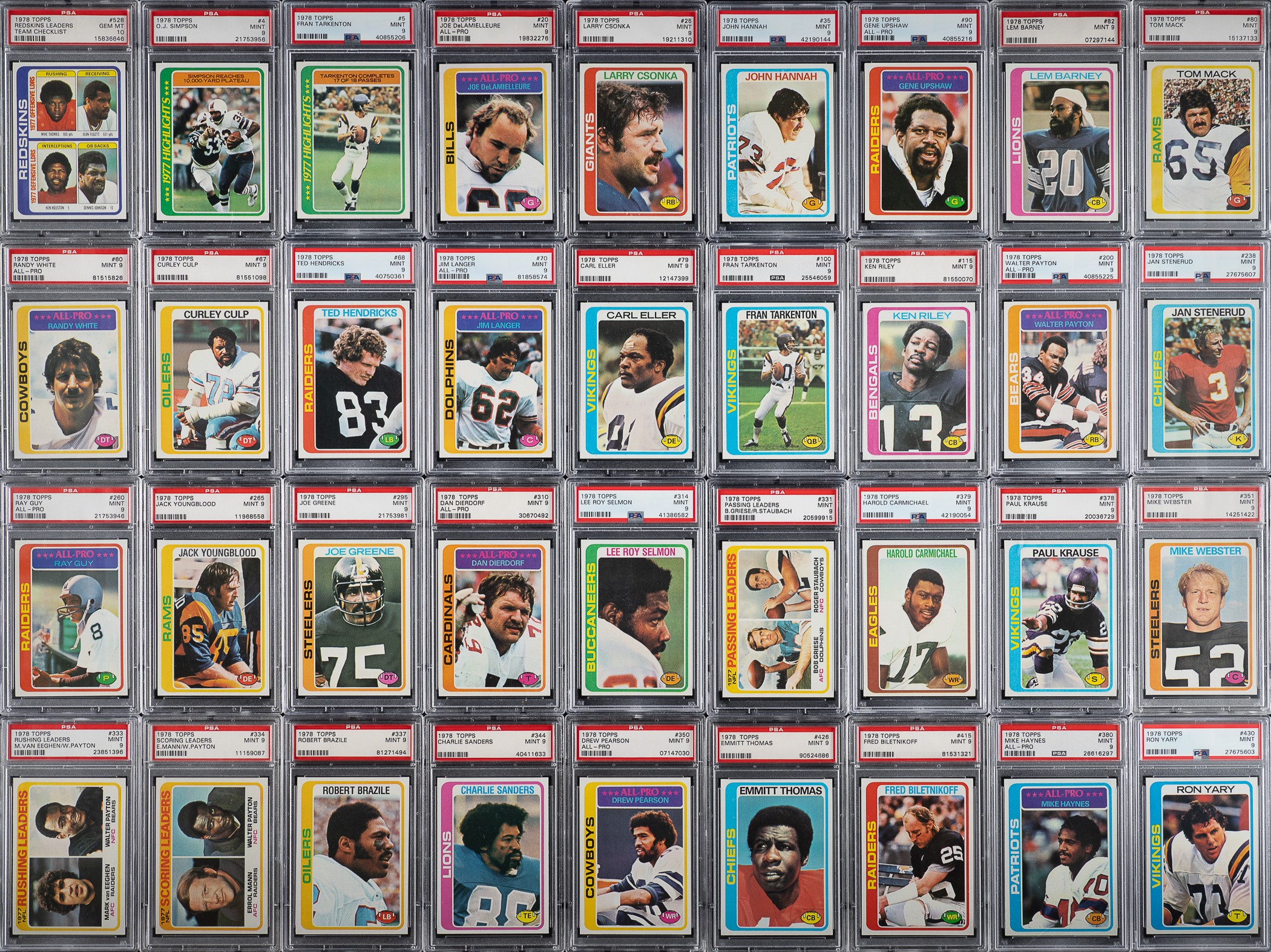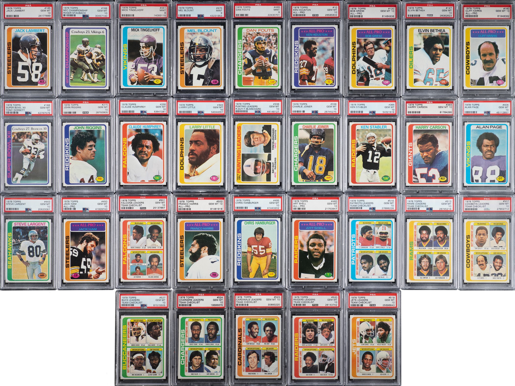 Unbelievably ultra high-grade complete 528-card set of 1978 Topps football cards, entirely graded and encapsulated by PSA. This incredible set currently ranks first on the PSA Set Registry with an impressive overall GPA of 9.48 (10.02 with top bonuses) and includes an unbelievable 284 cards graded GEM MINT 10. It goes without saying that the assembly of this set is a tremendous collecting achievement. The 1978 Topps set features rookie cards of Hall of Famers Fred Dean, Tony Dorsett, and John Stallworth as well as numerous other stars and Hall of Famers, including Walter Payton, Terry Bradshaw, and Roger Staubach. The set consists of an astounding 284 GEM MINT 10s, 219 MINT 9s, one NM-MT+ 8.5, and twenty-one NM-MT 8s. This is an extraordinary set!