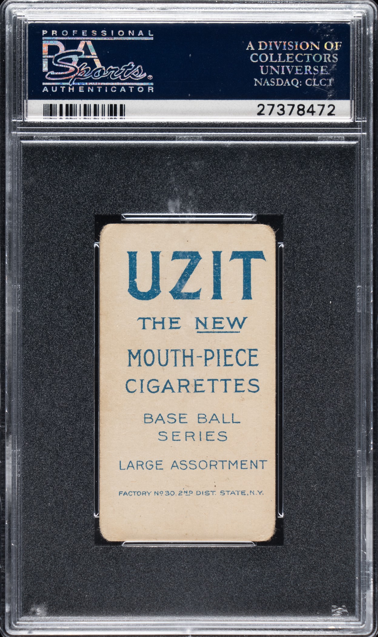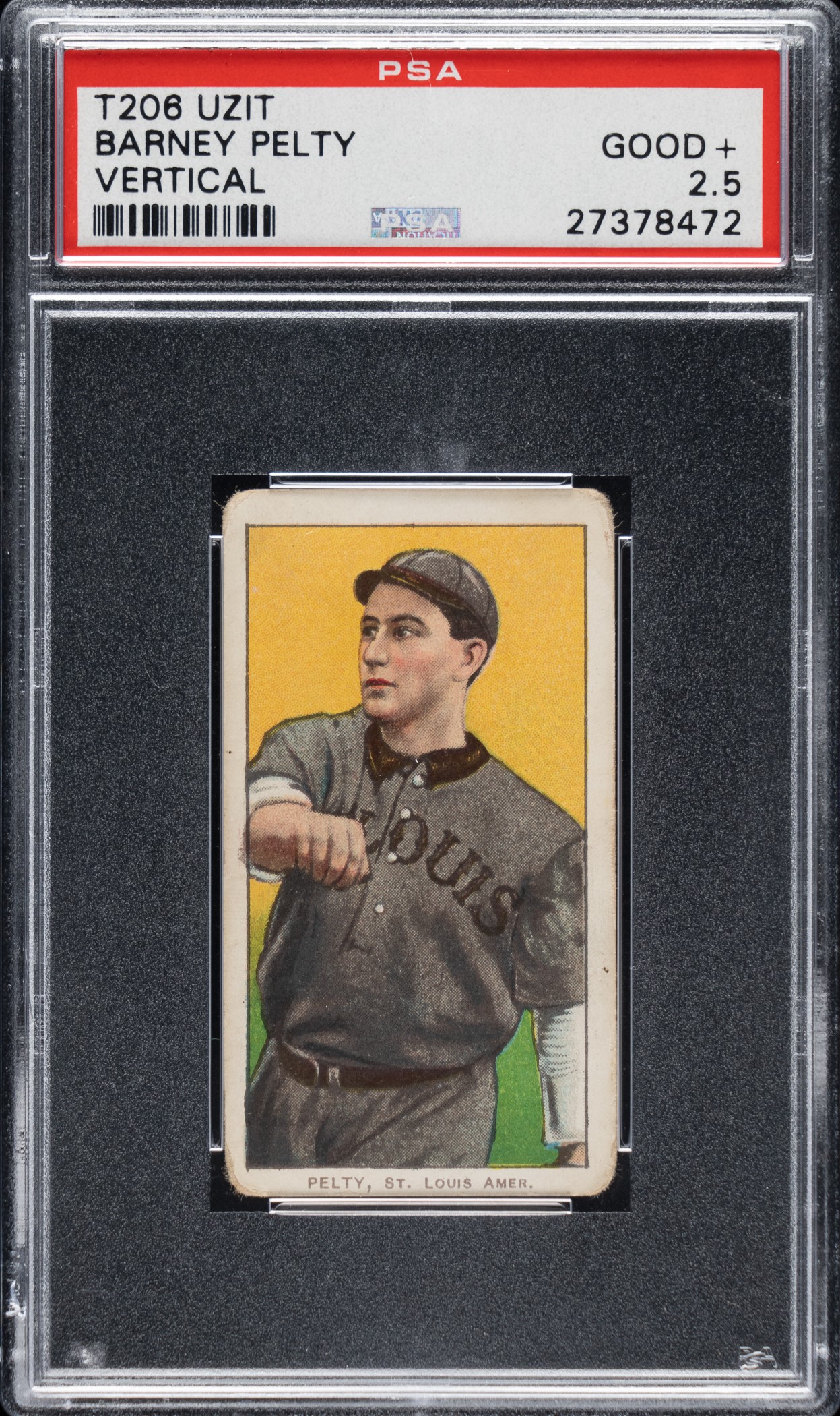 Graded GOOD+ 2.5 by PSA. This is the only example of this front/back combination graded at this level by PSA with just one higher. Outstanding example of Barney Pelty (vertical, St. Louis Browns) from the classic T206 set with an extremely desirable Uzit advertising reverse. According to T206Resource.com, Uzit ranks as the sixth most difficult (out of thirty-nine) advertising back to find. The offered example features brilliant colors, a crisp image, and rounded corners. The important Uzit advertising reverse is boldly printed and clean. Opening Bid $1,000.