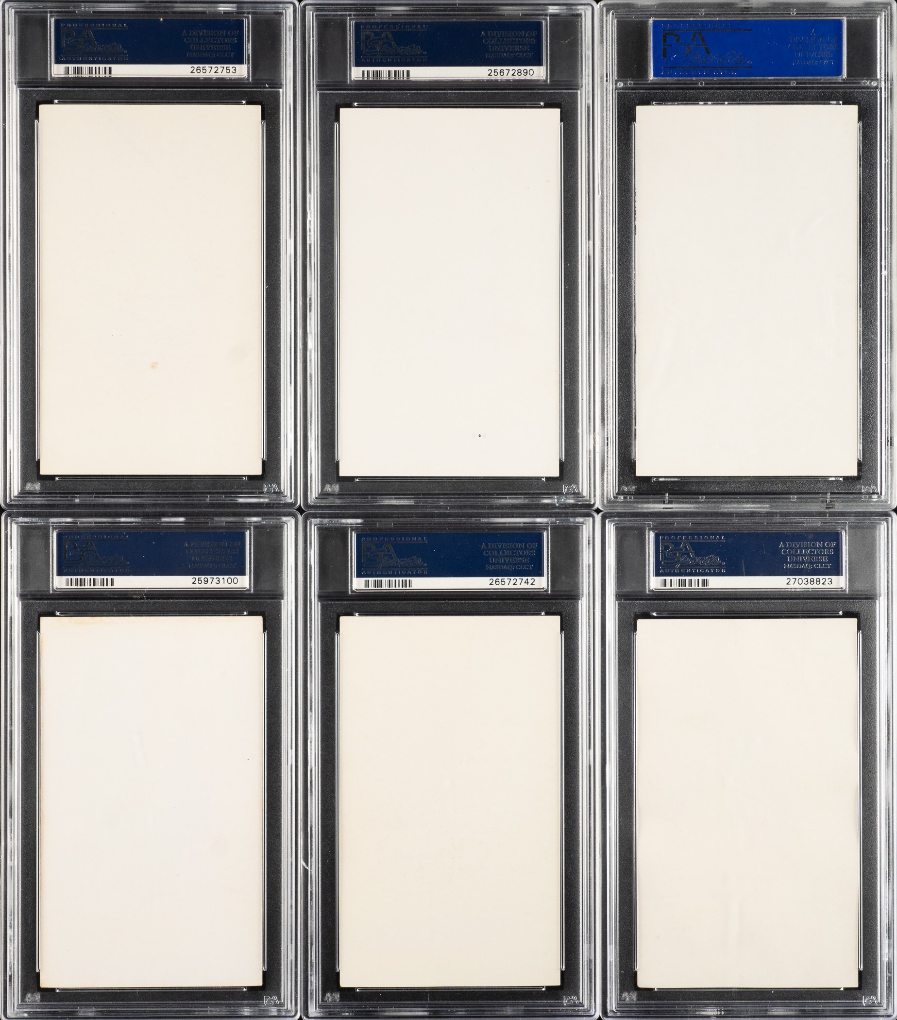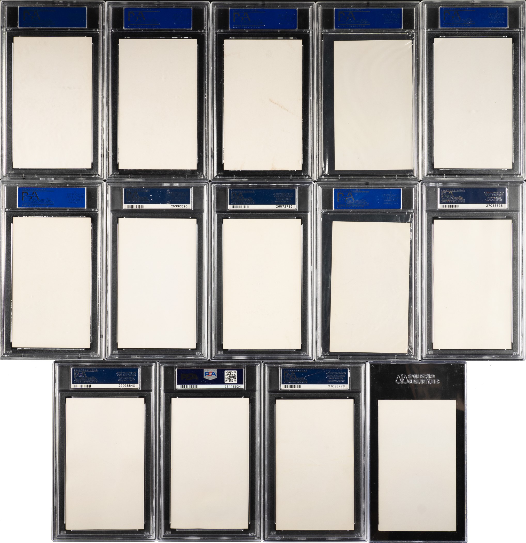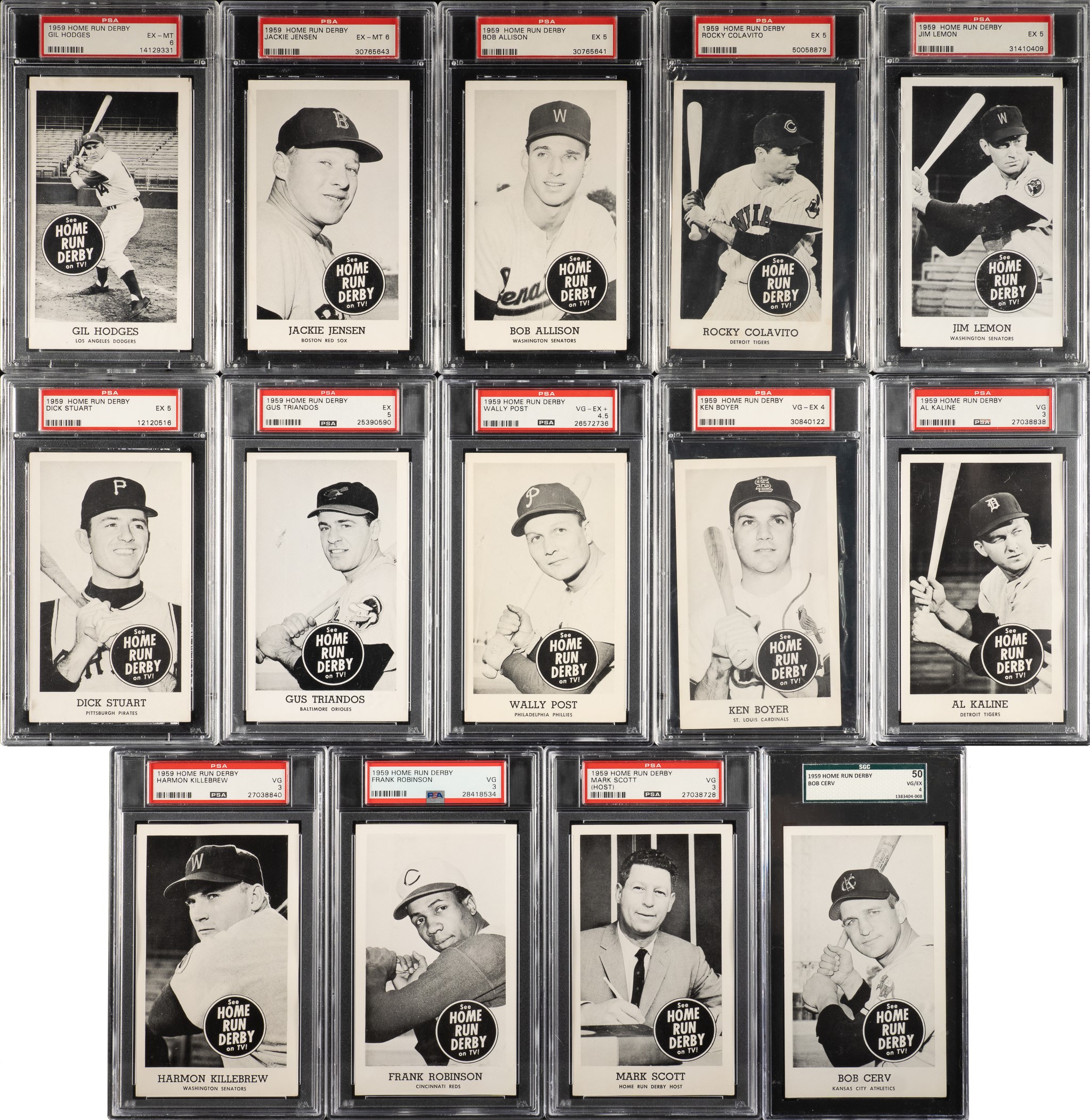 Presented is a rare and exceptionally attractive twenty-card complete set of 1959 Home Run Derby highlighted by nine Hall of Famers, including Mickey Mantle, Hank Aaron, and Willie Mays. This set was issued to promote the popular Home Run Derby television series, which was broadcast weekly and pitted power hitters against one another in a made-for-television home run hitting contest. Each of the players featured on these black-and-white cards, which measure 3.25 by 5.25 inches, was a contestant in at least one of the televised contests. Complete sets of these cards are very rarely offered, and examples are highly desirable among player and set collectors alike. The Home Run Derby card set is composed primarily of stars, featuring all of the great home run sluggers of the era including, Aaron, Banks, Hodges, Kaline, Killebrew, Mantle, Mathews, Mays, F. Robinson, and Snider. Each card has been professionally graded and encapsulated by PSA (19) and SGC (1, noted below). PSA Grading Composite: EX-MT 6 (3 cards): Hodges, Jensen and Mays. EX 5 (6 cards): Allison, Banks, Colavito, Lemon, Stuart and Triandos. VG-EX+ 4.5 (2 cards): Mathews and Post. VG-EX 4 (3 cards): Boyer, Cerv (SGC), and Snider.VG 3 (5 cards): Kaline, Killebrew, Mantle, Robinson and Scott. GOOD 2 (1 card): Aaron. Each example displays a crisp, well-centered image with a clean, blank reverse. This a tremendous opportunity to add this very scarce set with numerous highlights to any advanced collection. Total: 20 cards. Opening Bid $2,500.
