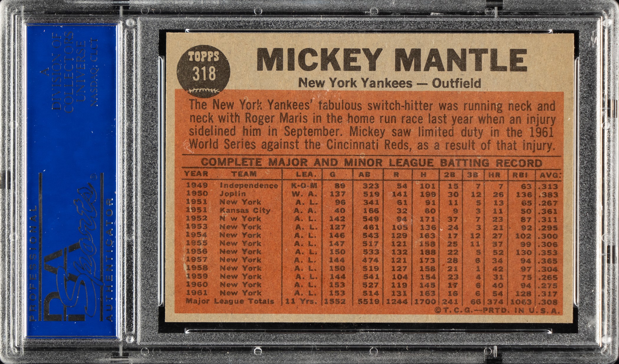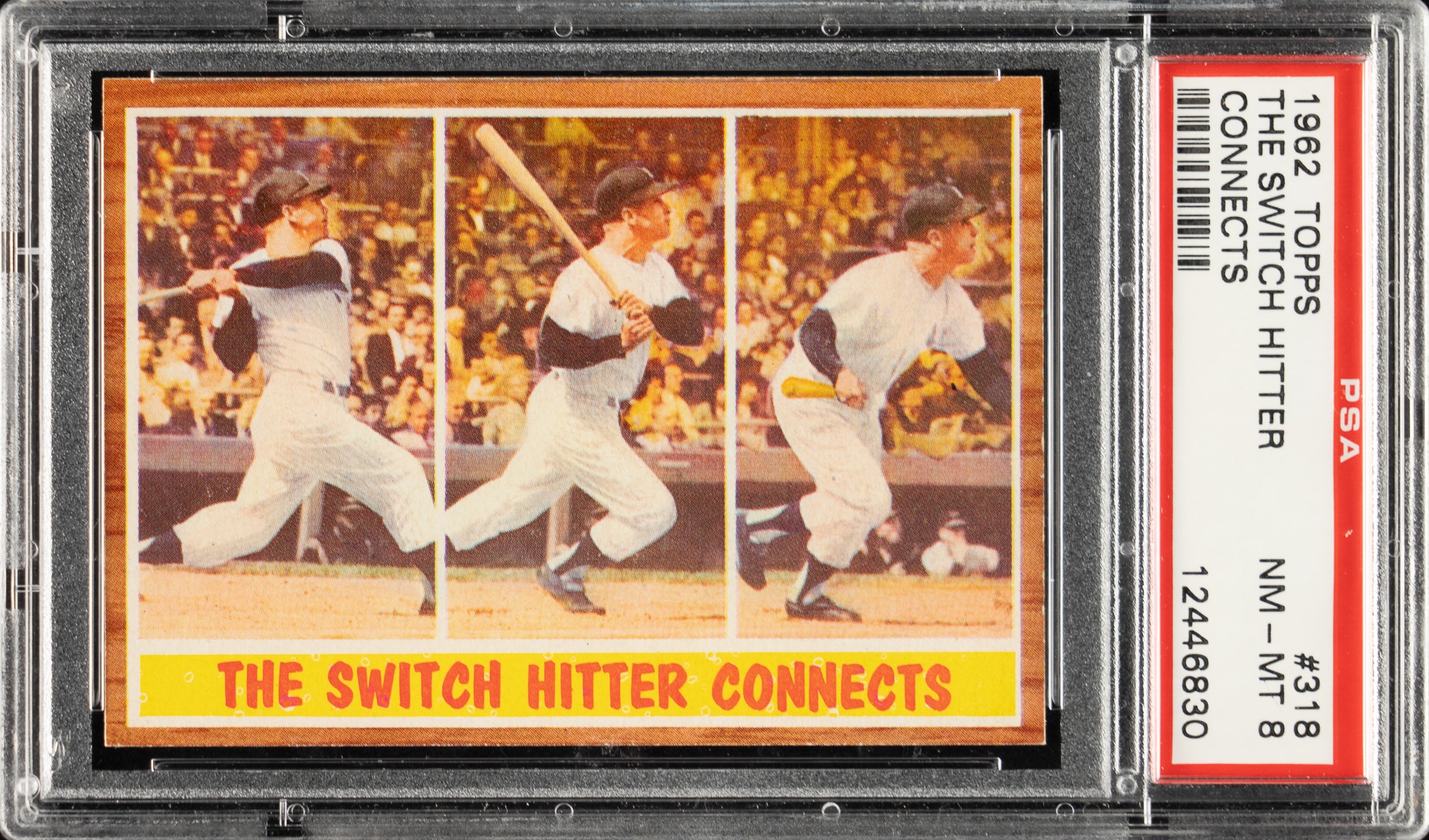 1962 Topps #318 The Switch Hitter Connects with Mickey Mantle PSA NM-MT 8