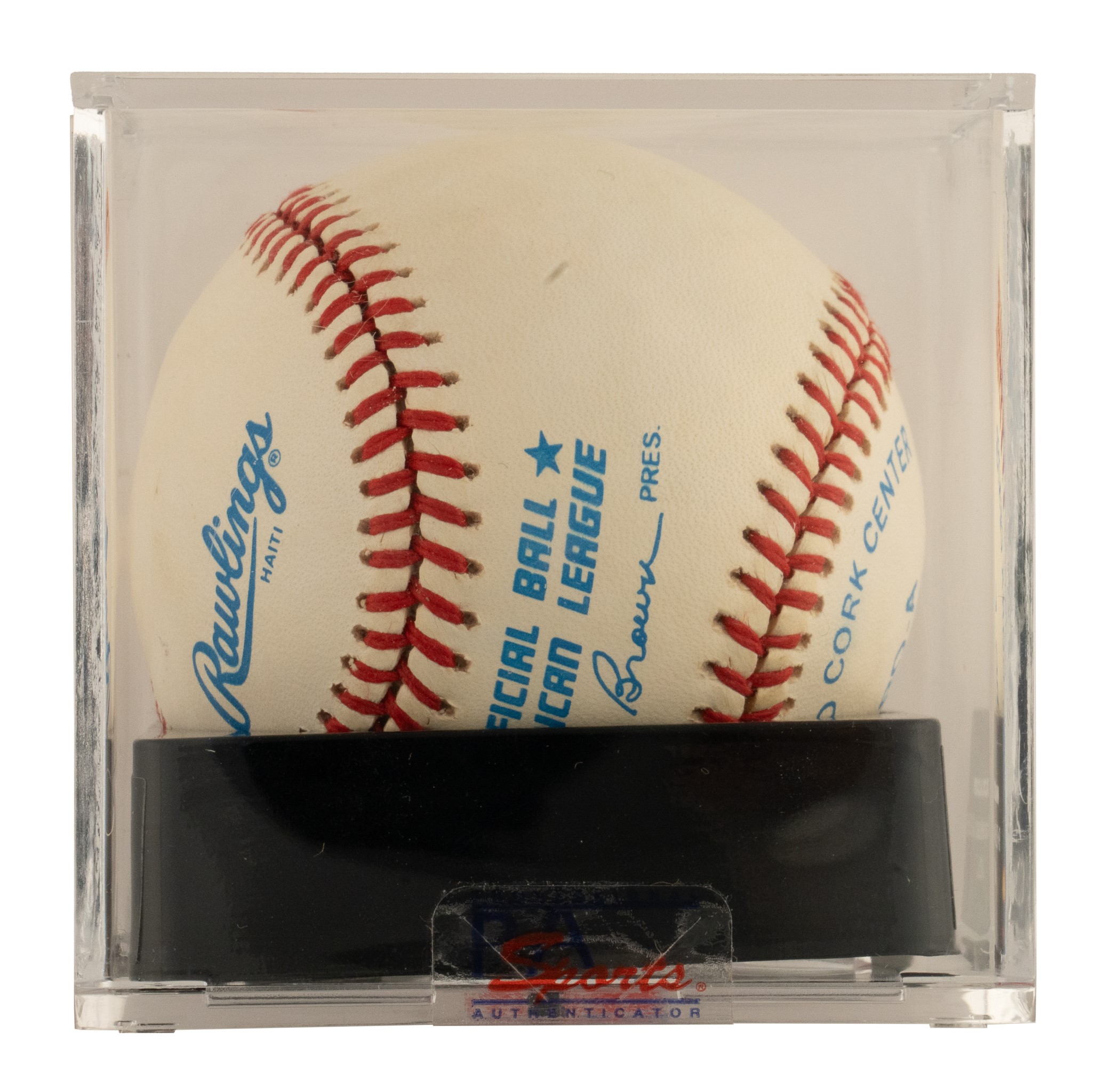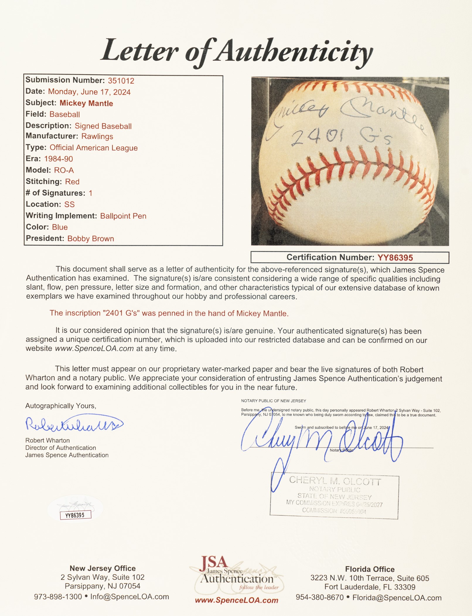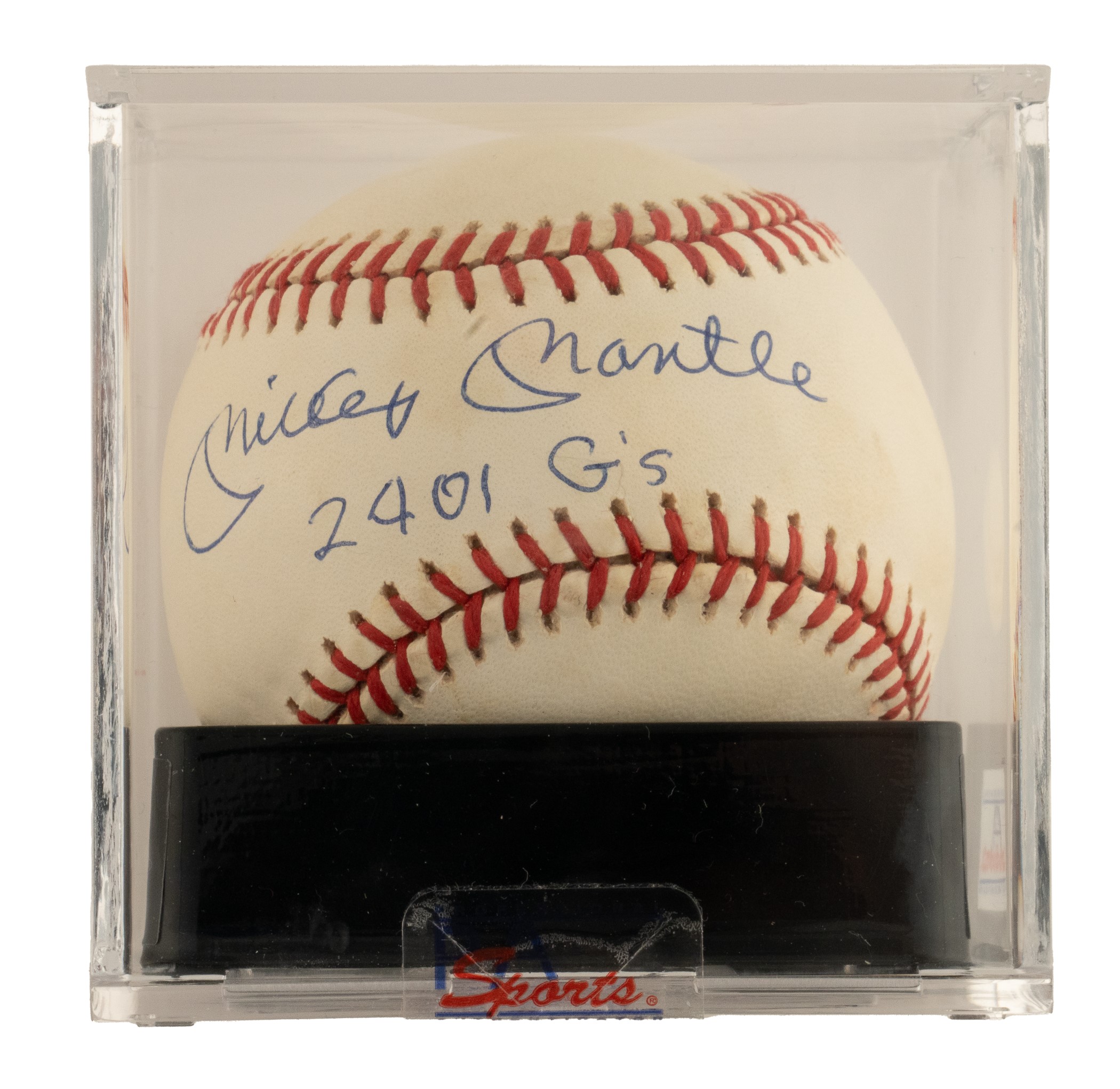 Mickey Mantle single-signed baseball featuring a special inscription. Mantle has signed the official American League baseball (Brown) in blue ink across the sweet spot, where he has also added the following notation below his name: "2401 G's." Graded NM-MT 8 by PSA/DNA (autograph grade of "9," ball grade of 7," resulting in a final grade of "8"). Full LOA from PSA/DNA and Full LOA from James Spence/JSA. Opening Bid $300.