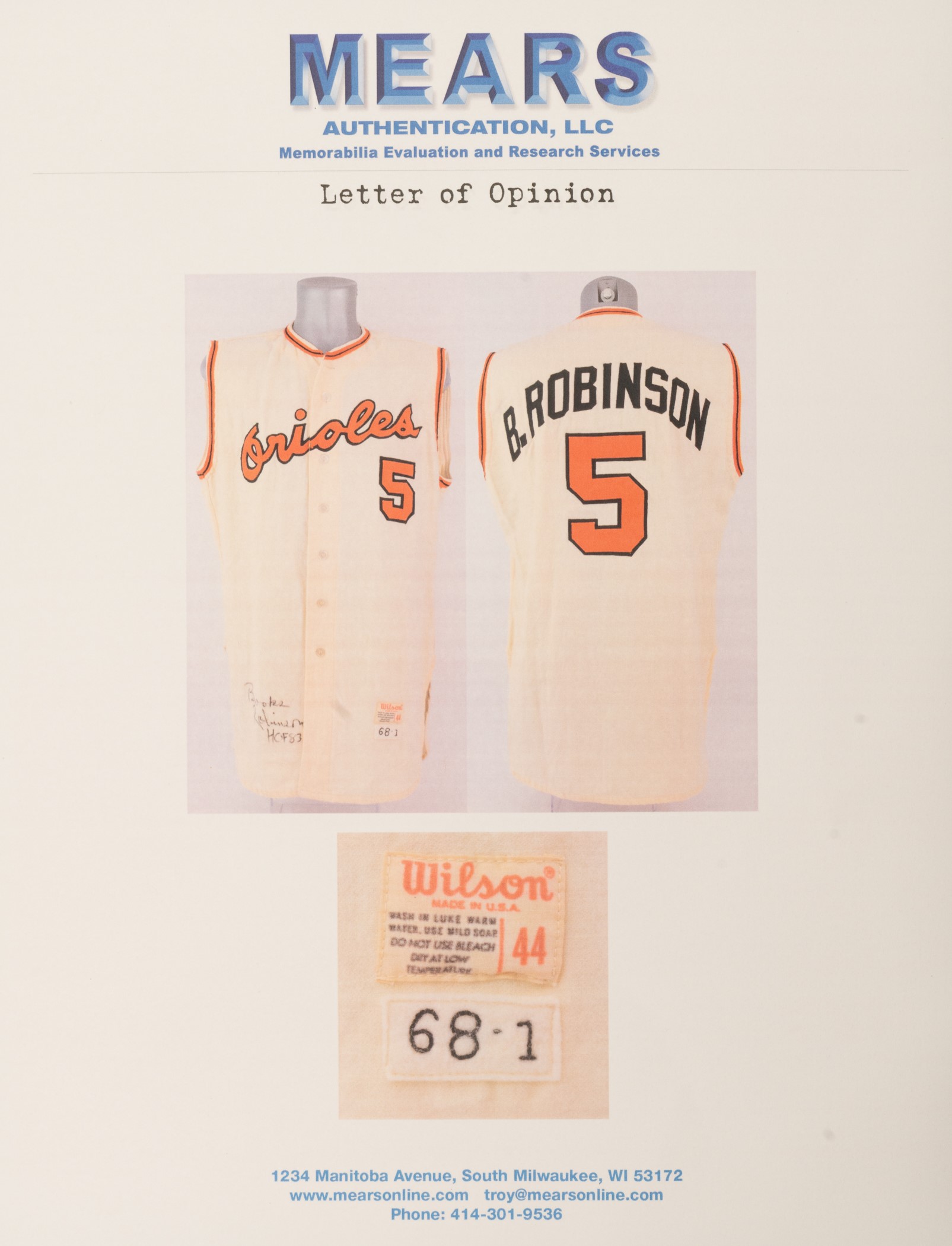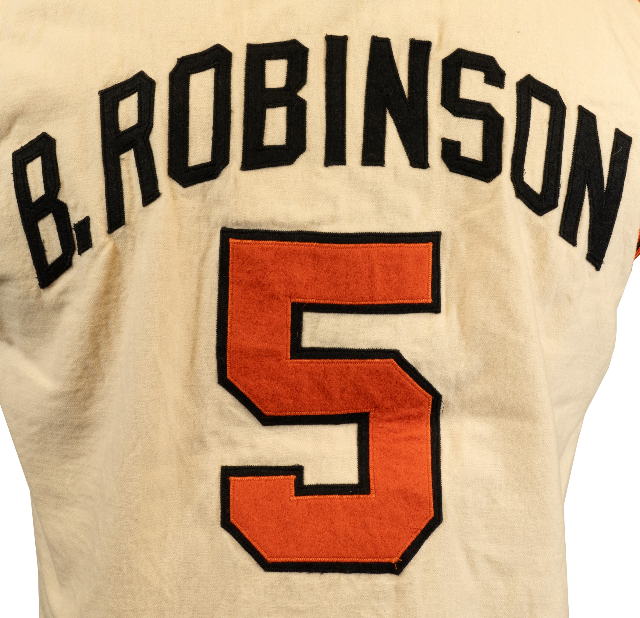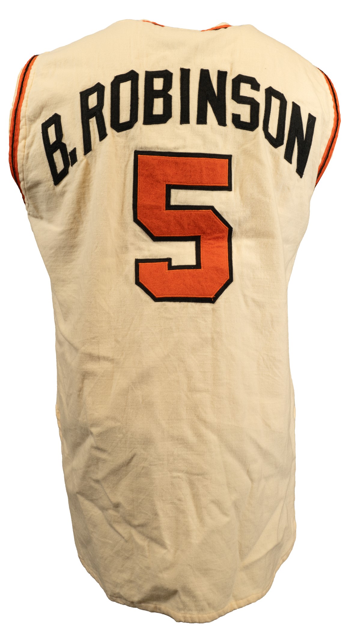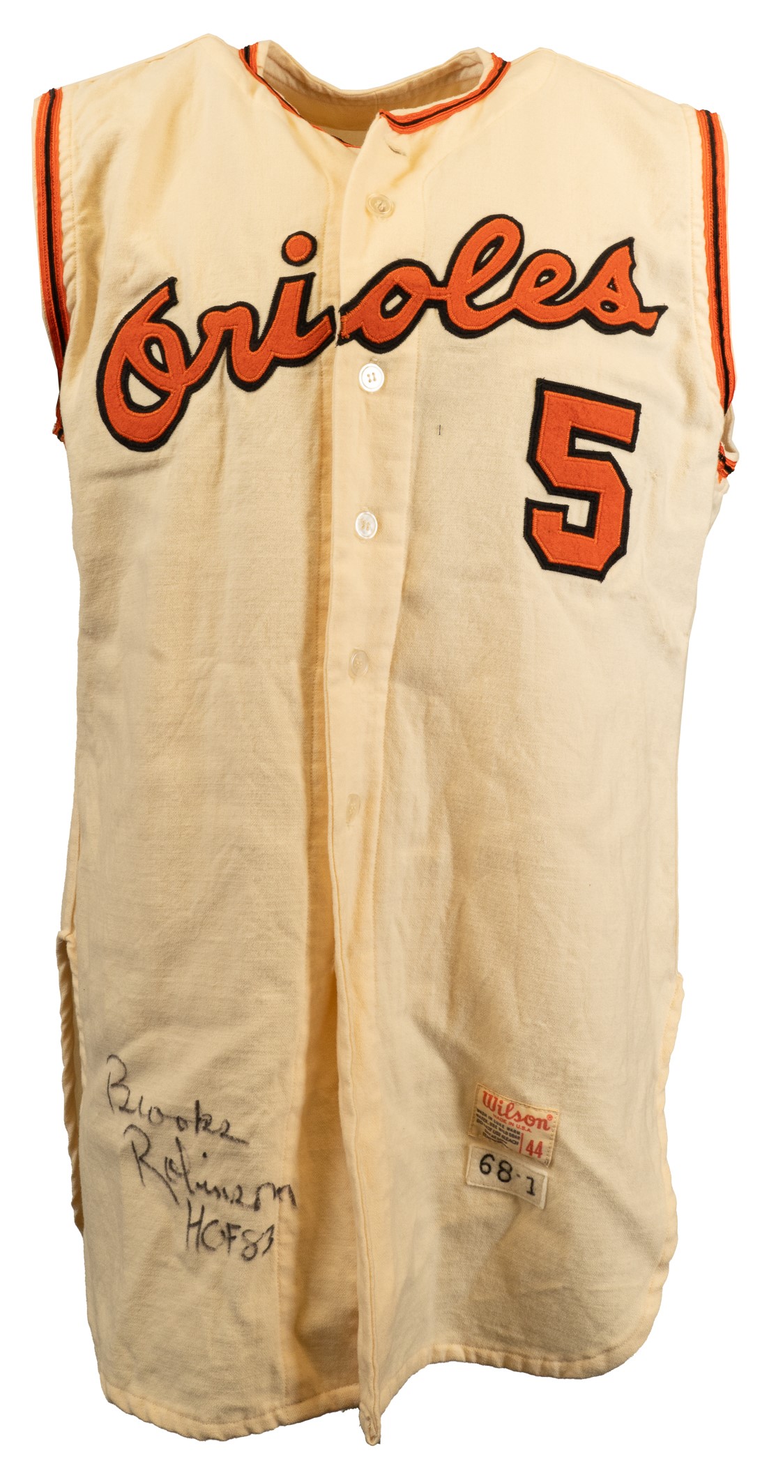 Extremely rare Baltimore Orioles home vest-style jersey worn by Hall of Fame third baseman Brooks Robinson. Graded A9 by MEARS. The Baltimore Orioles interspersed this vest version of their home jersey into game uniforms worn throughout the 1968 and 1969 seasons. Though the jersey is tagged "68-1" under the "Wilson 44" label, it is possible that this jersey also carried over into the 1969 season because they were not used as frequently as traditional tops. The white flannel jersey is lettered "Orioles" across the front and features the number "5" on the left breast and reverse. "B. Robinson" is lettered on the reverse directly above the number. All front letters, as well as all front and reverse numerals, are appliquéd in orange on black tackle twill. All reverse letters are appliquéd in black tackle twill. MEARS has noted in its letter of opinion that there is evidence of restoration to the reverse nameplate, which is responsible for the one-point deduction. The jersey is otherwise original as issued. It presents exceptionally well and displays light wear overall. Robinson batted .253 with 17 home runs and 75 RBI in 1968. He also led the Orioles in games played (162), at-bats (608), hits (154), doubles (36) and triples (6). Considered to be the greatest fielding third baseman in history, Robinson won his ninth (out of an eventual record sixteen) consecutive Gold Glove Award at season's end. This is an exceptional Robinson flannel of this rare vest style that would be at home in even the most advanced collection. Graded A9 by MEARS (base grade of 10 with one point deducted for alteration on reverse nameplate). Full LOA from MEARS. Opening Bid $5,000.