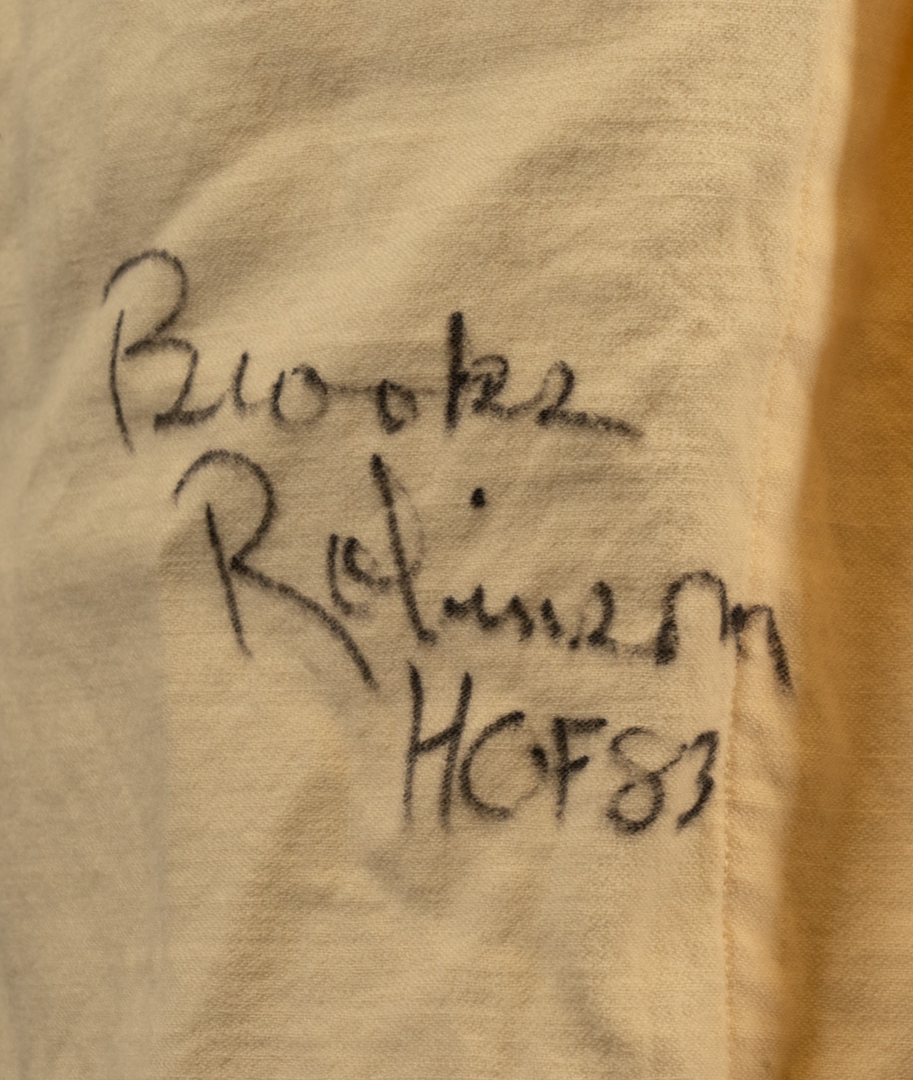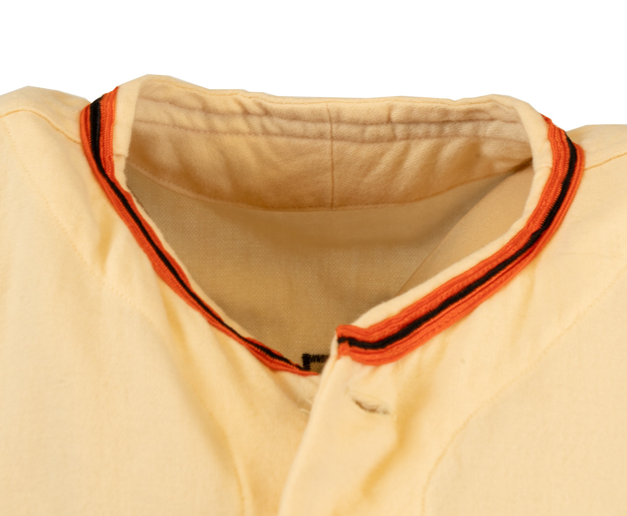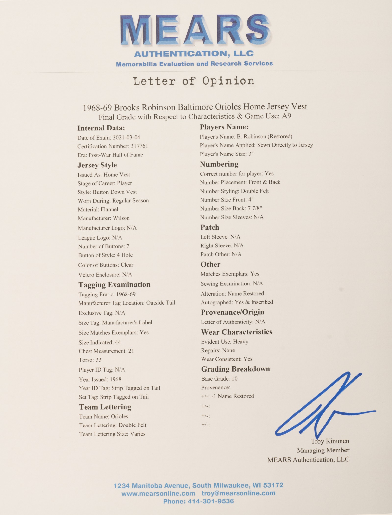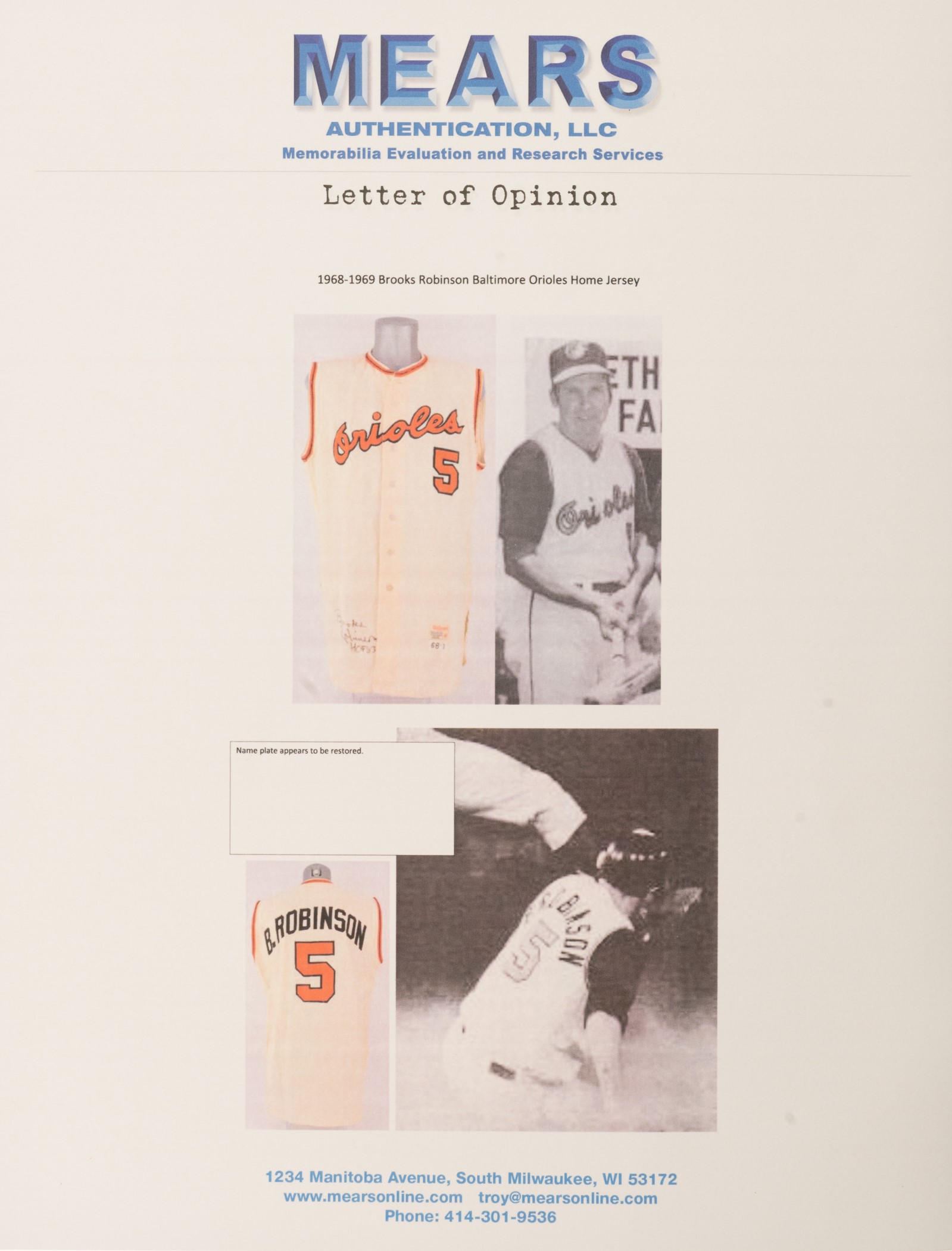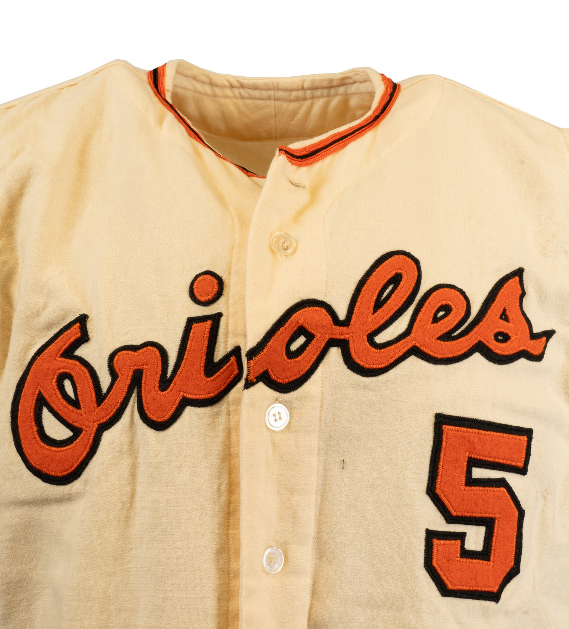 Extremely rare Baltimore Orioles home vest-style jersey worn by Hall of Fame third baseman Brooks Robinson. Graded A9 by MEARS. The Baltimore Orioles interspersed this vest version of their home jersey into game uniforms worn throughout the 1968 and 1969 seasons. Though the jersey is tagged "68-1" under the "Wilson 44" label, it is possible that this jersey also carried over into the 1969 season because they were not used as frequently as traditional tops. The white flannel jersey is lettered "Orioles" across the front and features the number "5" on the left breast and reverse. "B. Robinson" is lettered on the reverse directly above the number. All front letters, as well as all front and reverse numerals, are appliquéd in orange on black tackle twill. All reverse letters are appliquéd in black tackle twill. MEARS has noted in its letter of opinion that there is evidence of restoration to the reverse nameplate, which is responsible for the one-point deduction. The jersey is otherwise original as issued. It presents exceptionally well and displays light wear overall. Robinson batted .253 with 17 home runs and 75 RBI in 1968. He also led the Orioles in games played (162), at-bats (608), hits (154), doubles (36) and triples (6). Considered to be the greatest fielding third baseman in history, Robinson won his ninth (out of an eventual record sixteen) consecutive Gold Glove Award at season's end. This is an exceptional Robinson flannel of this rare vest style that would be at home in even the most advanced collection. Graded A9 by MEARS (base grade of 10 with one point deducted for alteration on reverse nameplate). Full LOA from MEARS. Opening Bid $5,000.