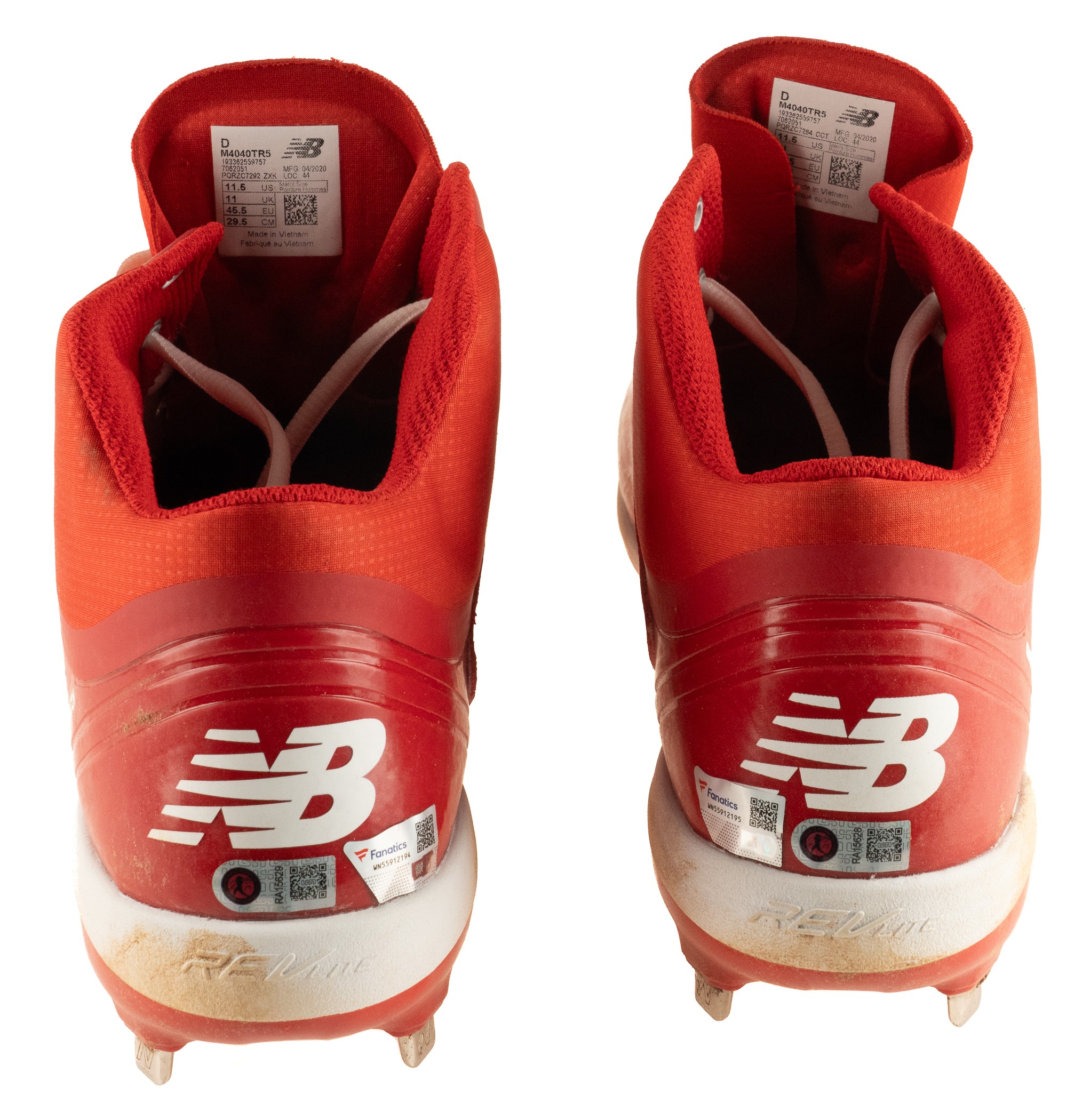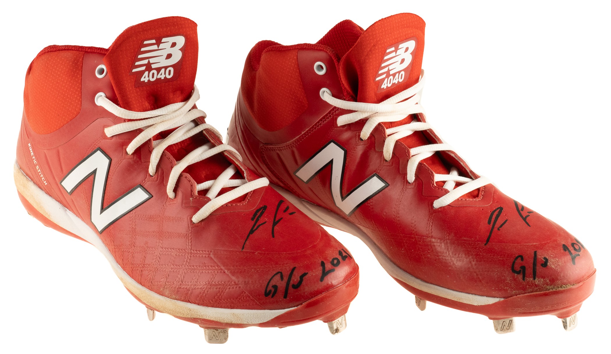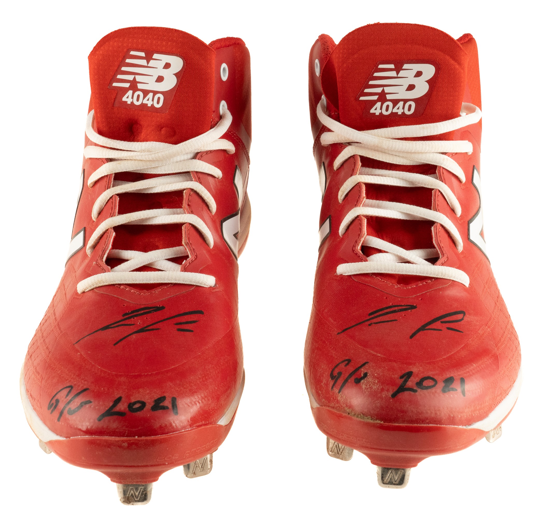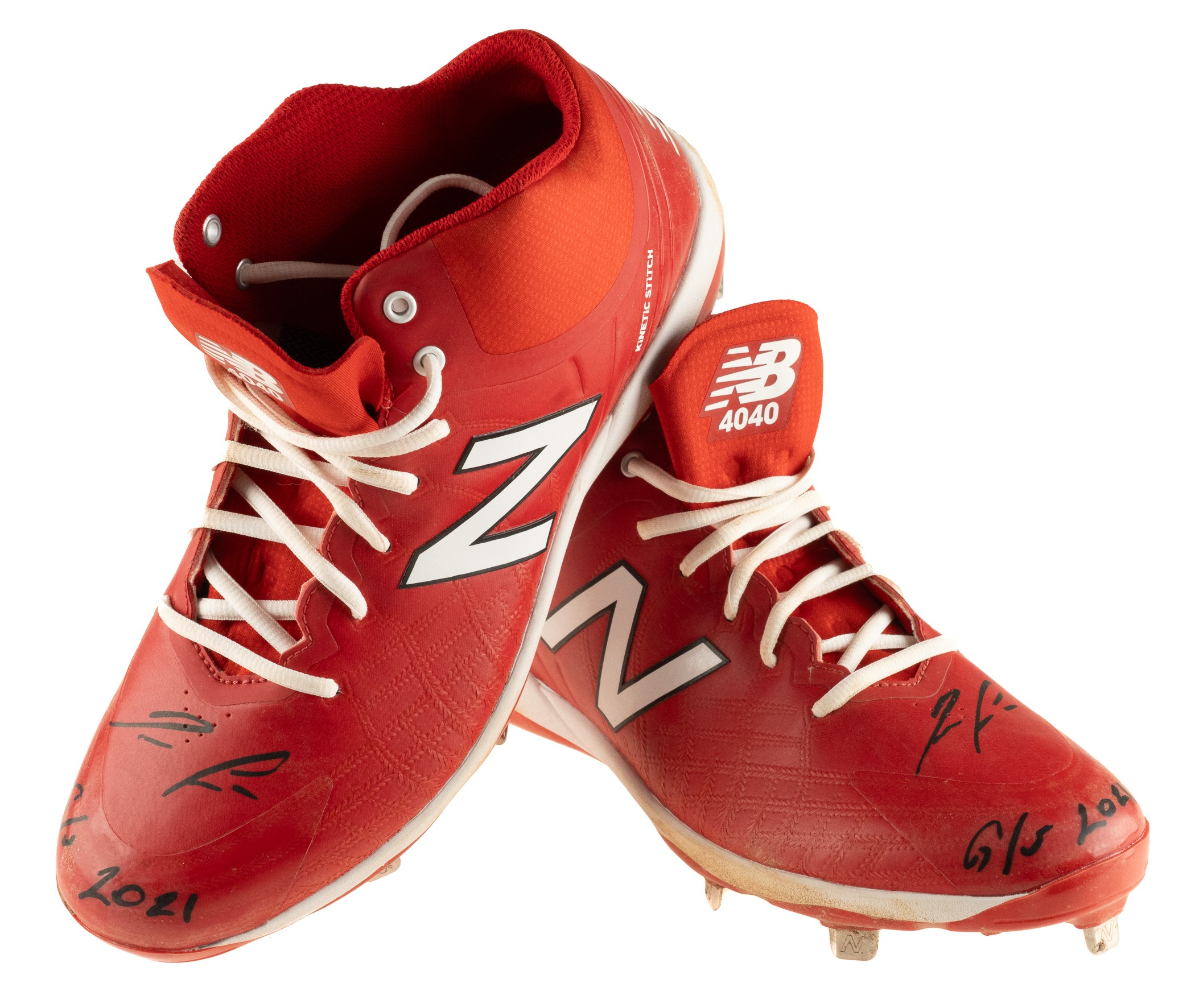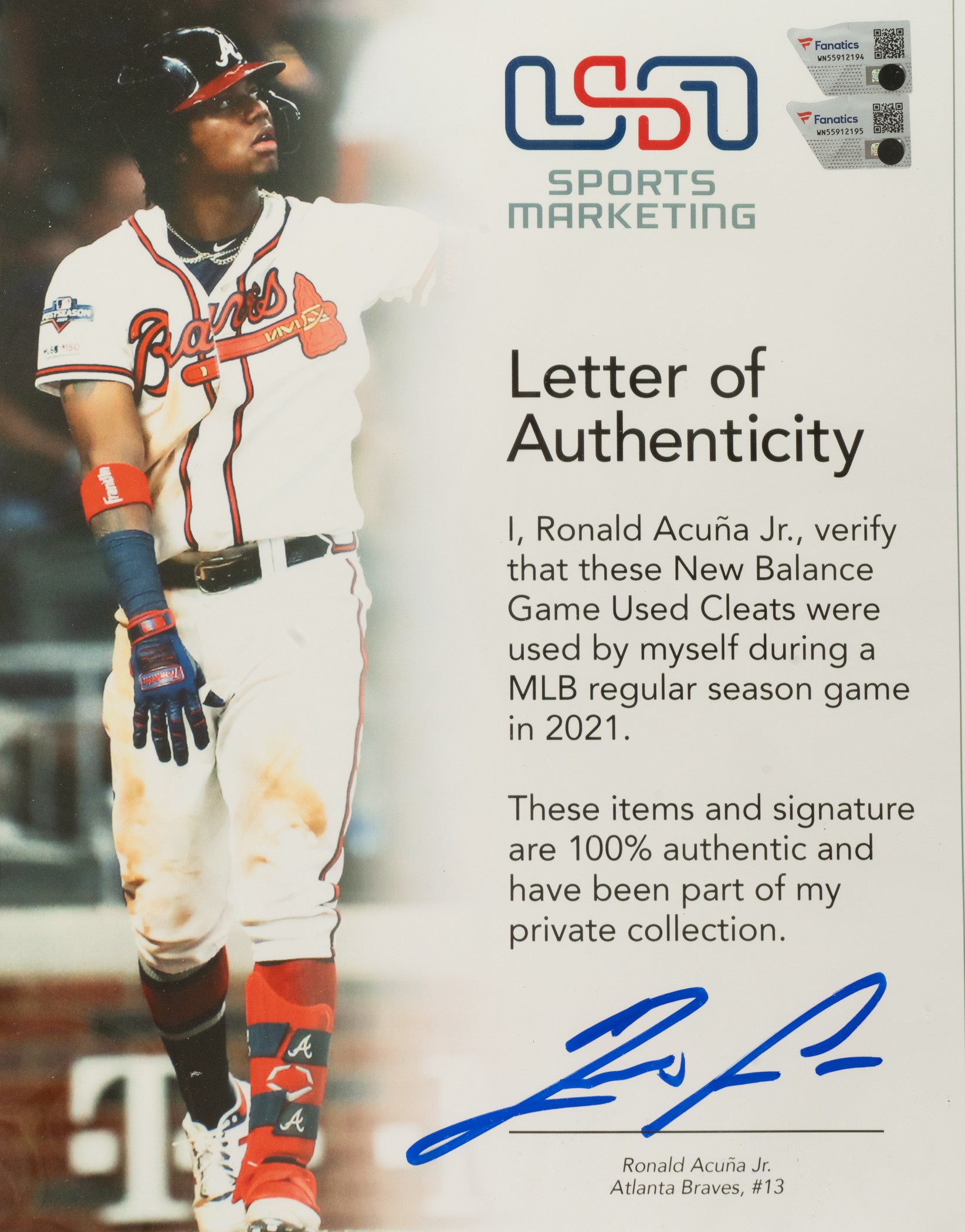 Superb pair of game-used cleats worn during the 2021 season by Atlanta Braves superstar Ronald Acuna Jr. Each of the New Balance RevLite cleats (size 11.5) has been signed on the toe by Acuna Jr in black marker with the added notation of "G/U 2021" attesting to their use during the 2021 season. The cleats display heavy wear in accordance with their game usage. Both cleats have small hologram stickers from USA Sports Marketing and Fanatics on the heel. Accompanied by a LOA from USA Sports Marketing which has been signed by Acuna Jr. verifying the cleats' game usage. An outstanding pair of game-used cleats that would be a worthy addition to any Ronald Acuna Jr. collection. Total: 2 cleats. The size/weight of this item requires that there will be an additional shipping charge for this lot. Opening Bid $500.