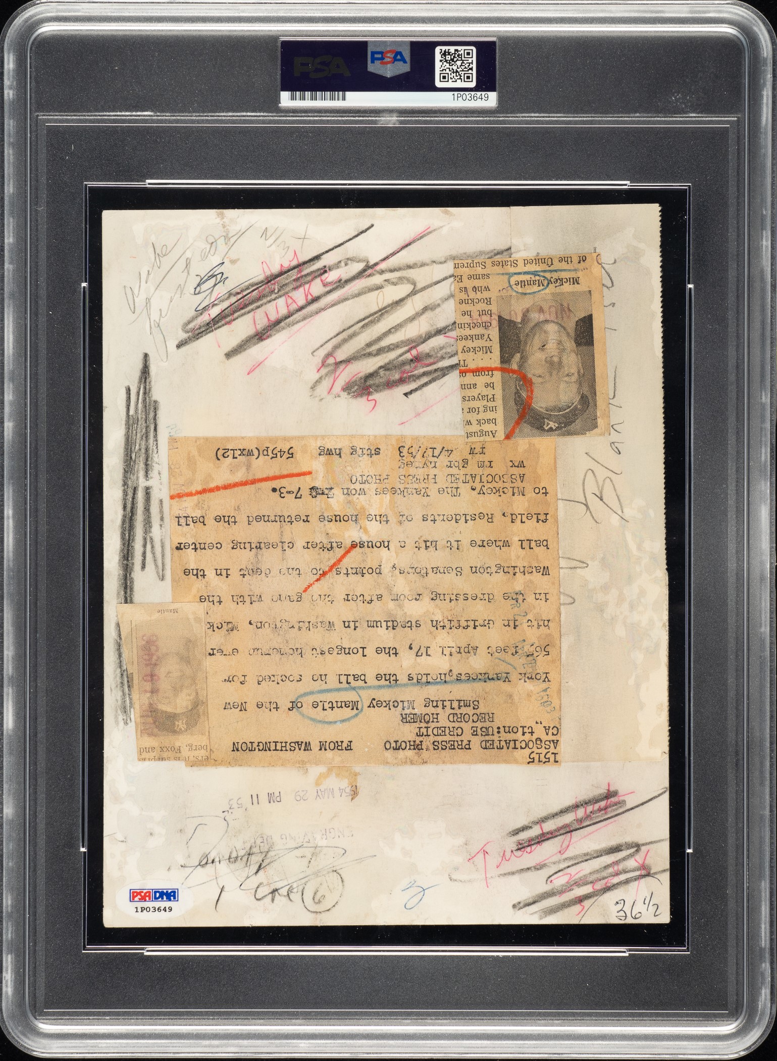Original news photo capturing Mickey Mantle holding the ball that he hit for his historic 565-foot "tape-measure" home run in a game against the Washington Senators on April 17, 1953. Encapsulated and certified as an original Type I photograph by PSA/DNA (a corresponding sticker affixed to the reverse). The epic blast, served up by Senators pitcher Chuck Stobbs in the top of the fifth inning, cleared the 50-foot left-field wall and just kept going, eventually landing in the backyard of a house on 434 Oakdale Street. Following the game Yankees' publicist Arthur "Red" Patterson, recognizing a great opportunity when he saw it, calculated the distance at 565 feet, thereby coining the phrase "tape-measure" home run, even though no one actually measured the distance covered by the ball. Even though current historians dispute the exact number of feet the ball traveled through the air, there was no doubt it was one of the longest home runs anyone had ever seen, thereby forever preserving its lofty spot in the annals of baseball lore. The original paper news caption, dated "4/17/53," appears on the reverse as well as a newspaper clipping, a date stamp, and a number of editorial notations. The photo (7 x 9 inches) is scored on the upper-left, has moderate creasing, and light toning in the lower-left. In Fair condition overall. Opening Bid $300.