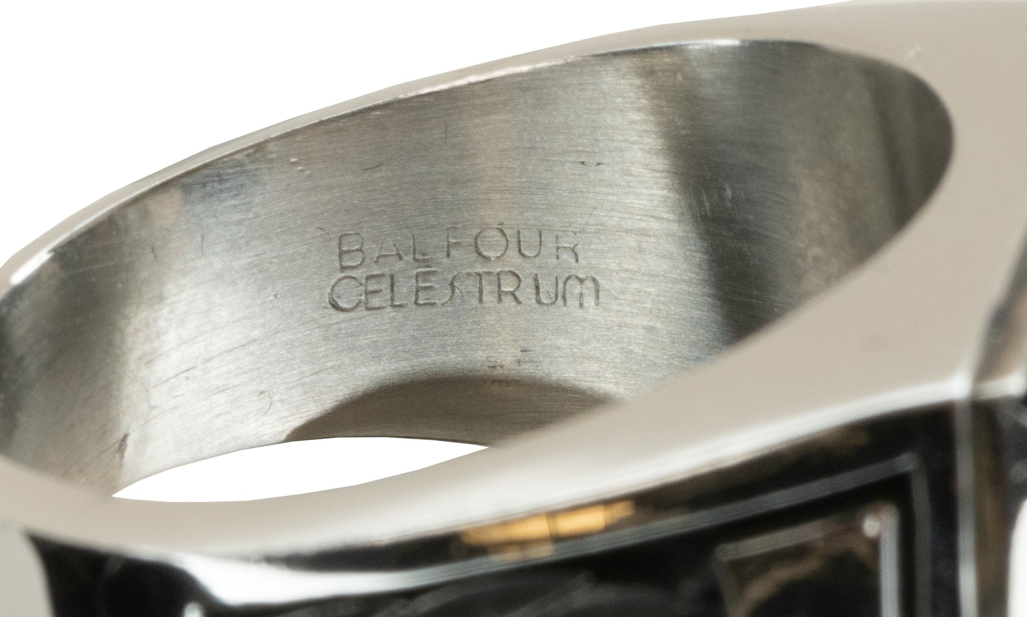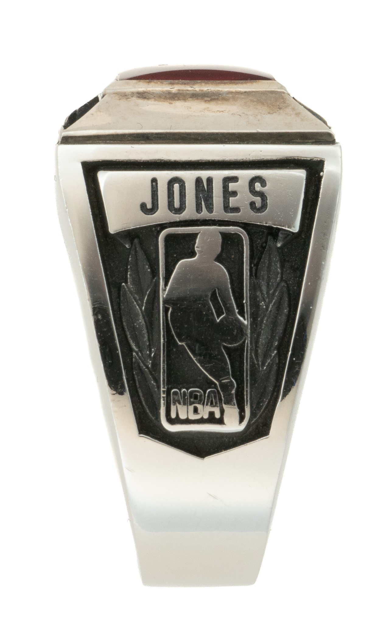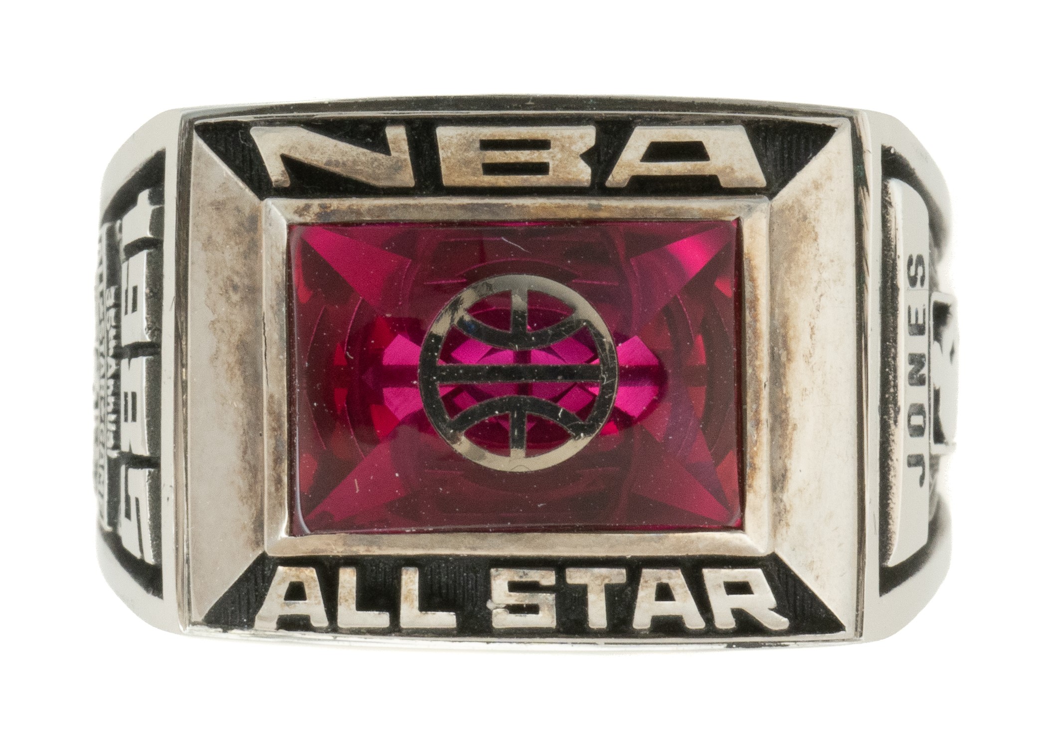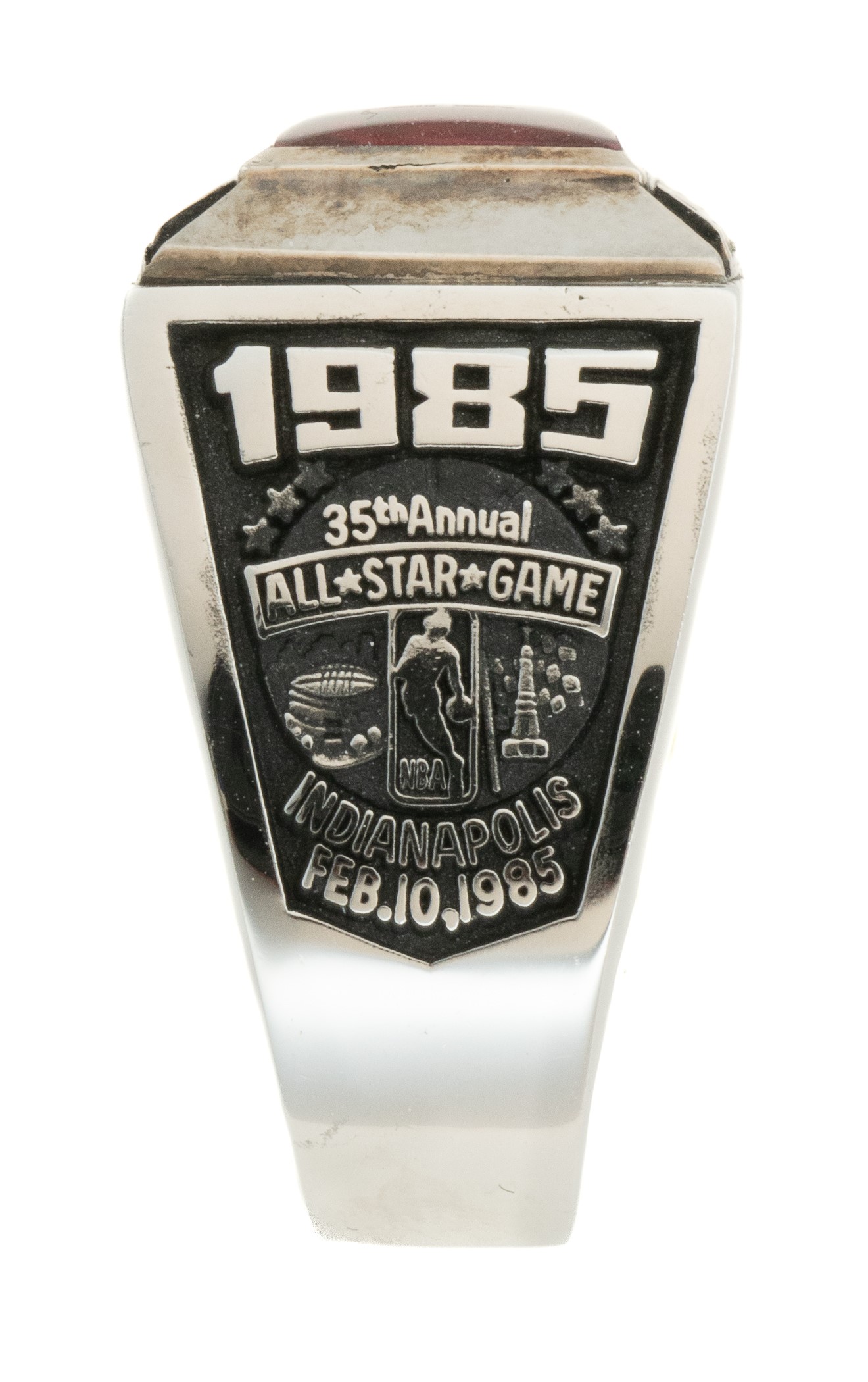 1985 NBA All-Star Game ring issued to Hall of Famer K. C. Jones for his participation as head coach of the East squad. This ring originates directly from the K. C. Jones estate. The silver-colored ring features a red synthetic stone on the front, with a basketball insignia in the center. "NBA All Star" is lettered along the bezel. One shank features the name "Jones" above the "NBA" logo. The opposite shank displays the year ("1985") and the "All Star Game" logo (the game was played in Indianapolis). "Balfour Celestrum" is engraved on the interior band. The ring remains in Near Mint condition. Size: approximately 12. Opening Bid $2,000.