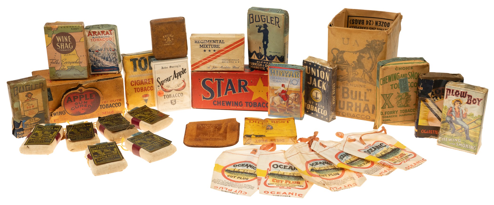 Offered is an eclectic collection of 29 various tobacco packages. The collection consists of the following: 1) Plow Boy Chewing & Smoking sealed pack, 2.75 x 4.5 x 1 inches, Vg. 2-8) Six Bull Durham small retail pouches plus original bulk retailer's box, 2.25 x 3.5 x .75 inches, three Ex, Vg, Gd, and Fr. The box (4 x 4 x 7.25 inches) is in Fr condition. 9) Fatima Cigarettes leather slipcase, 2.5 x 3 x 1 inches, Gd. 10) Union Jack Cut Plug Tobacco sealed pack, 2.75 x 4.5 x 1 inches, Vg. 11) Bugler tobacco sealed pack (no cellophane wrapping), 3 x 4.75 x 1 inches, Gd. 12) Bugler tobacco sealed pack, 2.5 x 4 x .5 inches, Pr. 13) Himyar tobacco sealed pack (no cellophane wrapping), 2.5 x 4 x .75 inches, large tear on back, Pr. 14) Wine Shag tobacco sealed pack, 2.75 x 4 x .75 inches, Vg. 15) Ararat tobacco sealed pack (no cellophane wrapping), 2.25 x 3.5 x .5 inches, a few tiny tears, Pr. 16) Roll Rite tobacco pack (no cellophane wrapping), 3 x 4.5 x 1 inches, a few tiny tears, Pr. 17) Snow Apple tobacco pack (no cellophane wrapping), 2.75 x 4.25 x 1 inches, Gd. 18) Top Cigarette Tobacco sealed pack, 3 x 4.5 x .75 inches, Gd. 19) American Navy Plug Tobacco leather pouch, 4 x 4 inches, Gd. 20) Dill's Best tobacco sealed pack, 3.5 x 3 x .75 inches, Gd. 21) Choice Chewing and Smoking tobacco sealed pack (no cellophane wrapping), 3.5 x 5 x 1.25 inches, Gd. 22) Regimental Mixture sealed pack, 4 x 2.75 x 1 inches, Vg. 23) Star Chewing Tobacco full box, 7 x 3 x 2 inches, Fr. 24) Apple Sun Cured Chewing Tobacco full box, 6.25 x 3 x 3 inches, Fr. 25-29) Five Oceanic Cut Plug tobacco empty pouches, 4 x 5 inches, Vg. Total: 29 items. The size/weight of this item requires that there will be an additional shipping charge for this lot. Opening Bid $200.