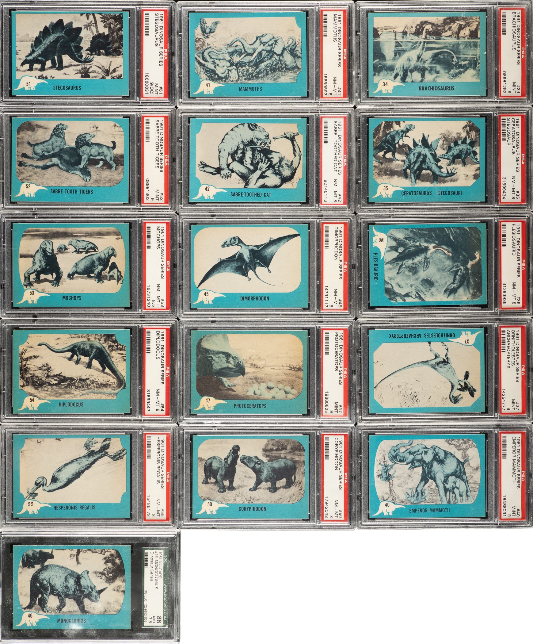 Presented is a very attractive 80-card complete set of 1961 Nu-Card "Dinosaur Series." Fifty-two cards are graded and encapsulated by PSA (51) and SGC (1). Grading Composite: GEM MT 10 (1 card): #24. MINT 9 (18 cards): #8, 9, 11, 13 (OC), 26, 30, 32, 34, 37, 40, 47, 51 (OC), 52, 57, 61, 64 (OC), 68. and 80. NM-MT+ 8.5 (1 card): #53. NM-MT 8 (29 cards): #1, 2, 3, 5, 7, 10, 12, 15, 35, 36, 41, 42, 45, 50, 54, 55, 56, 62, 65, 66, 69, 72, 73, 74, 75, 76, 77, 78, and 79. NM 7 (3 cards): #27, 33, and 46 (SGC NM+ 7.5). The condition of the twenty-eight unencapsulated cards is 25% Nr/Mt to Nr/Mt-Mt, 46% Ex to Ex-Mt, and 29% Vg to Vg-Ex (including a couple that measure small). Very attractive mid- to high-grade set of these popular cards from the 1960s. Total: 80 cards. The size/weight of this item requires that there will be an additional shipping charge for this lot. Opening Bid $200.