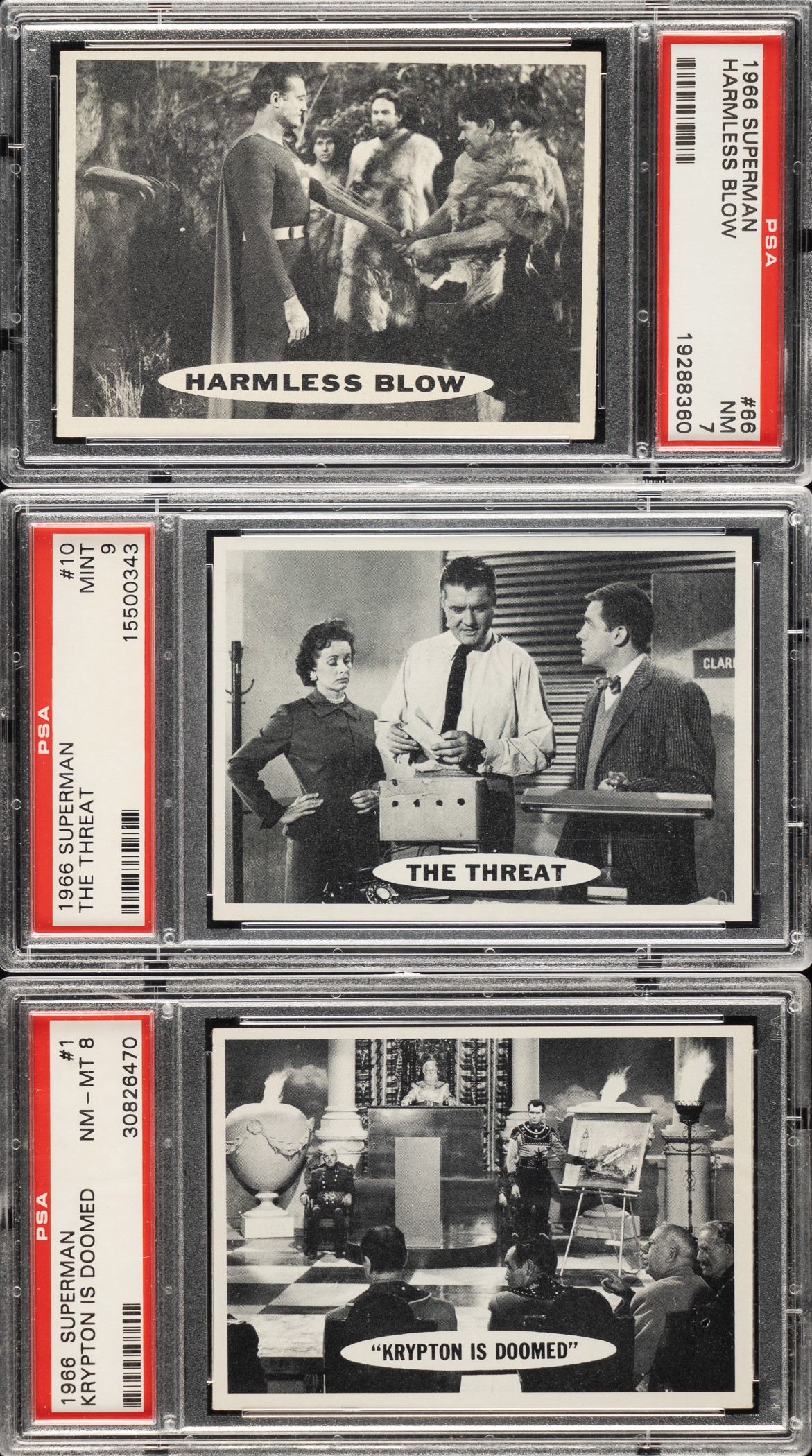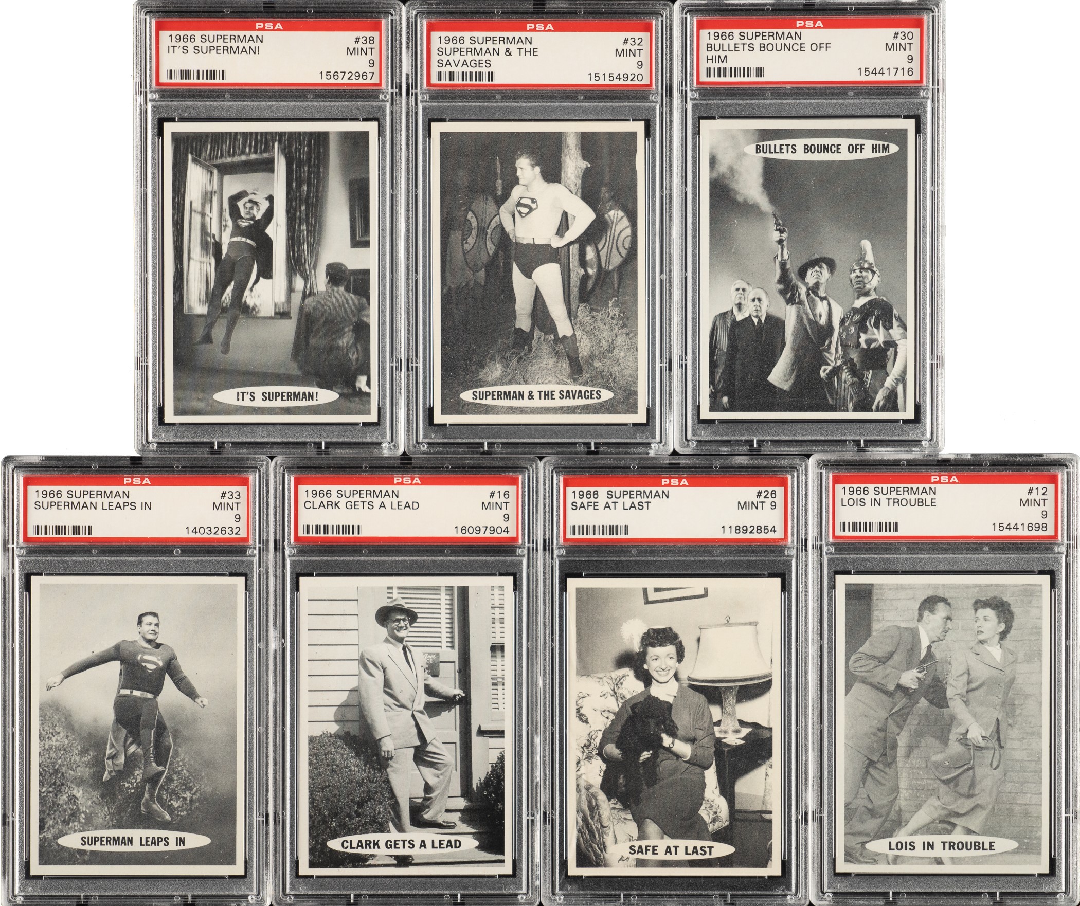 Presented is a complete 66-card set of 1966 Topps "Superman" trading cards, entirely graded and encapsulated by PSA. This set currently ranks ninth on the PSA Set Registry with an impressive 8.40 GPA. This is an extraordinary set, high quality throughout, with a simply amazing degree of consistency. A tremendous amount of time and energy has been invested in the assembly of this high-grade set. Grading Composite: MINT 9 (22 cards): #6, 10, 11, 12, 13. 16, 25, 26, 28, 30, 32, 33, 37, 38, 49, 50, 55, 56, 57, 58, 60, and 63. NM-MT+ 8.5 (11 cards): #2, 3, 14, 22, 31, 34, 35, 53, 54, 62, and 64. NM-MT 8 (32 cards): #1, 4, 5, 7, 8, 9, 15, 17, 18, 19, 20, 21, 23, 24, 27, 29, 36, 39, 40, 41, 42, 43, 44, 45, 46, 47, 48, 51, 52, 59, 61, and 65. NM 7 (1 card): #66. This is a remarkable high-grade complete set of one of the most popular of all 1960s non-sport issues. The total SMR value for the assigned grades (factoring in the eleven half grades at the lower whole-grade level) is $3,855. Total: 66 cards. The size/weight of this item requires that there will be an additional shipping charge for this lot. Opening Bid $500.