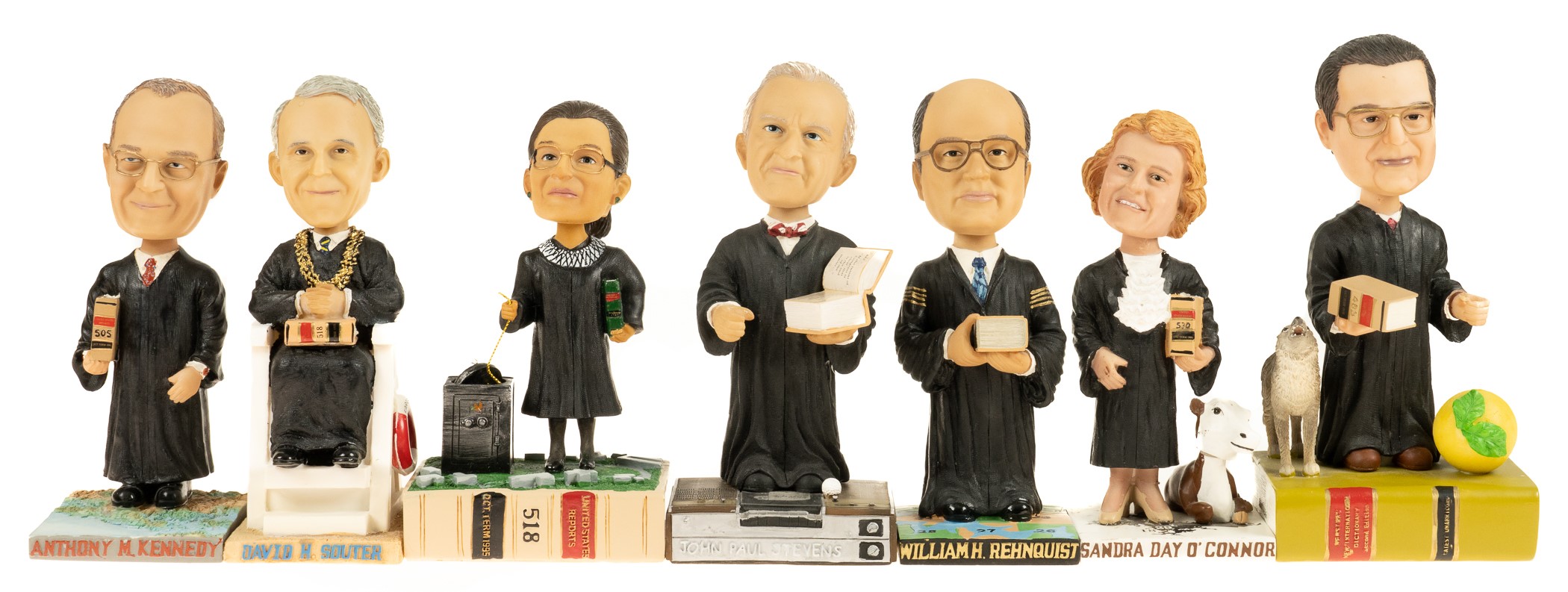 Rehnquist's likeness kicked off the project in 2003, and he was followed closely by Justices Sandra Day O'Connor and John Paul Stevens the following year. In 2006, Justice Antonin Scalia joined the series, with Justices Anthony Kennedy and Benjamin Curtis, the first non-active jurist to be featured, coming in 2007. From that point onward, the series would focus on both current and past members of the Court. In total, 27 Supreme Court Justices have been produced to date and comprise a complete set. There have been a few variations produced over the years for limited release associated with conferences, universities, and even a Fantasy Law competition. The set is expected to expand later this year with the issuance of a bobblehead of Justice Elena Kagan. Each of the bobbleheads is designed with representations of notable decisions rendered by the Justice, which makes for some fascinating depictions, including Justice Brandeis atop a train (referencing the decision in Erie Railroad) and Justice Blackmun with a place for a baseball (referencing the Curt Flood decision).