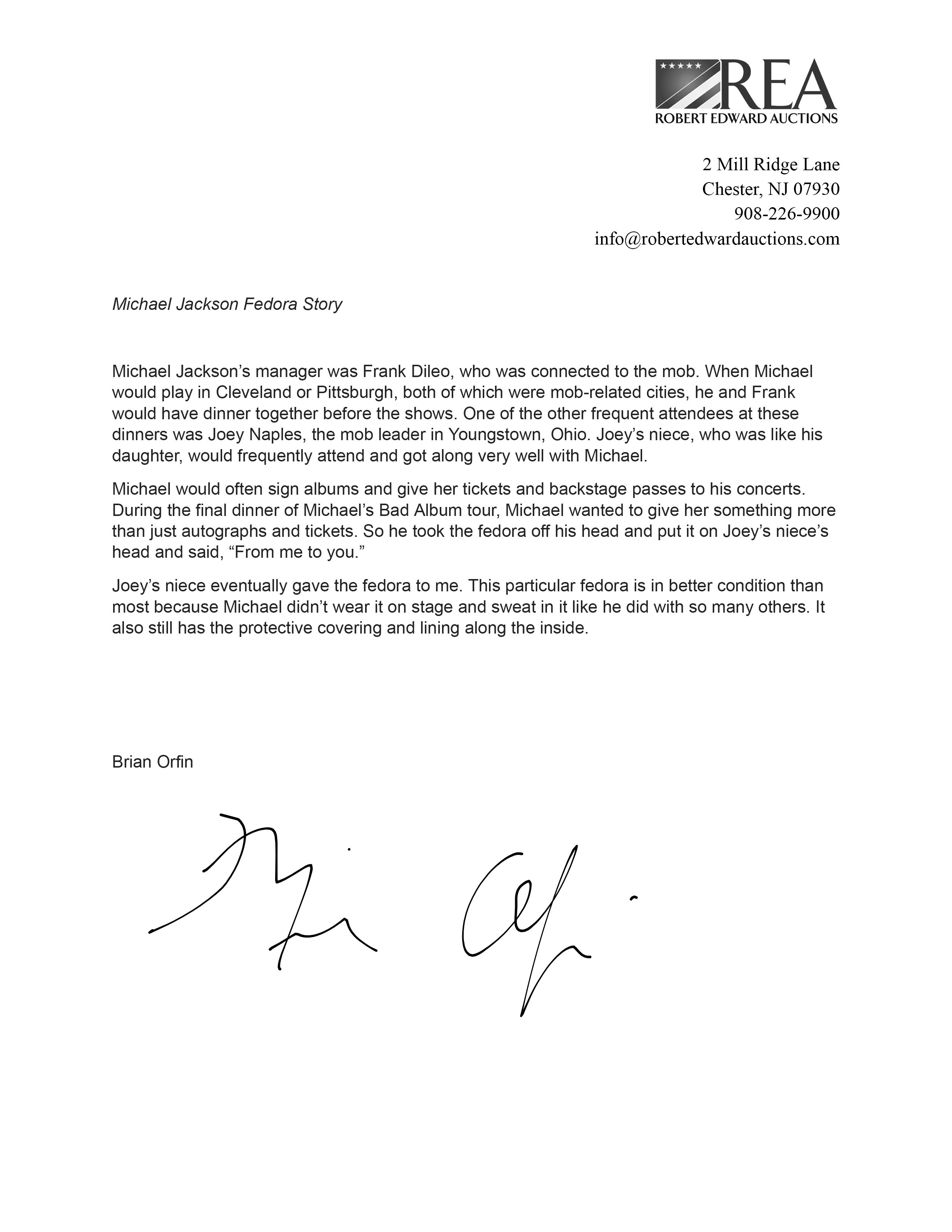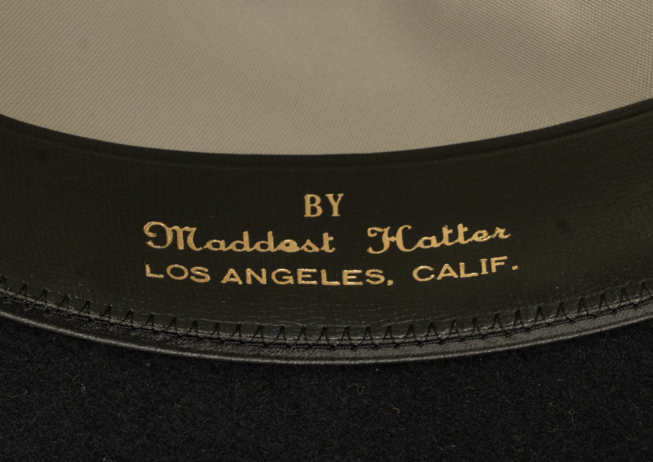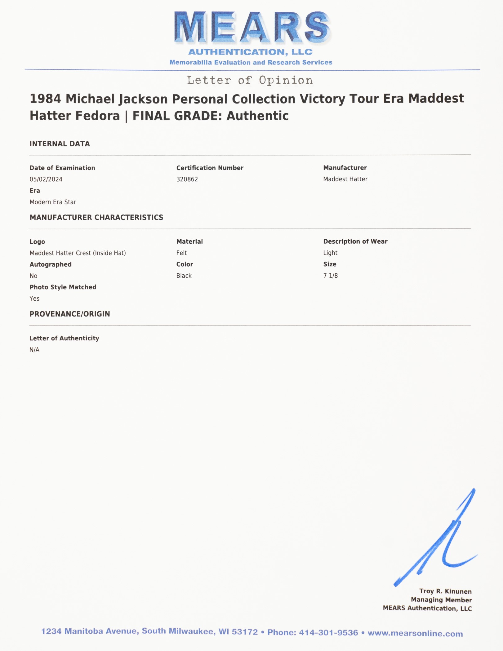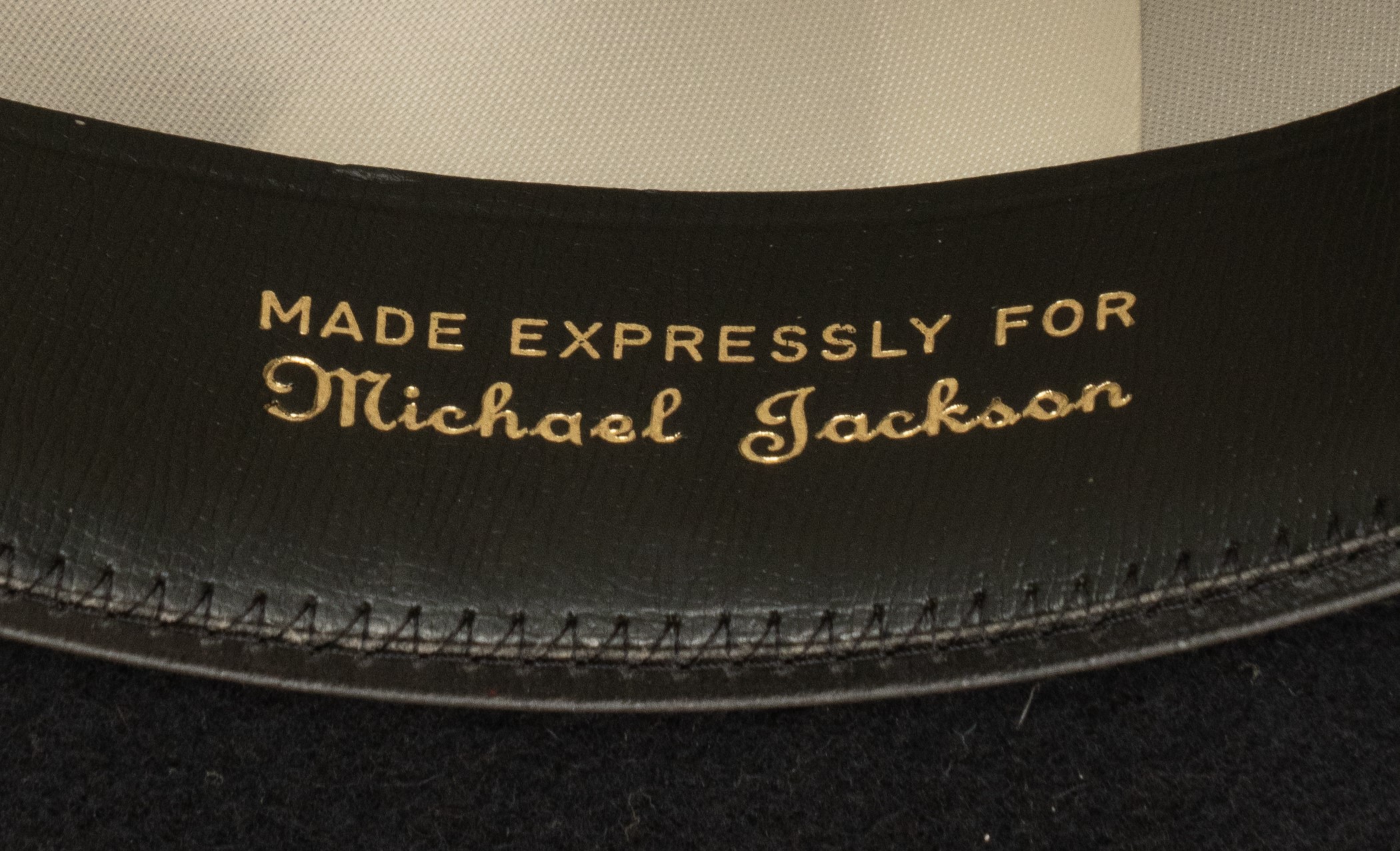 Michael Jackson will forever be the "King of Pop." Offered here is one of Jackson's signature black fedoras, specially crafted for him during his 1984 Victory Tour by the Maddest Hatter of Los Angeles, California. The wool hat, size "7-1/8", features a black belt with a gold buckle along the exterior and a leather head band. Both Jackson's name and the name of the manufacturer are stamped in gold on the interior leather band, "Made Expressly For / Michael Jackson - By Maddest Hatter / Los Angeles, Calif." The interior has a white liner with the company's logo and name printed in the center, as well as a small white bow attached to the leather head band. Michael Jackson began wearing his iconic black fedora in the early 1980s, and continued throughout his daily life until his passing. The hat displays light wear and is in Near Mint condition overall. Full LOA from MEARS. The size/weight of this item requires that there will be an additional shipping charge for this lot. Opening Bid $1,000.