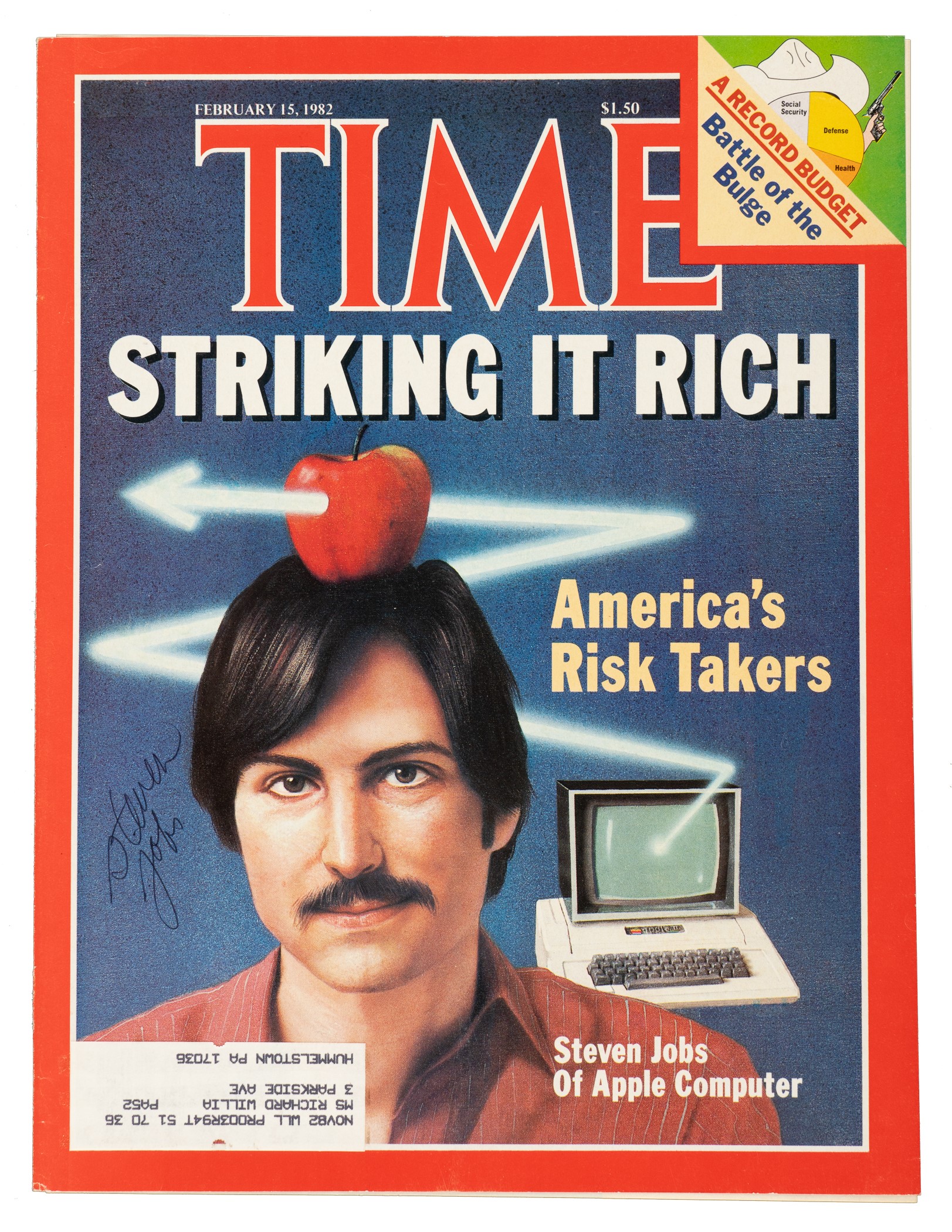 Front cover of the February 15, 1982, issue of Time magazine, signed by Steve Jobs, the visionary co-founder of Apple Inc. Jobs has boldly scripted his signature in black ballpoint pen next to his image. Examples of Jobs' signature are extremely rare as he was known to decline almost every autograph request. A youthful Jobs is pictured next to the Apple II, the device that pushed Apple to the forefront in the personal computer space. The magazine's cover story "Striking It Rich: A new breed of risk takers is betting on the high-technology future" touches on Jobs and several other tech innovators who were making significant headway in the tech industry at the time. On Jobs, the article states "Steven Jobs, 26, the co-founder of five-year-old Apple Computer, practically singlehanded created the personal computer industry. This college dropout is now worth $149 million." The magazine cover (8-1/4 x 11 inches) displays an intact mailing label and light creasing; otherwise in Excellent condition overall. Accompanied by the eight-page article and a cutout of the original mailing envelope. A tremendous signed Steve Jobs piece, ideal for display. Full LOA from James Spence/JSA. Opening Bid $10,000.