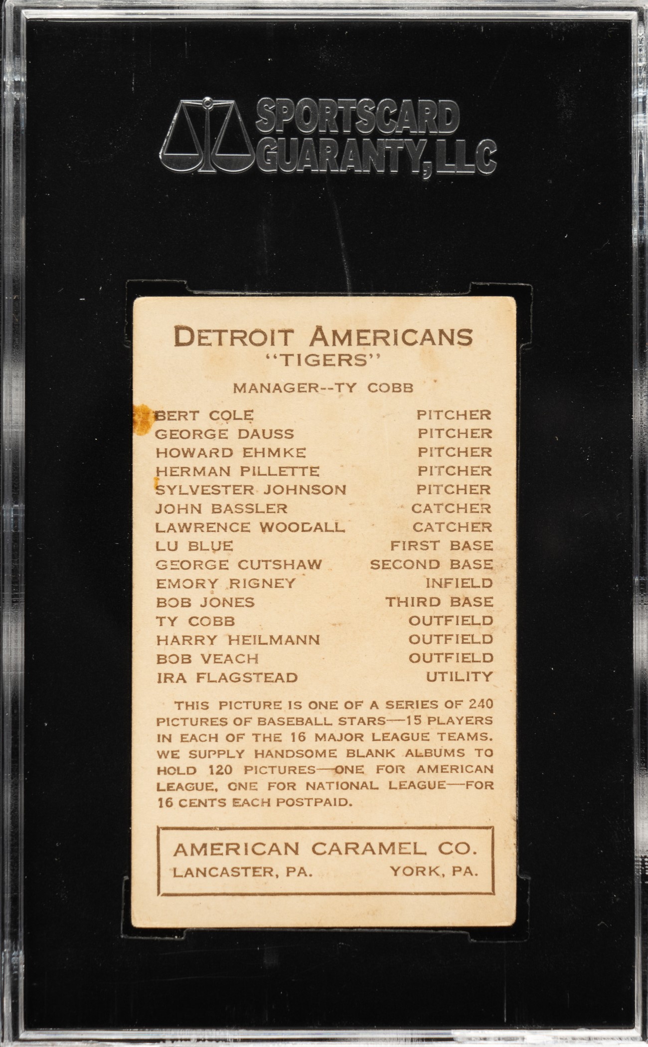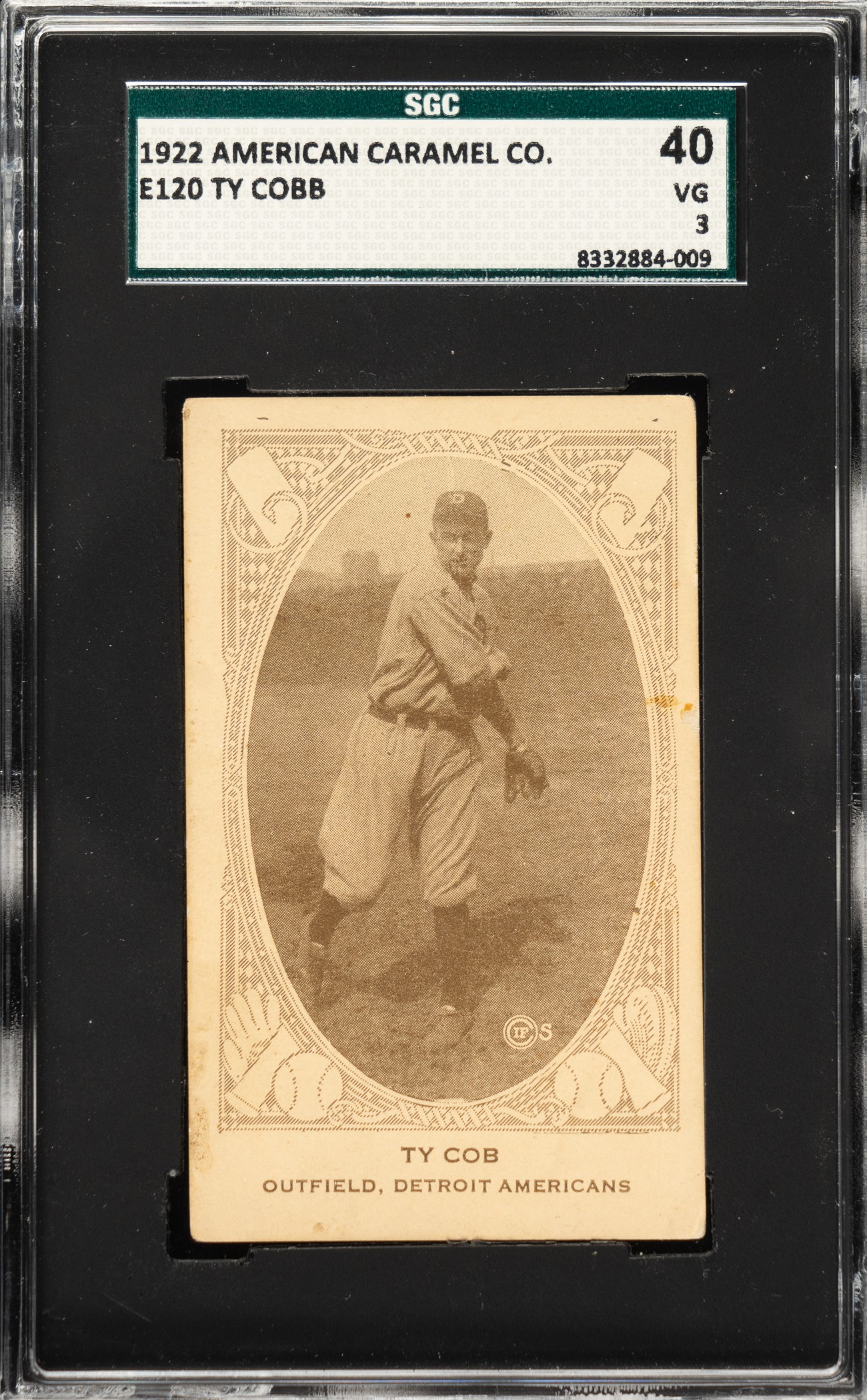 Graded VG 40 by SGC. Rarely offered E120 American Caramel of Detroit Tigers Hall of Famer Ty Cobb, one of the two key cards from this distinctive (and underrated) early 1920s caramel issue, which is of all the greater importance as the largest and most comprehensive set of the era. Cobb is featured in full uniform in a throwing pose. It is interesting to note that Cobb's name is misspelled as "Cob" on this card. In 1922 Cobb stepped up to the plate 526 times and batted an extraordinary .401, second only to George Sisler (.420 average). The offered card displays a crisp image and honest corner wear. A spot of paper loss along the right edge on the front and a spot of staining along the left edge on the reverse factor into the assigned grade. This is an attractive mid-grade example of Cobb from a classic 1920s set issued during one of his greatest hitting seasons. Opening Bid $1,000.