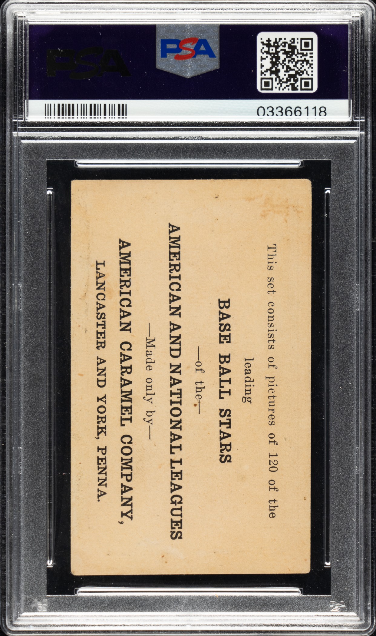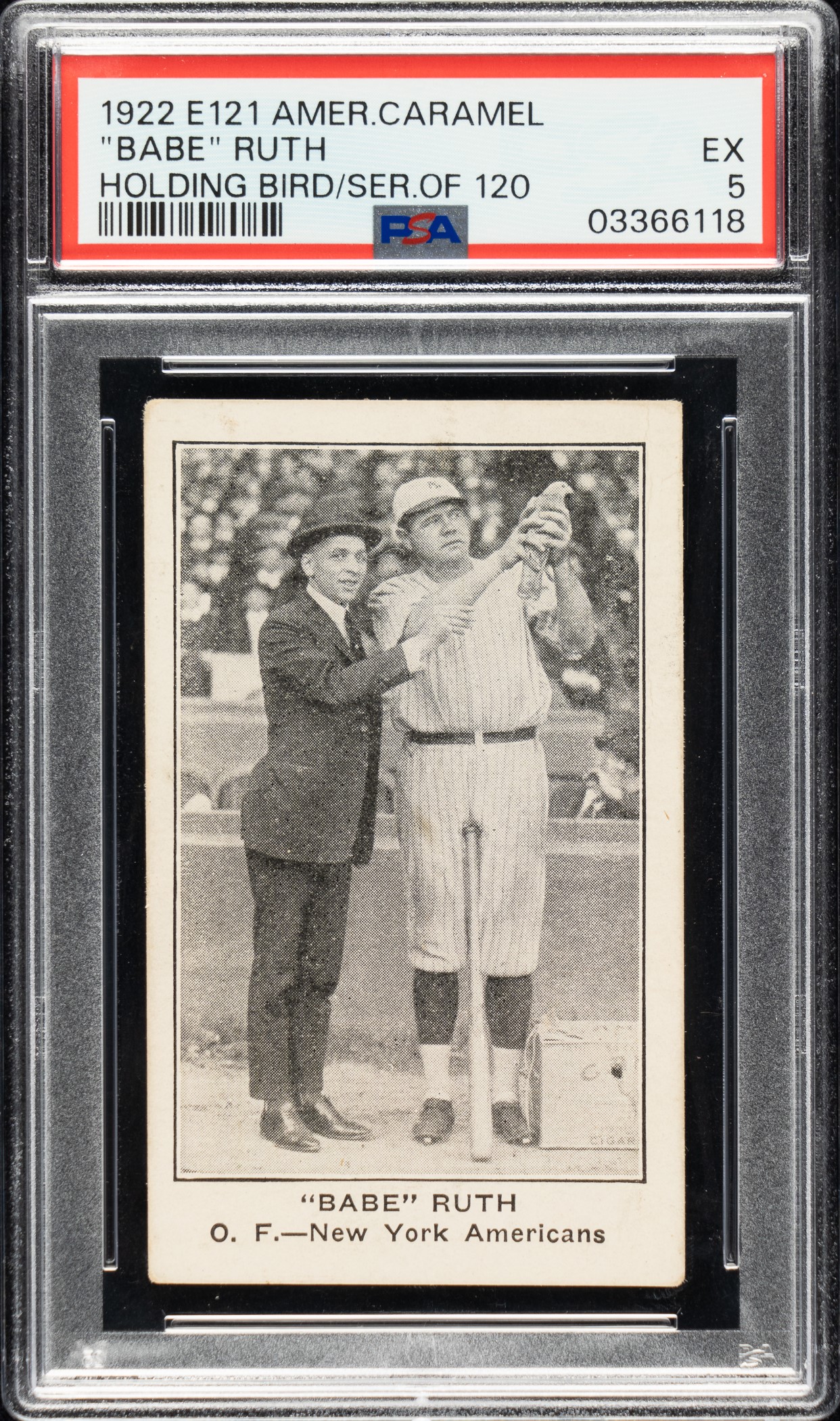 Graded EX 5 by PSA. Outstanding E121 American Caramel card of Babe Ruth, one of several different cards of Ruth in the set, and certainly the most distinct and memorable. This card features one of the most unusual photographs of the Babe to ever appear on a card. He is pictured holding a bird, with an unidentified gentleman sharing the spotlight with him on the field to his right. For years, collectors wondered exactly what was happening in this photo, but the answer seemed forever lost. The mystery was solved courtesy of RMY Auctions, specialists in historic vintage photography. Its discovery and offering of an original news photograph of this very image with a caption attached provided the answer! In this photograph, Ruth released a carrier pigeon to relay the Cleveland vs. New York game score on September 26, 1921! The gentleman at his side is Charles Farbizo, a carrier-pigeon enthusiast, who, during this game, sent the score of the game to fans on New York's East Side every inning (as a test for use during the upcoming World Series). In the photo, Ruth's eyes are firmly fixed on the bird, which is what we would be doing if we were holding a bird, while the gentleman's gaze is toward the camera. The box at Ruth's feet is very likely the bird's carrying case. This is a fascinating card with a unique story. The offered card exhibits exceptional image clarity and light corner wear. The reverse displays bold black text and is mostly clean. This is a tremendous example of one of Babe Ruth's most interesting and unusual cards. Opening Bid $2,500.
