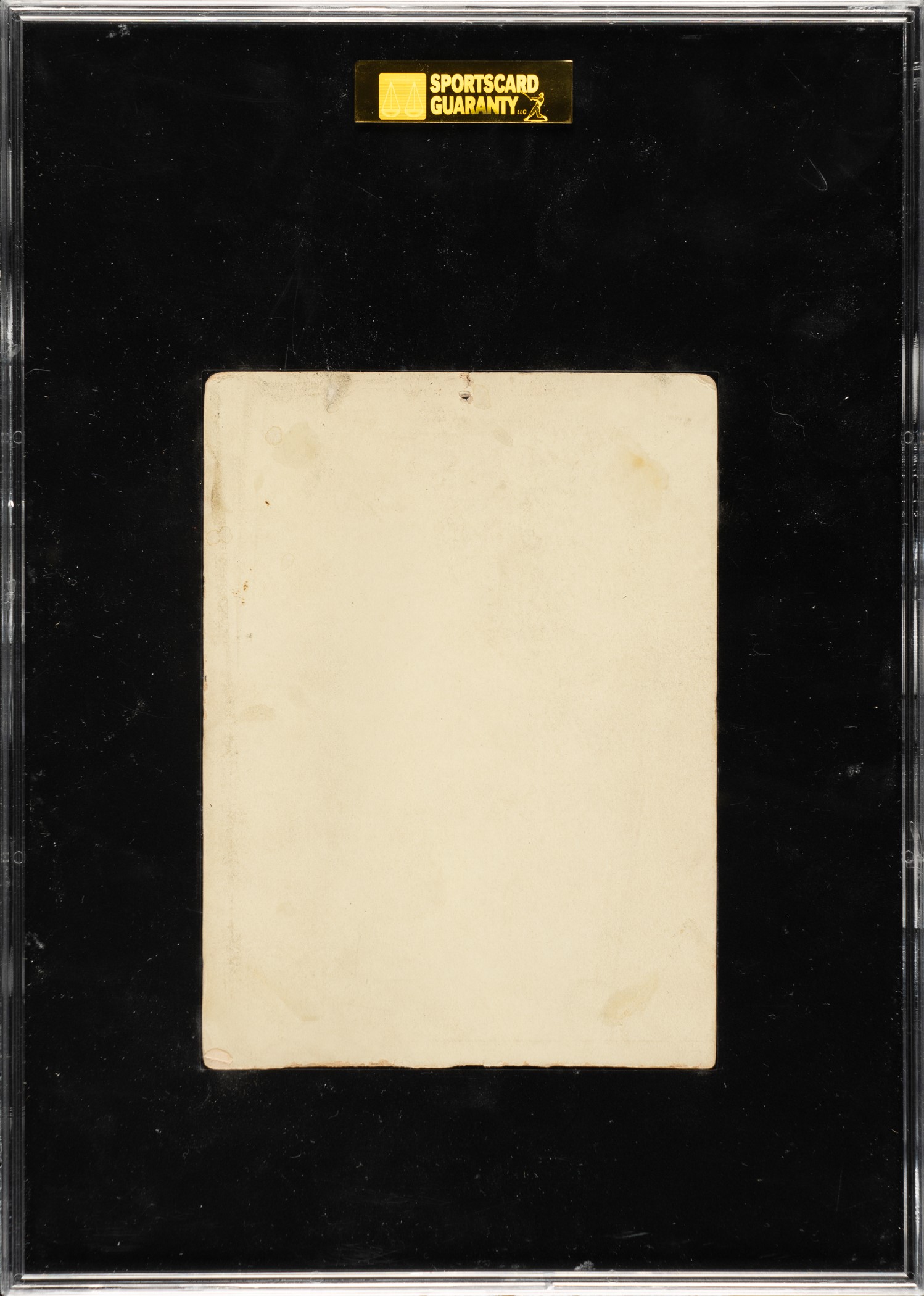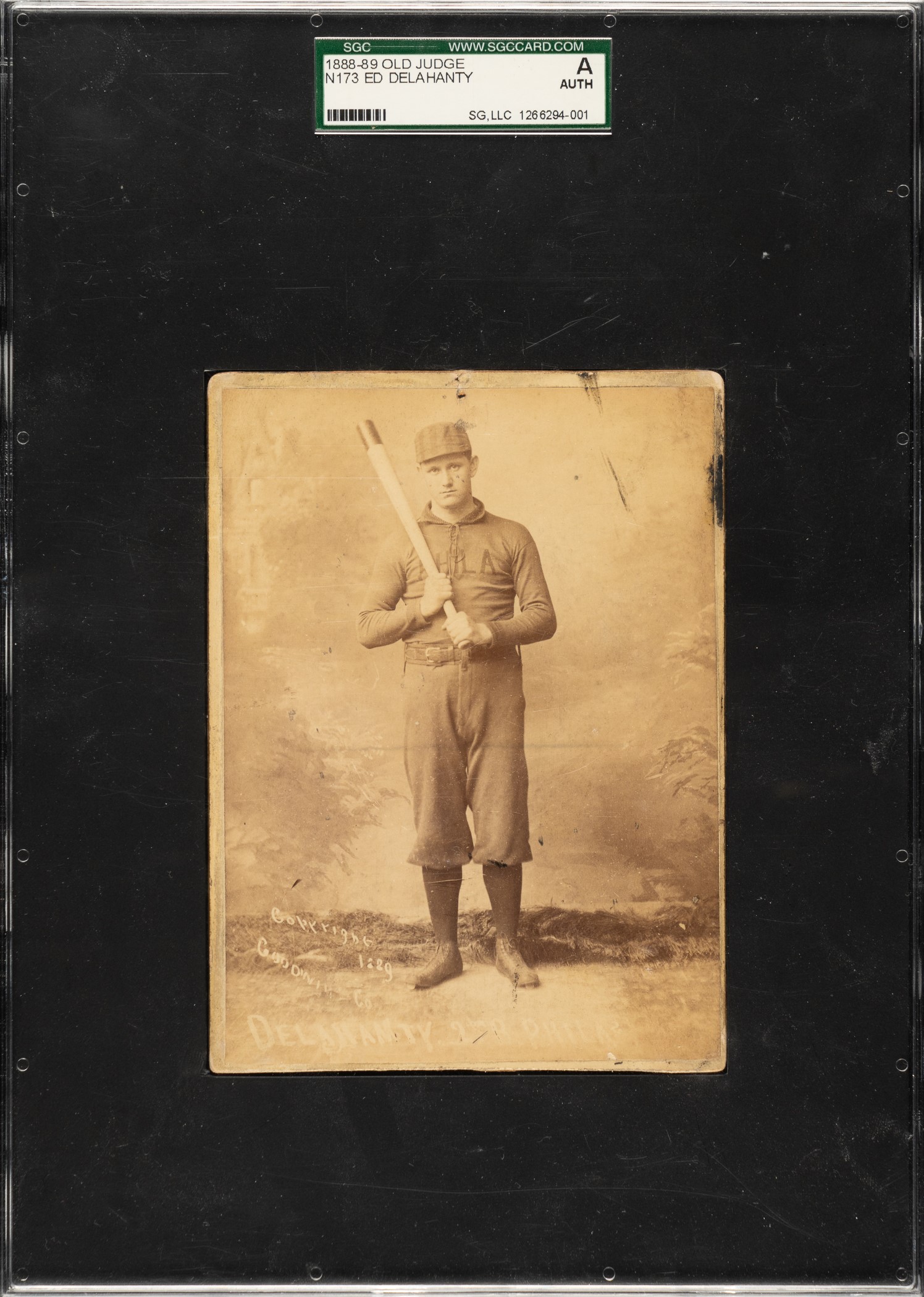 Extremely rare and desirable 1889 N173 Old Judge cabinet card of Hall of Famer Ed Delahanty (#123-1 pose) dating from his playing days as a second baseman with the Philadelphia Quakers. Delahanty is one of the rarest of all N173 Old Judge Hall of Famers. It is interesting to note that this is the first N173 of Delahanty that we have ever handled and just the second to be offered at public auction in the past 20 years (to the best of our knowledge). Only three N173 Delahanty cards have been evaluated by SGC; the offered pose, a batting pose, and the third we have not seen. While this card features Delahanty with the Philadelphia Quakers in his second year in the majors, it is the first of his few baseball cards ever issued, and as such is recognized as Delahanty's rookie card. There are very few baseball cards of Delahanty due to his untimely and tragic death in 1903 and the fact that few baseball card sets were issued during the years in which he played (1888 to 1903). Delahanty was one of the premier stars of the nineteenth century. The actual mounted photograph displays a superb image with just some minor staining and a tack hole at the top. The blank reverse reveals light soiling. This particular example is encapsulated as Authentic by SGC due to being trimmed along the bottom (advertisement cut off). Despite these faults, this is still a very attractive card of one of the key nineteenth-century and N173 Old Judge Hall of Famer rarities. Opening Bid $10,000.