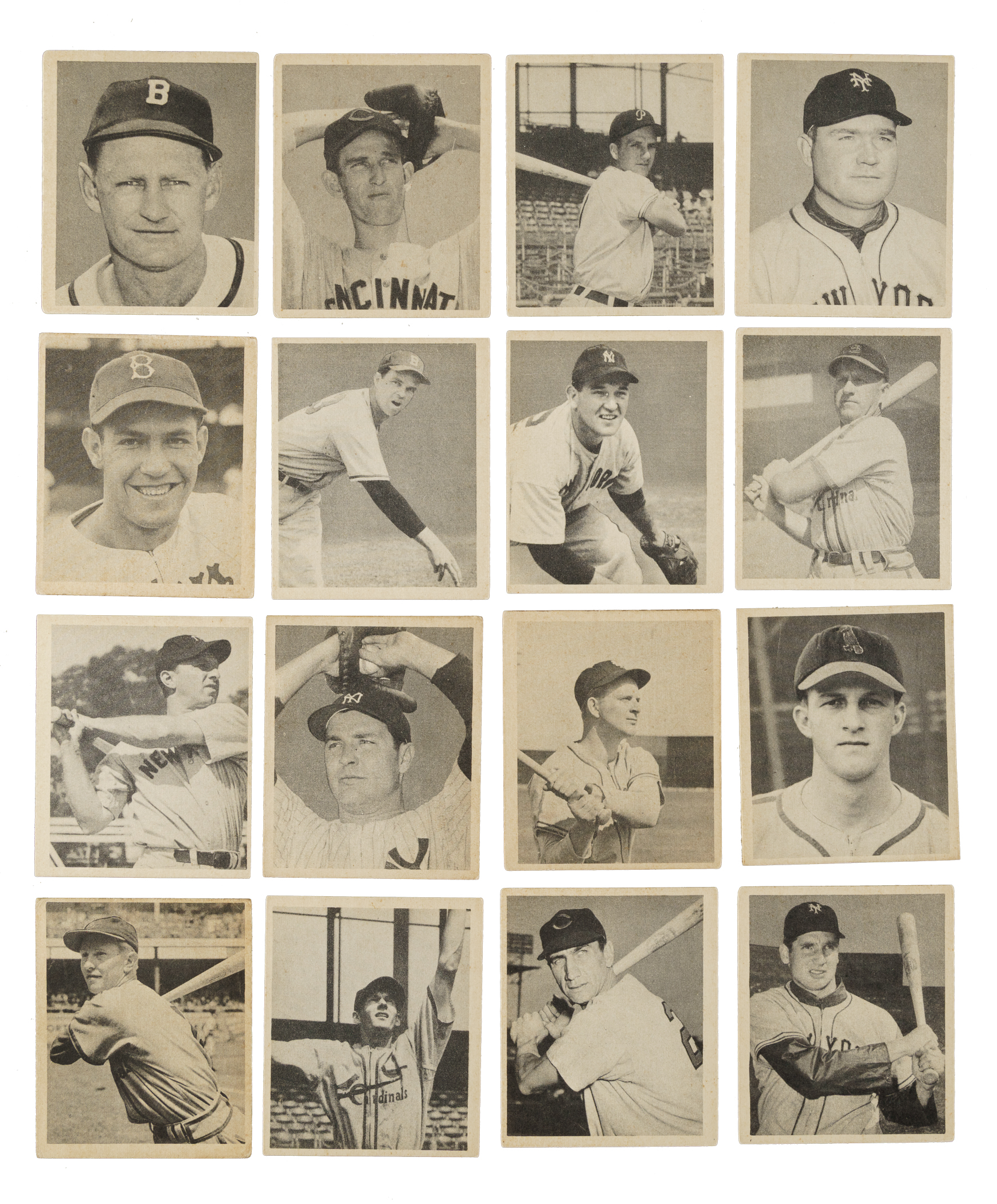 Offered is a complete set of 48 cards from the 1948 Bowman series, the first baseball-card set issued by Bowman Gum, highlighted by key rookie cards of many stars and Hall of Famers. Condition is 54% Ex to Ex-Mt (mostly Ex) and 46% Vg to Vg-Ex (including one trimmed and one Pr). Four cards are graded and encapsulated by SGC (3, submitted by REA) and PSA (1). Keys: #1 Elliott RC (Vg), 2 Blackwell (Vg+), 3 Kiner RC (Vg-Ex), 4 Mize (Ex), 5 Feller (EX 5), 6 Berra RC (PSA VG-EX 4), 7 Reiser SP (Vg+), 8 Rizzuto RC (VG/EX+ 4.5), 12 Sain RC (Ex+), 14 Reynolds RC (15/85 L/R, otherwise Ex), 17 Slaughter RC (Vg-Ex+), 18 Spahn RC (VG/EX+ 4.5), 19 Henrich (Ex due to centering), 29 Page RC (Ex), 30 Lockman SP (Ex), 36 Musial RC (trimmed, otherwise Nr/Mt), 38 Schoendienst (Vg), 40 Marion RC (Ex+), 45 Sauer RC (Ex), and 47 Thomson RC (Vg-Ex). An outstanding opportunity to acquire an extremely attractive mid-grade complete set of this landmark Bowman issue. Total: 48 cards.