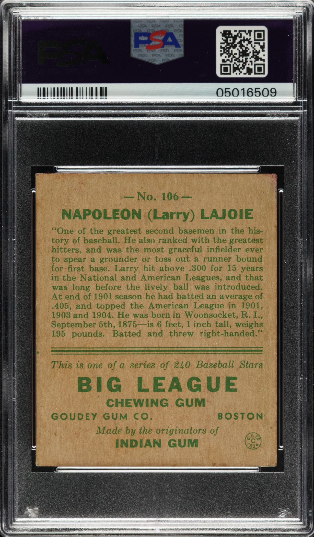 Graded EX 5 by PSA. Tremendous mid-grade example of #106 Napoleon Lajoie from the classic 1933 Goudey set. This is an extremely desirable example of this legendary rarity. This card has a striking green background, outstanding registration, light, honest wear to the corners, two tiny spots of paper loss along the top border, and just a few scattered pinpoint age spots (common to this card). The reverse has natural toning and bold green text. The 1933 Goudey #106 Lajoie, of course, was not actually printed until 1934. When the 1933 set was issued, no #106 card was produced. #106 Lajoie was printed in 1934 and was available only by mail to those few dedicated collectors who took the time to write to Goudey to complain that they could not find #106 to complete their 1933 Goudey sets. The 1933 Goudey set is universally recognized as the most important of all 1930s gum-card issues. #106 Lajoie is the most significant and valuable of all 1930s cards and is widely regarded as one of the three most important of all baseball cards (the others being the famous T206 Wagner and Plank). This is an outstanding example in an extremely desirable grade that would be a worthy addition to any high-quality 1933 Goudey complete set or world-class collection of important cards.