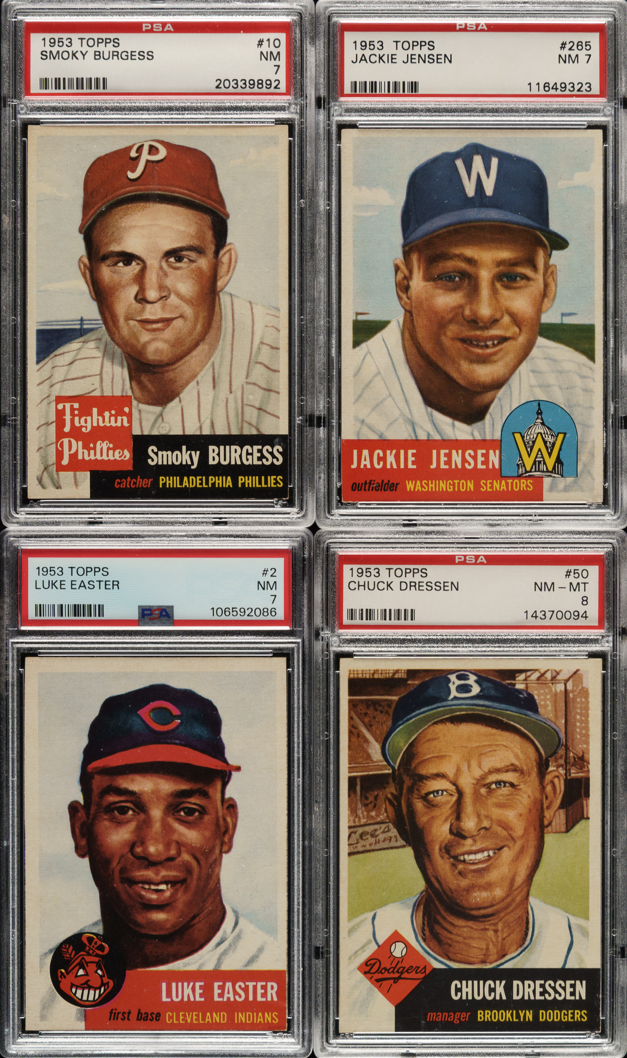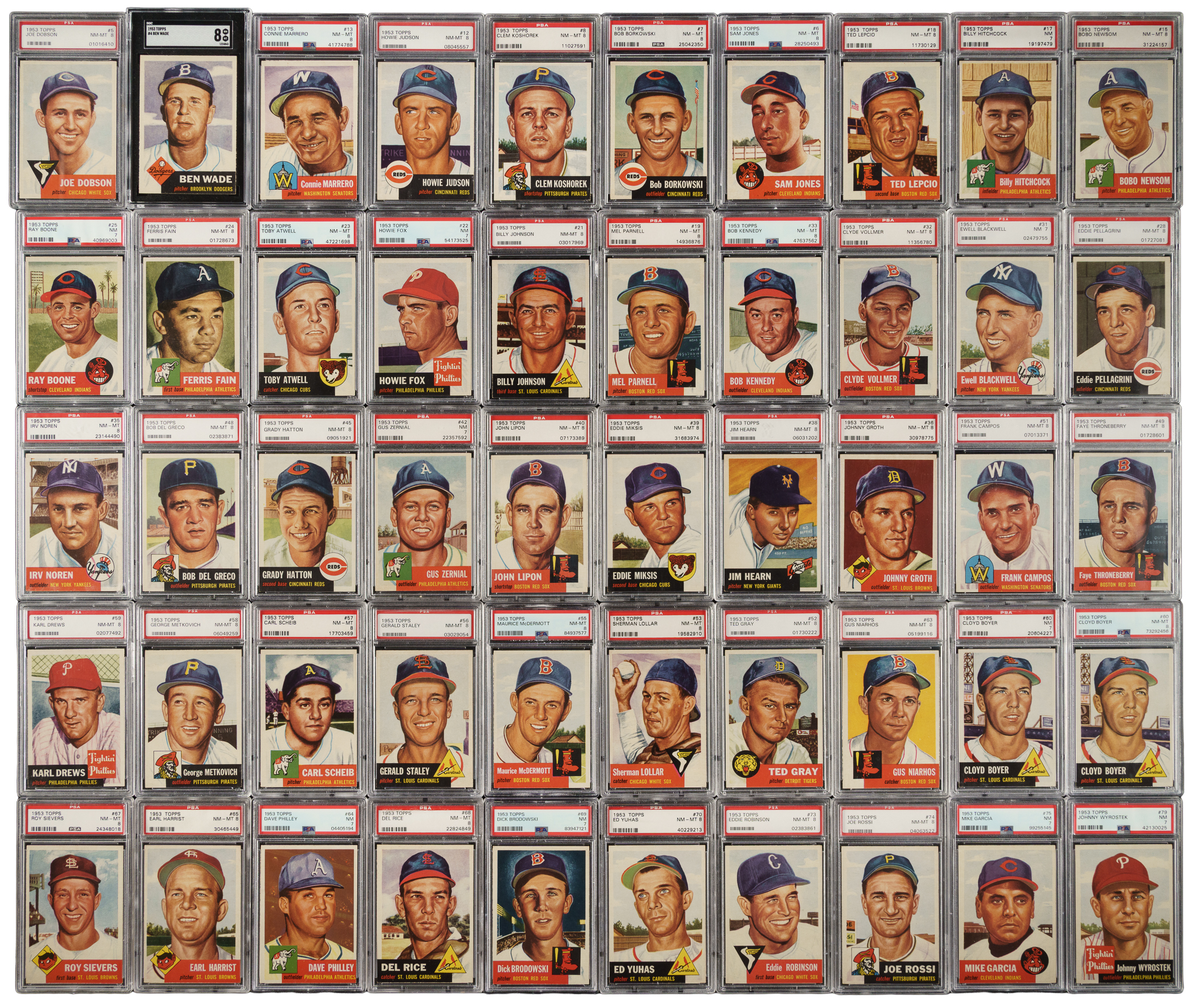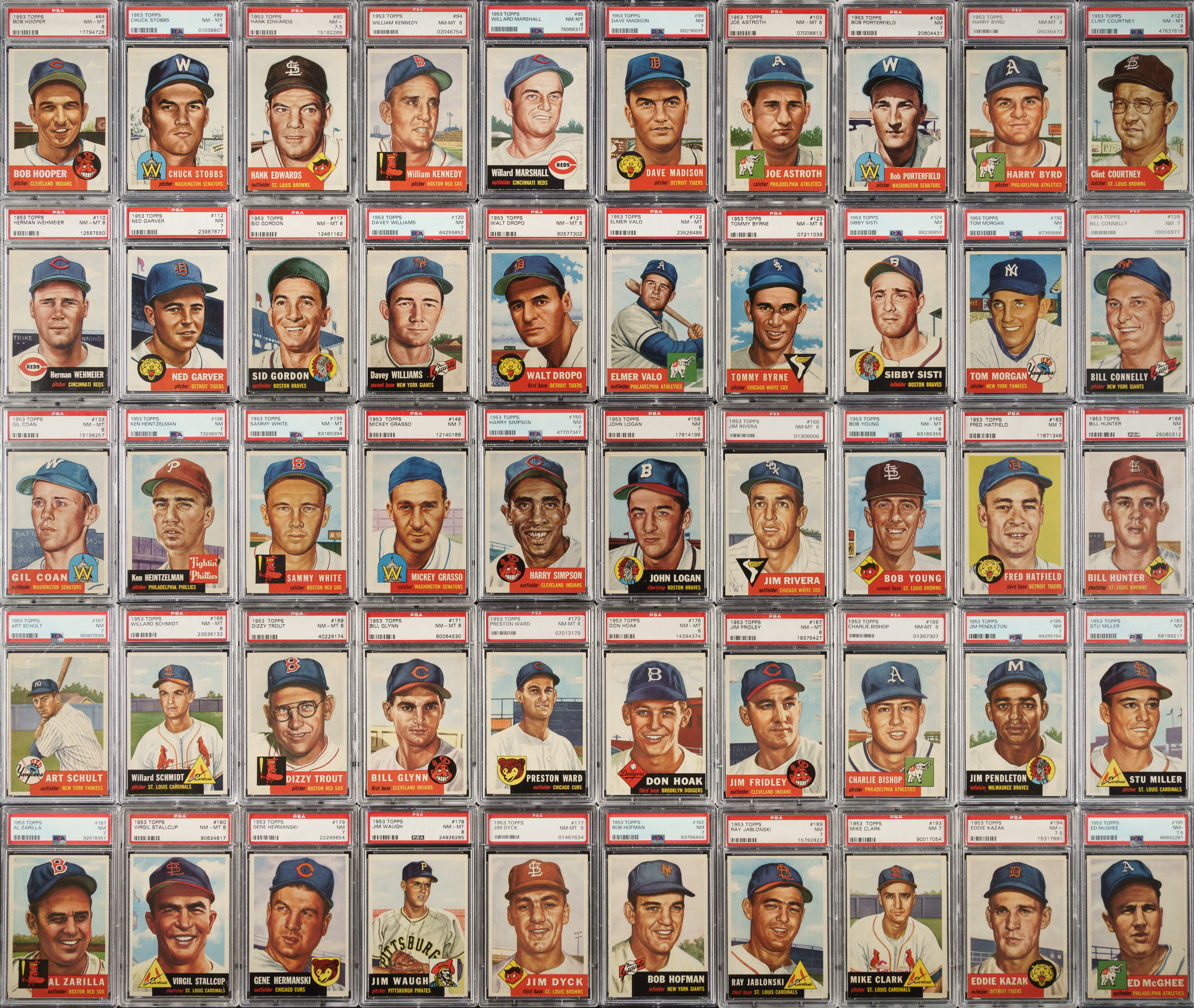 Outstanding collection of 1953 Topps composed of 126 different cards (out of 274) plus one duplicate, each professionally graded and encapsulated by PSA (except one as noted). This group of cards (which represents 46% of a complete set) displays a crisp appearance throughout, with bold colors, strong corners, and impressive centering. 1953 Topps is universally recognized as one of the most popular and collected of all 1950s gum issues, and one of the most significant of all postwar baseball card issues. PSA Grading Composite: NM-MT 8 (78 cards): #4 (SGC), 5, 6, 7, 8, 12, 13, 15, 18, 19, 21, 23, 24, 28, 32, 33, 35, 36, 38, 39, 40, 45, 48, 49, 50, 51, 52, 53, 55, 56, 57, 58, 59, 60, 63, 65, 67, 68, 70, 73, 74, 84, 89, 94, 95, 103, 110, 117, 121, 122, 123, 127, 131, 133, 139, 156, 160, 168, 169, 171, 173, 176, 177, 178, 180, 186, 187, 197, 198, 200, 202, 204, 208, 209, 211, 227, 234, and 241. NM+ 7.5 (3 cards): #90, 194, and 195. NM 7 (46 cards): #2, 10 Burgess SP, 17, 22, 25, 31, 42, 60, 64, 69, 75, 79, 99, 108, 112, 120, 124, 126, 132, 136, 148, 150, 158, 163, 166, 167, 179, 181, 182, 183, 185, 189, 193, 196, 205, 216, 219, 224, 225, 226, 235, 247, 249, 265 Jensen SP, 270, and 279. This is an exceptional high-grade collection of 1953 Topps that would provide a tremendous foundation for the assembly of, or make excellent additions to, any world-class complete set of this popular 1950s issue. The total SMR value for this collection is $11,450. Total: 127 cards. The size/weight of this item requires that there will be an additional shipping charge for this lot.