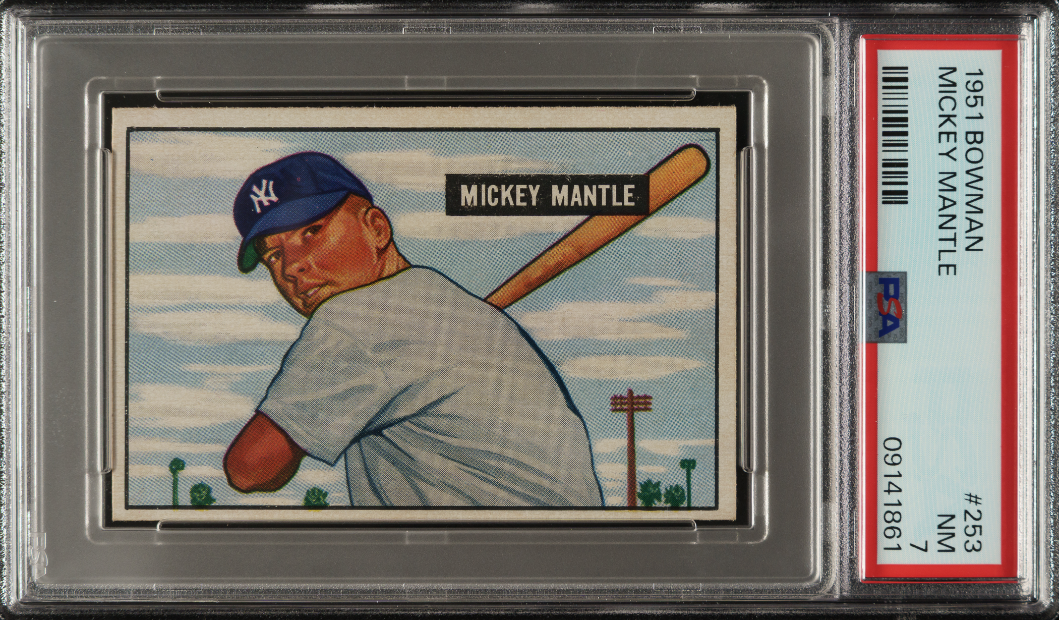 Graded NM 7 by PSA. Outstanding high-grade example of Mickey Mantle's true rookie card. One of card collecting's classics, Mantle's rookie card is the key to the 1951 Bowman set and one of the most popular and significant of all postwar baseball cards. The offered card has vibrant colors, outstanding registration, four square corners (touch weaker top right), and centering toward the bottom left. Clean reverse. High-grade examples have continued to command a premium, as a PSA 7 example sold at public auction for $109,800 in August. This 1951 Bowman Mickey Mantle presents a particularly significant collecting and investing opportunity as it is such a strong and attractive example that rarely is offered in this grade! This is a fantastic high-grade example of one of collecting's most famous cards that would be a worthy cornerstone to either a high-grade 1950s Mantle card collection or a world-class collection of classic baseball cards.