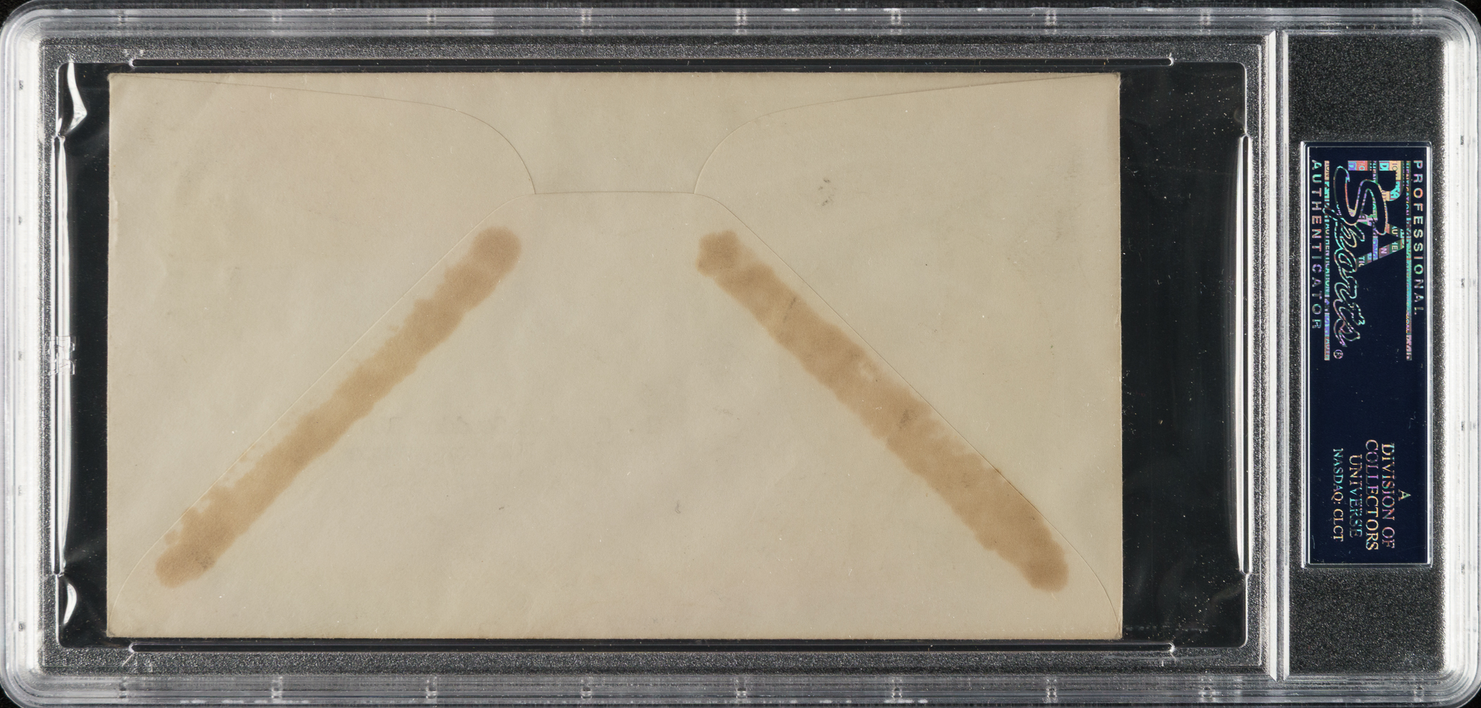 1939 Baseball Centennial first-day cover signed by Hall of Fame shortstop Honus Wagner. PSA/DNA has encapsulated the envelope and graded the signature MINT 9. The envelope bears a "Jun 13, 1939, Washington D.C." postmark and three-cent Baseball Centennial stamp. Wagner has scripted his name "J. Honus Wagner/Pirates 45" in black fountain pen along the top border. The envelope (6.5 x 3.5 inches) has a typed address and is in Excellent condition overall.