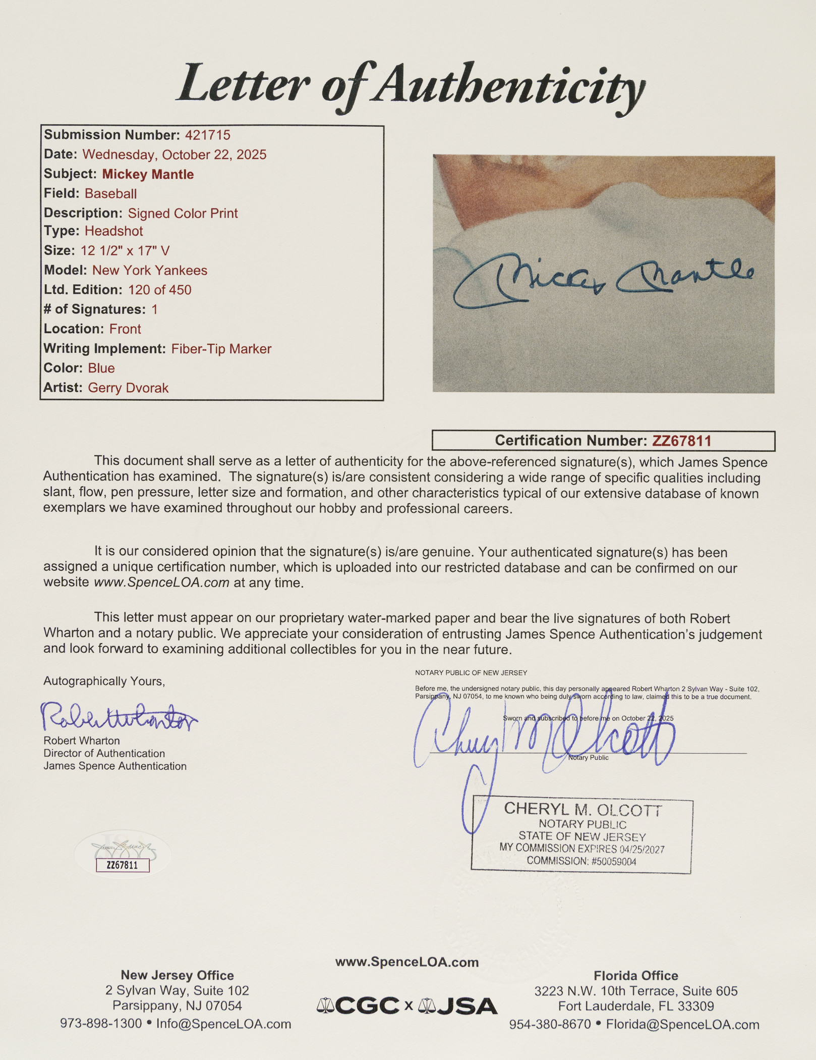 Limited-edition lithograph of Mickey Mantle’s iconic 1953 Topps card by legendary baseball-card artist Gerry Dvorak. Signed by Mantle in blue marker across his image. Dvorak, as most card collectors are aware, is highly acclaimed for his work for Topps in the early 1950s, including Mantle's 1953 Topps card. The lithograph is hand-numbered "120/450" and signed by the artist in pencil. The lithograph (12 x 17 inches; visible dimensions) is in apparent Near Mint condition overall. Matted and framed to total dimensions of 20 x 25 inches. Full LOA from James Spence/JSA. The size/weight of this item requires that there will be an additional shipping charge for this lot.