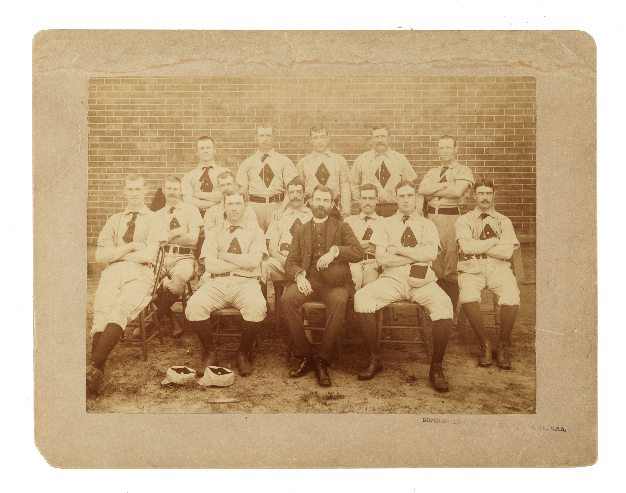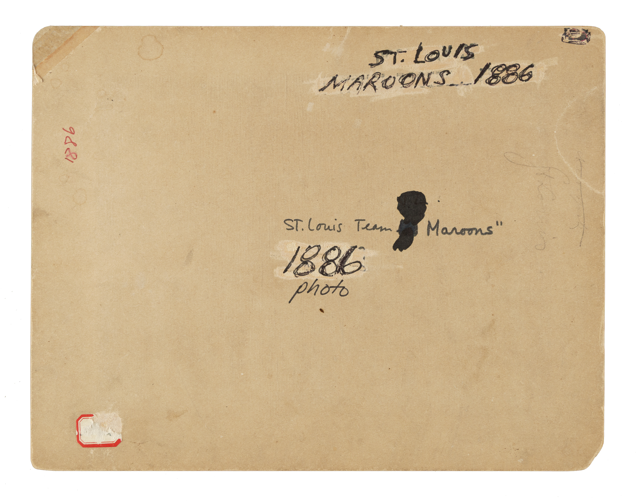 Team cabinet photo capturing of the St. Louis Maroons, circa 1886, posing together in front of a brick structure. Few team cabinet photos, of any team, date from the late 19th century! Sixteen team members are pictured, including Jack Glasscock, Fred Dunlap, Charles Sweeney, and manager Gus Schmelz. The photo (7-3/8 x 5-1/2 inches) is in Excellent condition overall. The mount (9-1/4 x 7-1/4 inches) features a faded copyright stamp below the photo, water damage along the top edge, and a repaired top-right corner. There are multiple handwritten notations on the reverse. Fair condition overall.