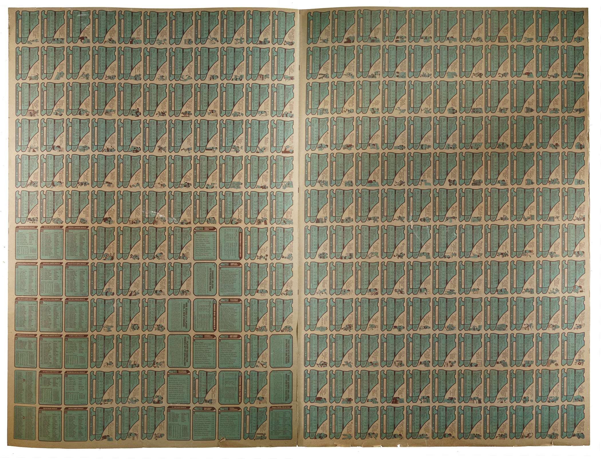 Complete set of 1979-1980 Topps hockey on one 264-card uncut final production double sheet. The 1979-1980 Topps hockey set includes the rookie card of Hall of Famer Wayne Gretzky and many other Hall of Famers including Mike Bossy, Guy Lafleur, and the final regular-issue cards of Ken Dryden, Gordie Howe, and Bobby Hull. This 264-card "Jumbo" sheet measures approximately 43 x 57 inches. Because of the large size, it is susceptible to minor imperfections. The sheet has various condition flaws such as creases, edge tears, and separation along the lower portion of the fold line. There are black ink marks on the upper-right quadrant. This sheet is extremely impressive. It could easily be cut down into two standard 132-card sheets. Assigning an overall grade to uncut sheets, especially one of this impressive size, can be extremely difficult. Many of the interior cards on this sheet would grade Near Mint or better. The important Wayne Gretzky card is clean, both front and back, with no creasing. Despite the technical flaws, this sheet has tremendous visual appeal and would be an outstanding addition to any advanced hockey, Wayne Gretzky, or uncut-sheet collection. Please note: This sheet has been stored rolled and will be shipped as such. The size/weight of this item requires that there will be an additional shipping charge for this lot.