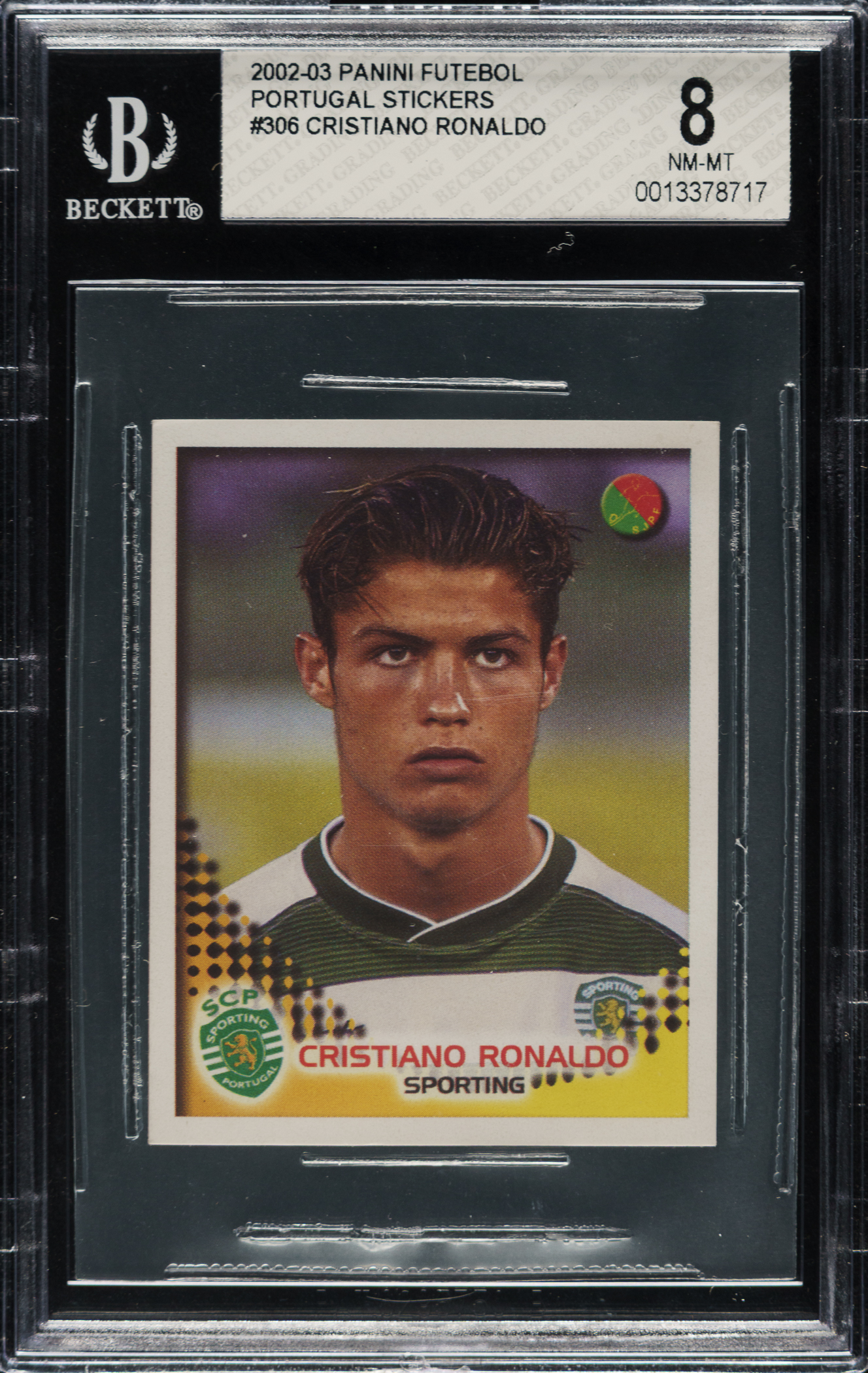 Graded NM-MT 8 by SGC. Superb example of Cristiano Ronaldo from the 2002-2003 Panini Futebol Portugal Stickers Soccer series. Not only is this one of Ronaldo's earliest cards, but it is also acknowledged as one of his few rookie cards. An outstanding example of this important soccer card.