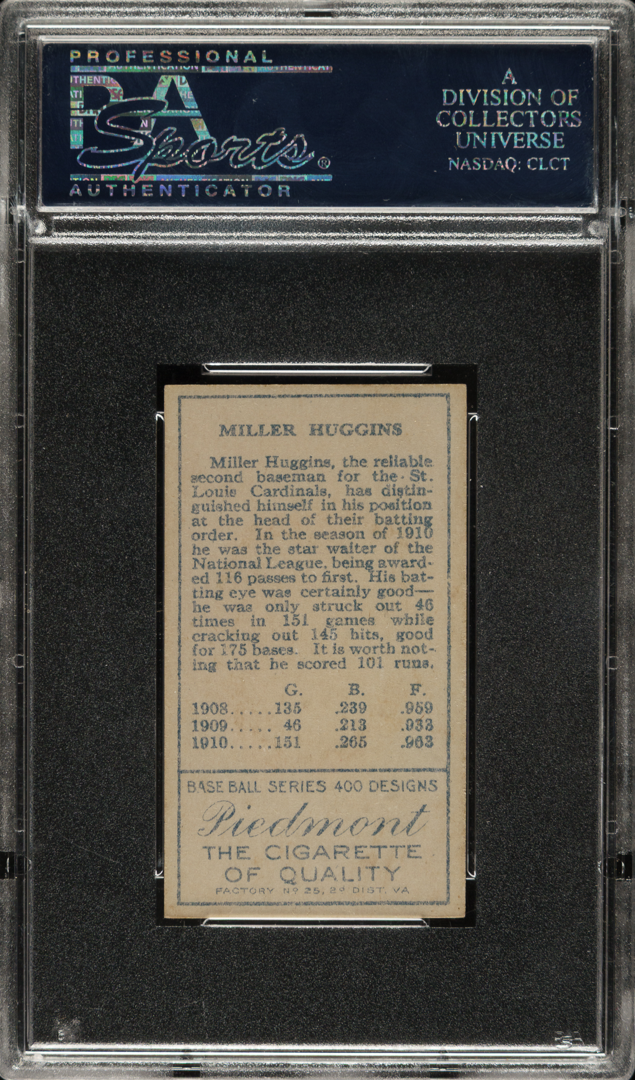 Graded NM 7 by PSA. Only two examples have been graded higher by PSA to date. Outstanding high-grade example of St. Louis Cardinals Hall of Famer Miller Huggins from the T205 Gold Border set. Any T205 Gold Border in this extraordinary condition would be extremely noteworthy, let alone an example of a Hall of Famer. This example has vibrant colors, outstanding registration, strong corners, and virtually no chipping along the delicate gold borders. Boldly printed Piedmont Cigarettes advertising reverse. A tremendous example worthy of any world-class T205 set.