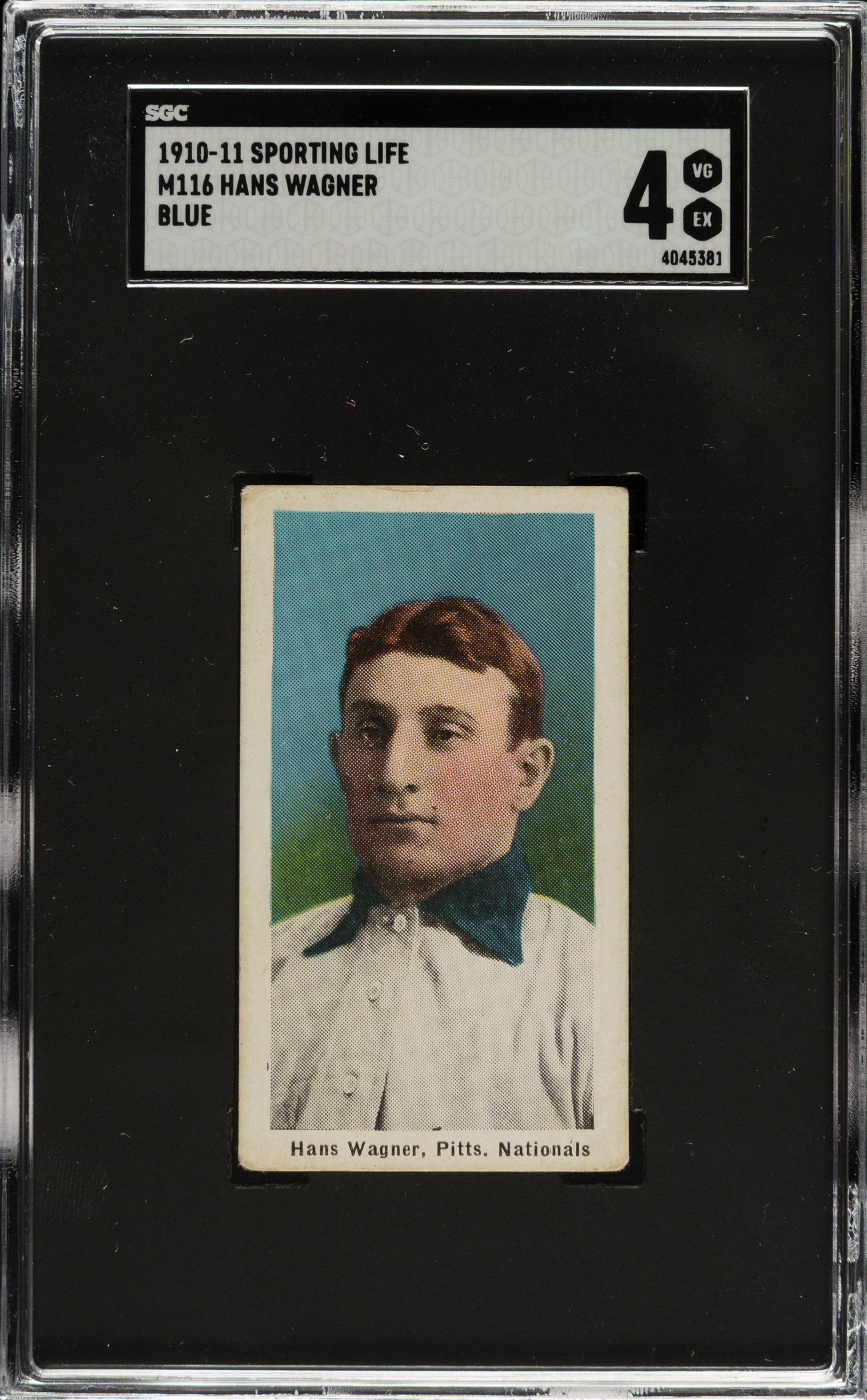 Graded VG/EX 4 by SGC. Superb mid-grade example of Pittsburgh Pirates Hall of Famer Honus Wagner from the prized "Blue Background" series of M116 Sporting Life. M116s have always been highly appreciated by collectors for their distinctive style and rarity relative to the more commonly seen tobacco cards of the era. Honus Wagner is one of the key cards of the series, and the offered example features the portrait of Wagner (which is so similar in appearance to the famous T206 Wagner and dates from the same era) set against a blue background. M116 Sporting Life cards were issued in sets of twelve cards per series, and the Blue Background cards are by far the most desirable combination of series within the entire set. These twenty-four cards were issued with both blue backgrounds and white backgrounds. The Blue Background cards have always been especially appreciated by collectors for their scarcity and distinctive style. The offered example features vibrant colors, outstanding registration, impressive centering, and even corner wear. The Sporting Life advertisement on the reverse is clean and boldly printed. This is an outstanding example of one of Wagner's most distinctive and popular portrait cards which would be a worthy addition to any M116 Sporting Life, Honus Wagner, or Hall of Fame card collection.