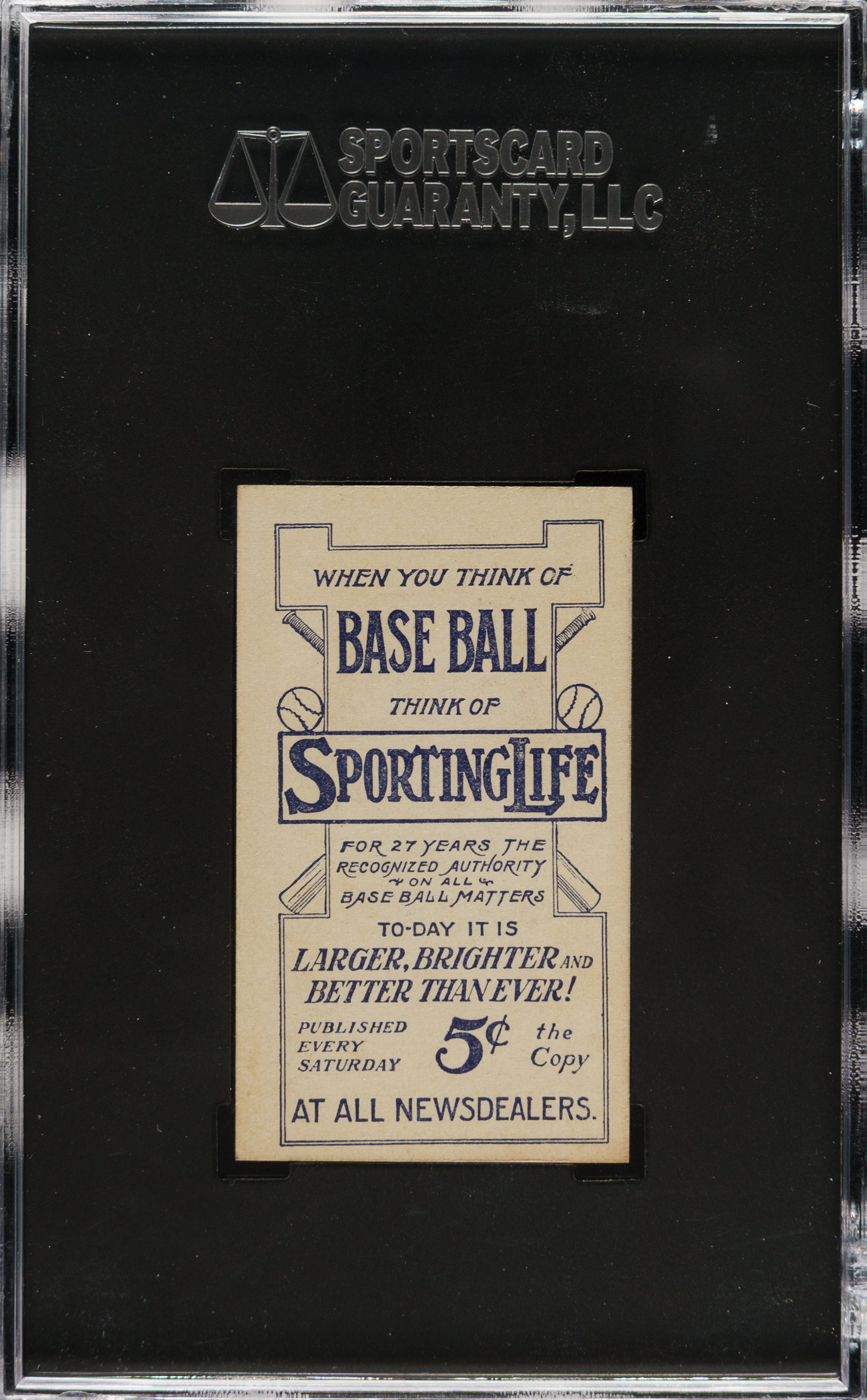 Graded NM/MT 8 by SGC. One of only three examples graded at this level by SGC with just one higher. High-grade example of New York Giants Hall of Fame pitcher Christy Mathewson from the M116 Sporting Life set, one of the most popular of all 1910-era issues. M116s have always been highly appreciated by collectors for their distinctive style and rarity relative to the more commonly seen tobacco cards of the era. Christy Mathewson is one of the key cards of the series, and the offered example features a striking portrait of Mathewson set against a pastel background. The card is perfectly clean, both front and back, with four strong corners, and flawless registration. The Sporting Life advertisement on the reverse is boldly printed. This card would be a significant addition to even the most advanced vintage card collection, and a centerpiece to any high-grade M116 Sporting Life, Christy Mathewson, or Hall of Fame card collection.